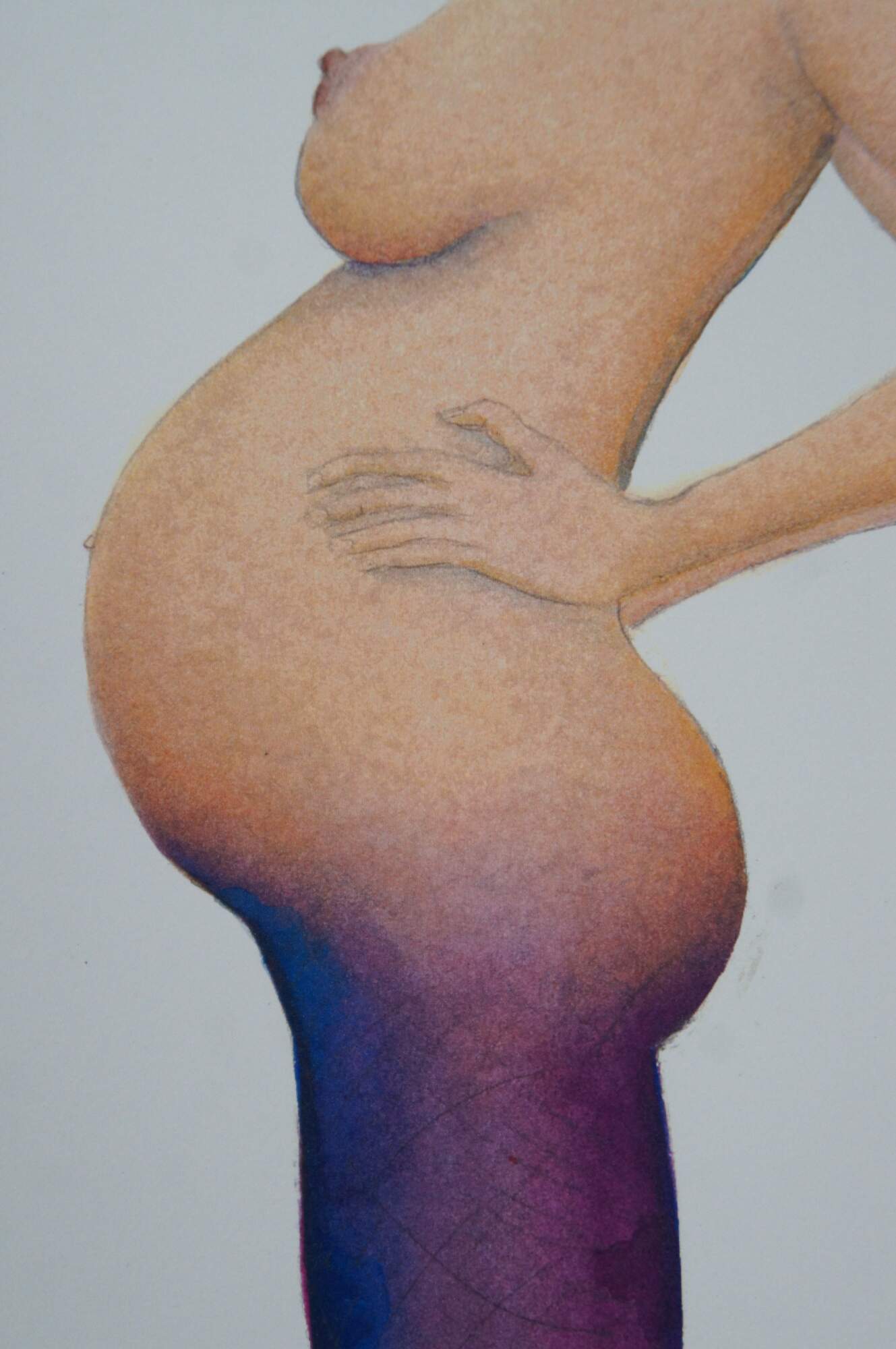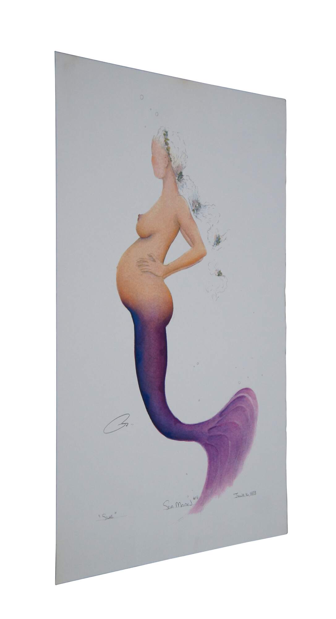 Vintage print by Robert Kline titled “Sue” – Sea Maiden #19 – fictionally dated June 16, 1833. Print shows a nude sillouette of a pregnant mermaid with white hair wrapped in seaweed and a purple tail. Part of a series of pencil and watercolor illustrations by Kline which accompany his novel “The Forgotten Voyage of the H.M.S. Baci” in which multiple generations of the Robert’s family sail the seven seas in search of and documenting the world’s mermaid, sea baby and mermen population." Print pencil signed and titled. Included are two excerpts from Kline’s novel (also initialed) one of which describes the encounter with this particular maiden.