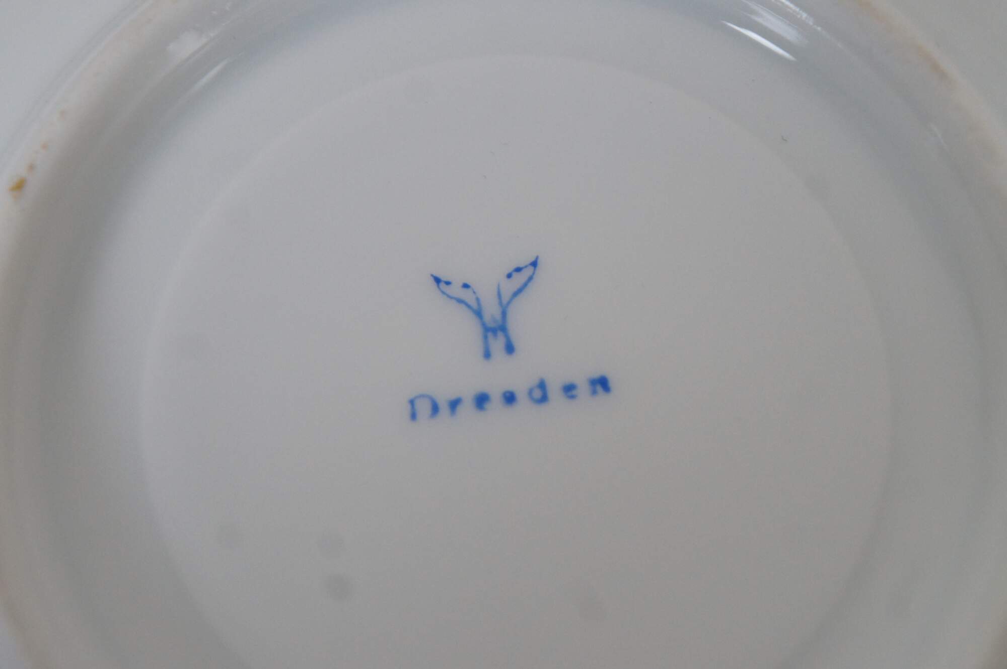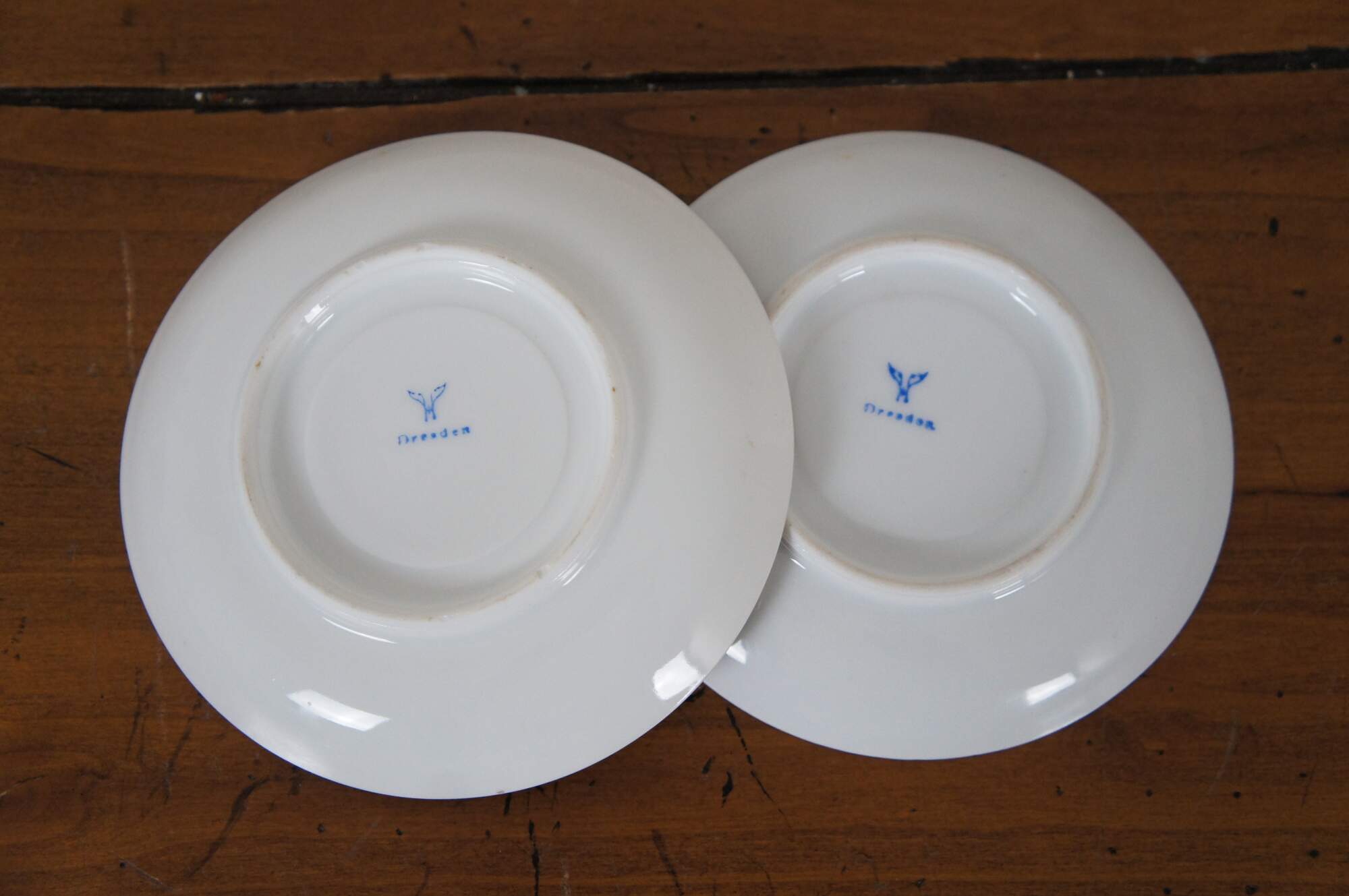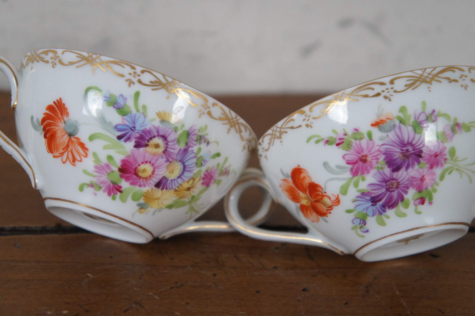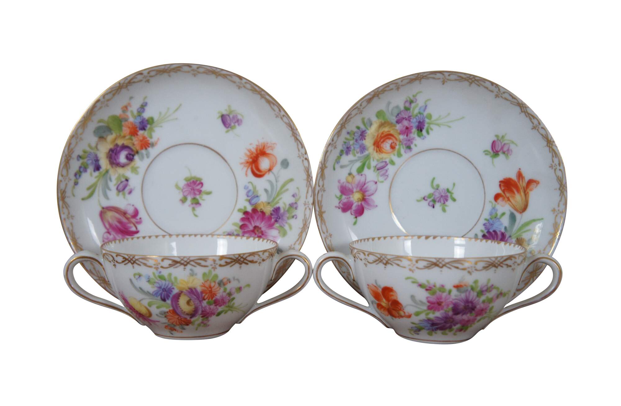 Antique Dresden Franziska Hirsch porcelain pottery bouillon bowls / cups and saucers featuring a painted floral boquet of flowers with gold accents