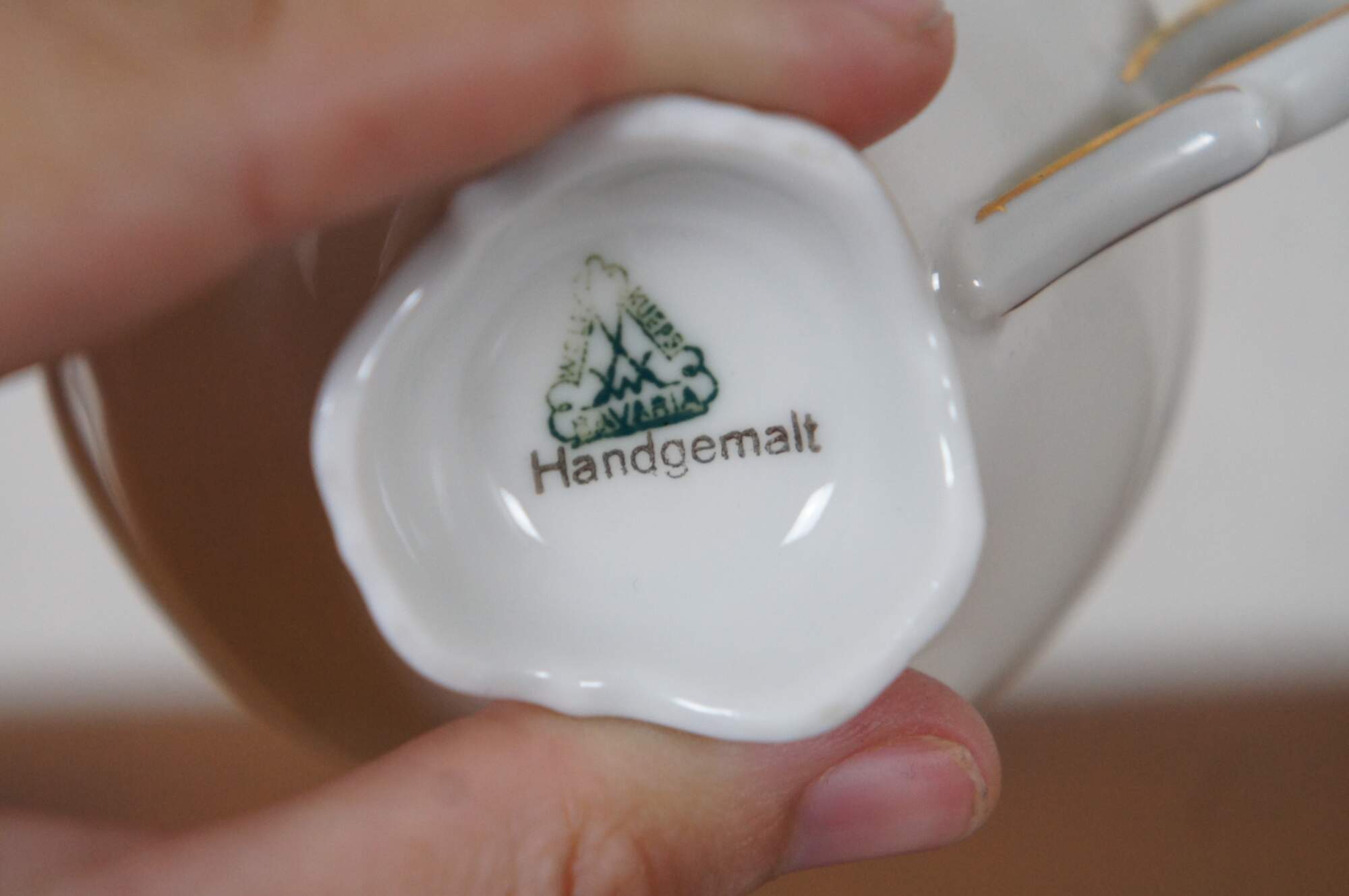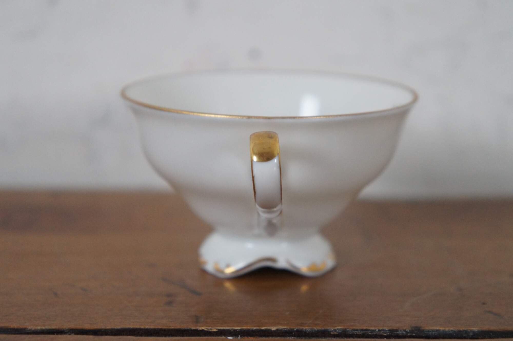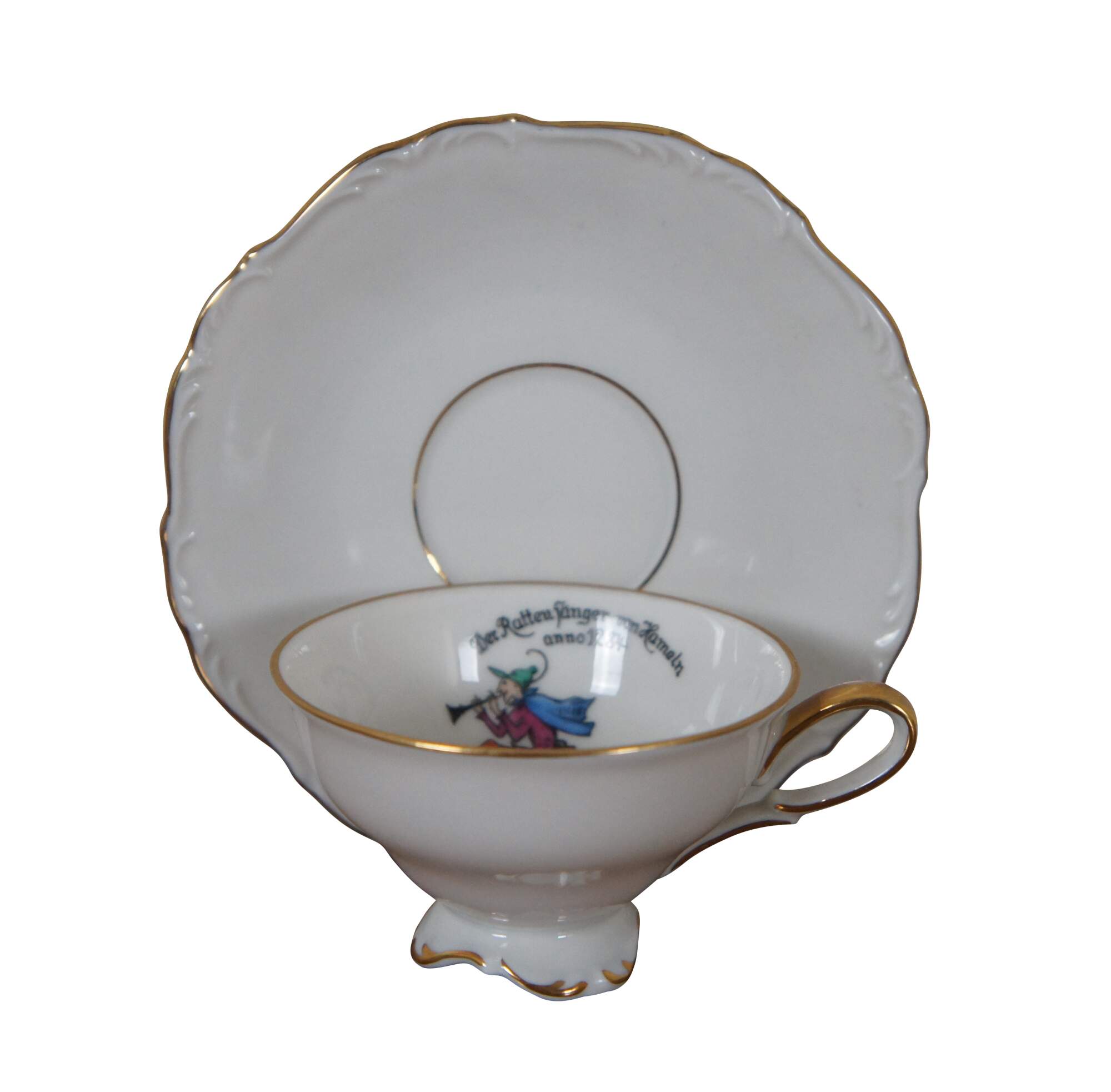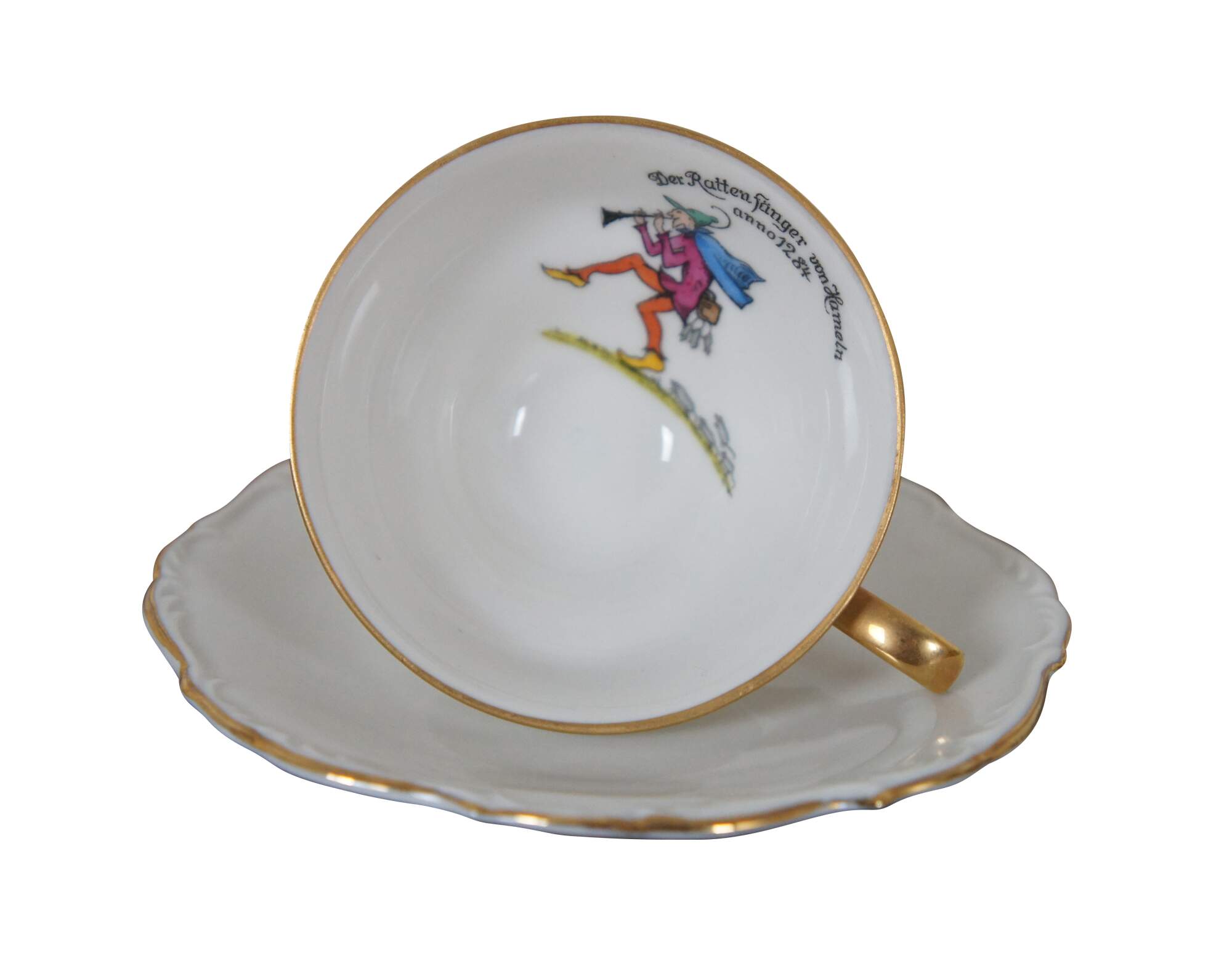 Vintage Bavarian tea cup and saucer featuring the Pied Piper playing his trumpet and luring the rats away. Footed and scalloped with gold accents.