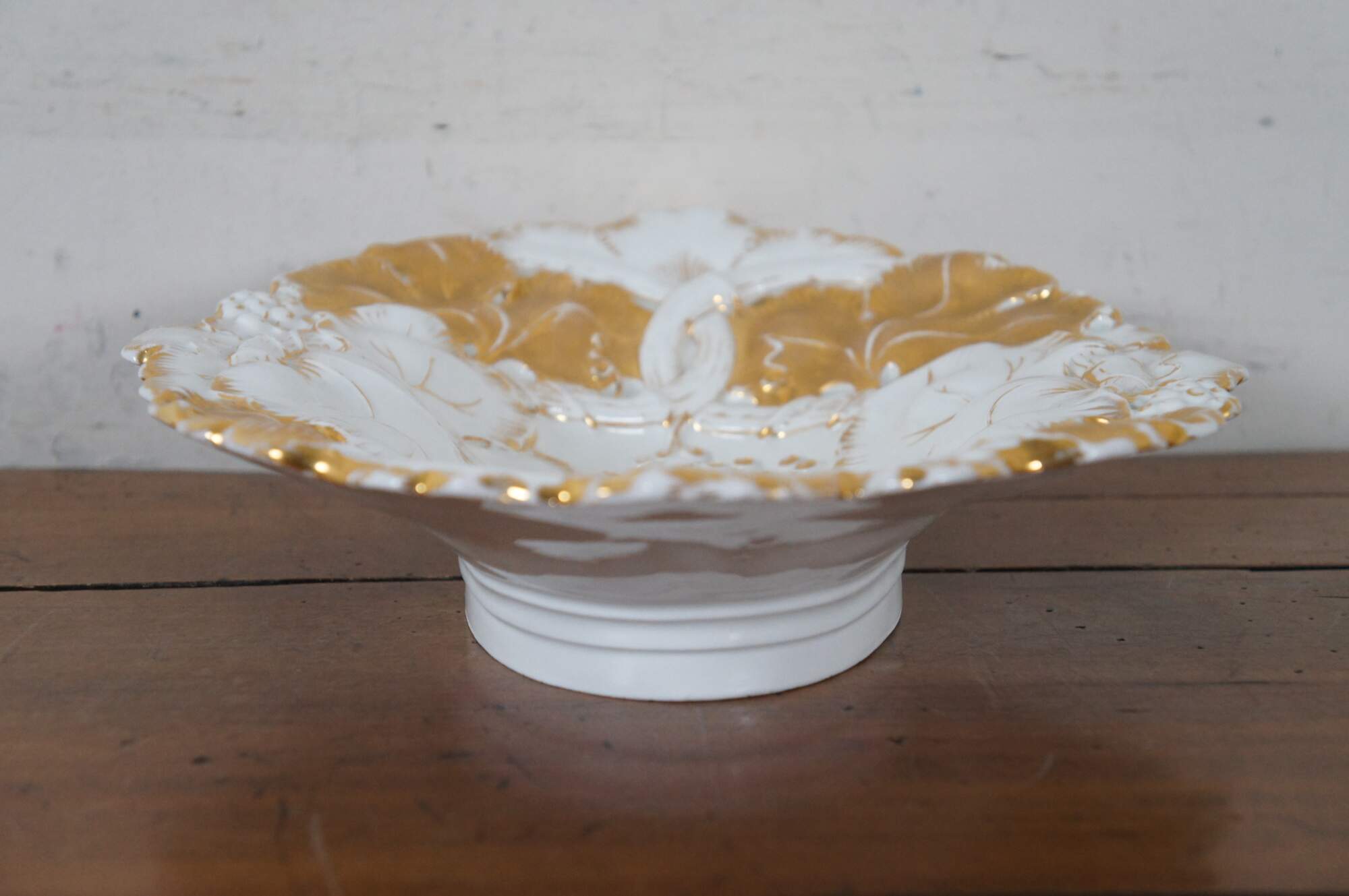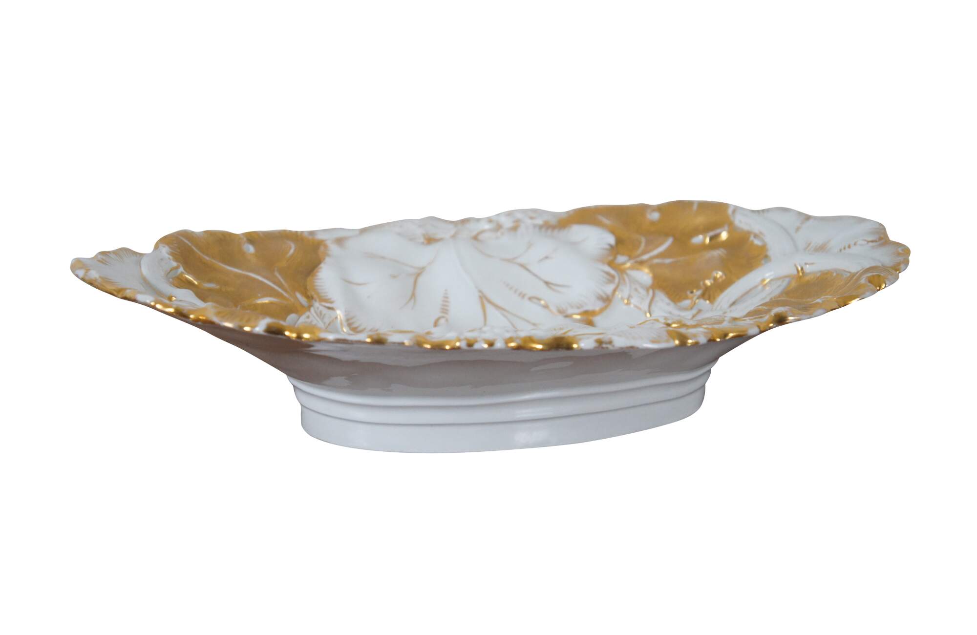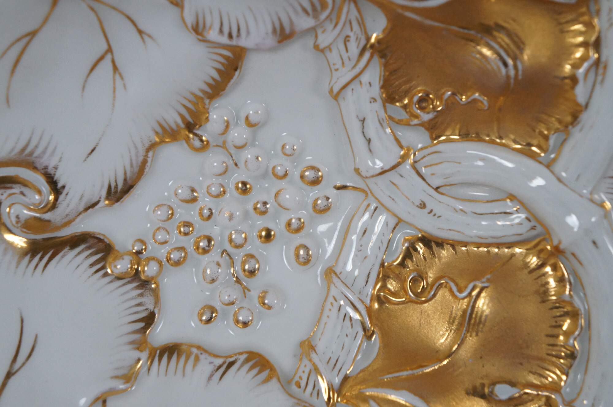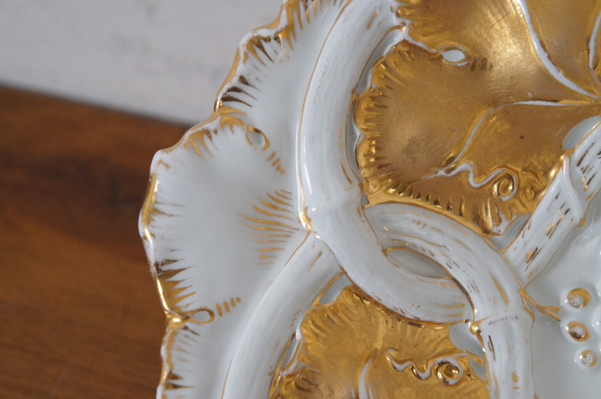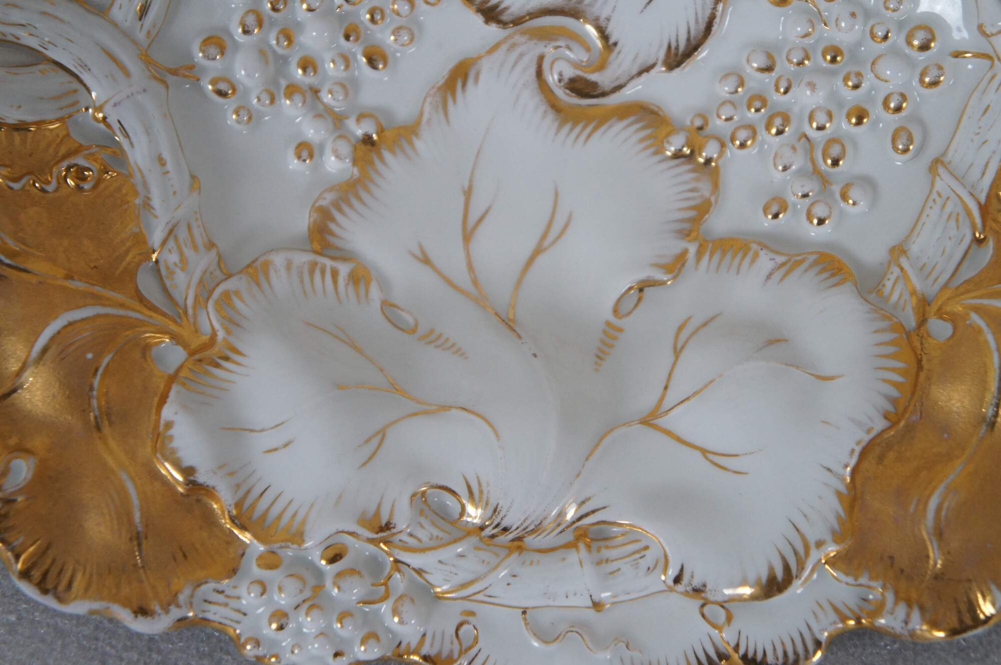 Antique Meissen porcelain footed cabinet plate / centerpiece bowl / serving platter / compote featuring scalloped oval form with low relief grapevines, grapes and leaves with gold gilded accents and footed base. 1815 to 1860 crossed swords mark.