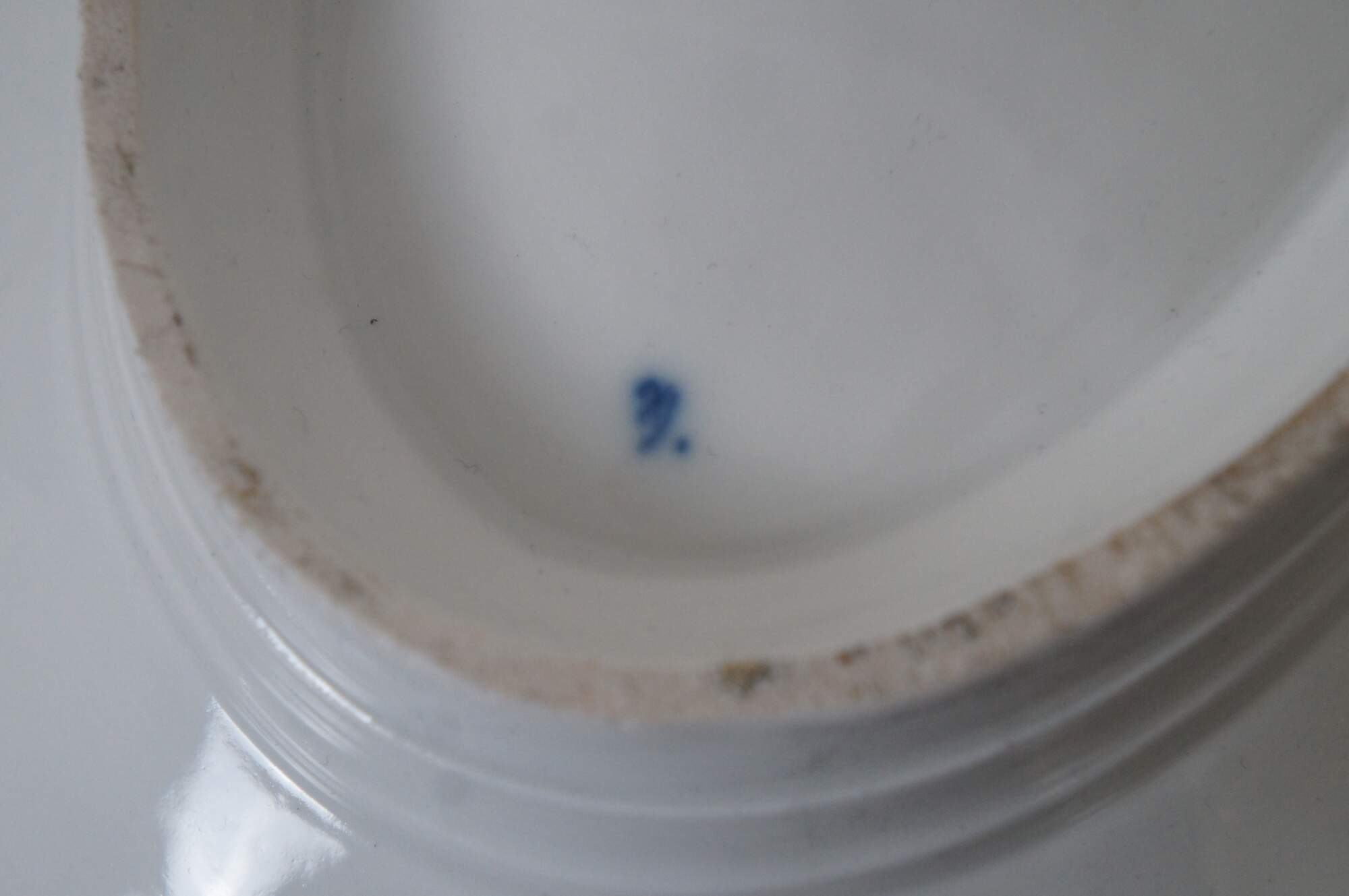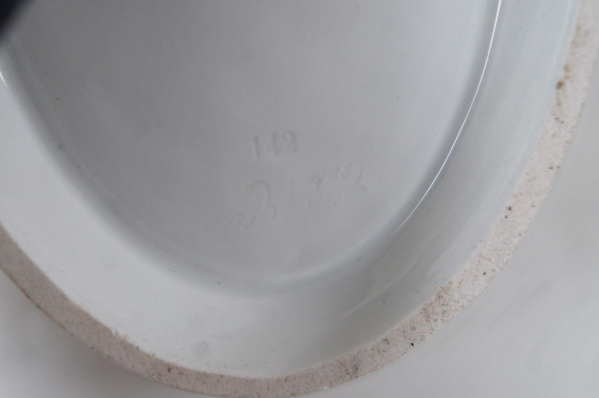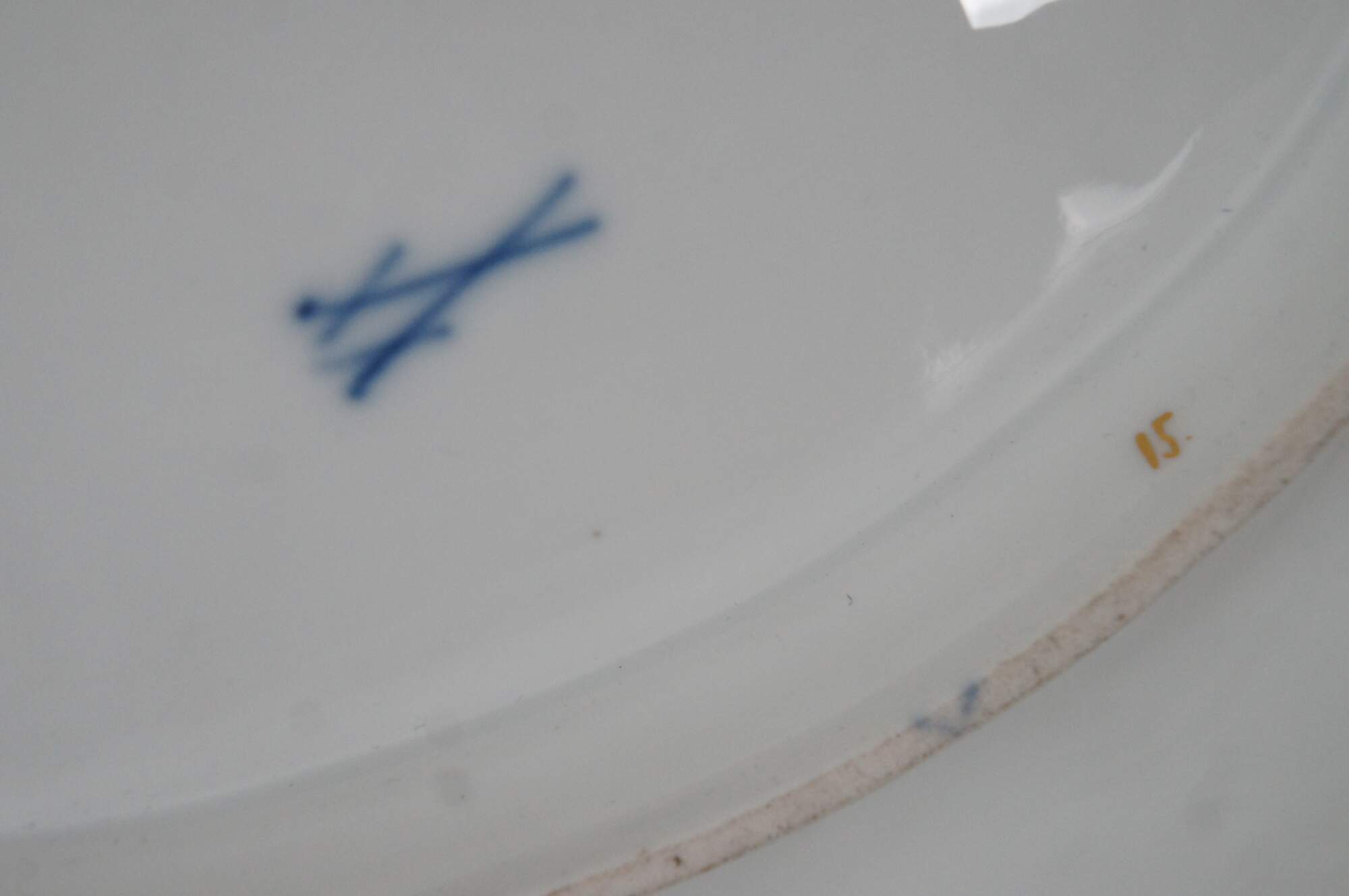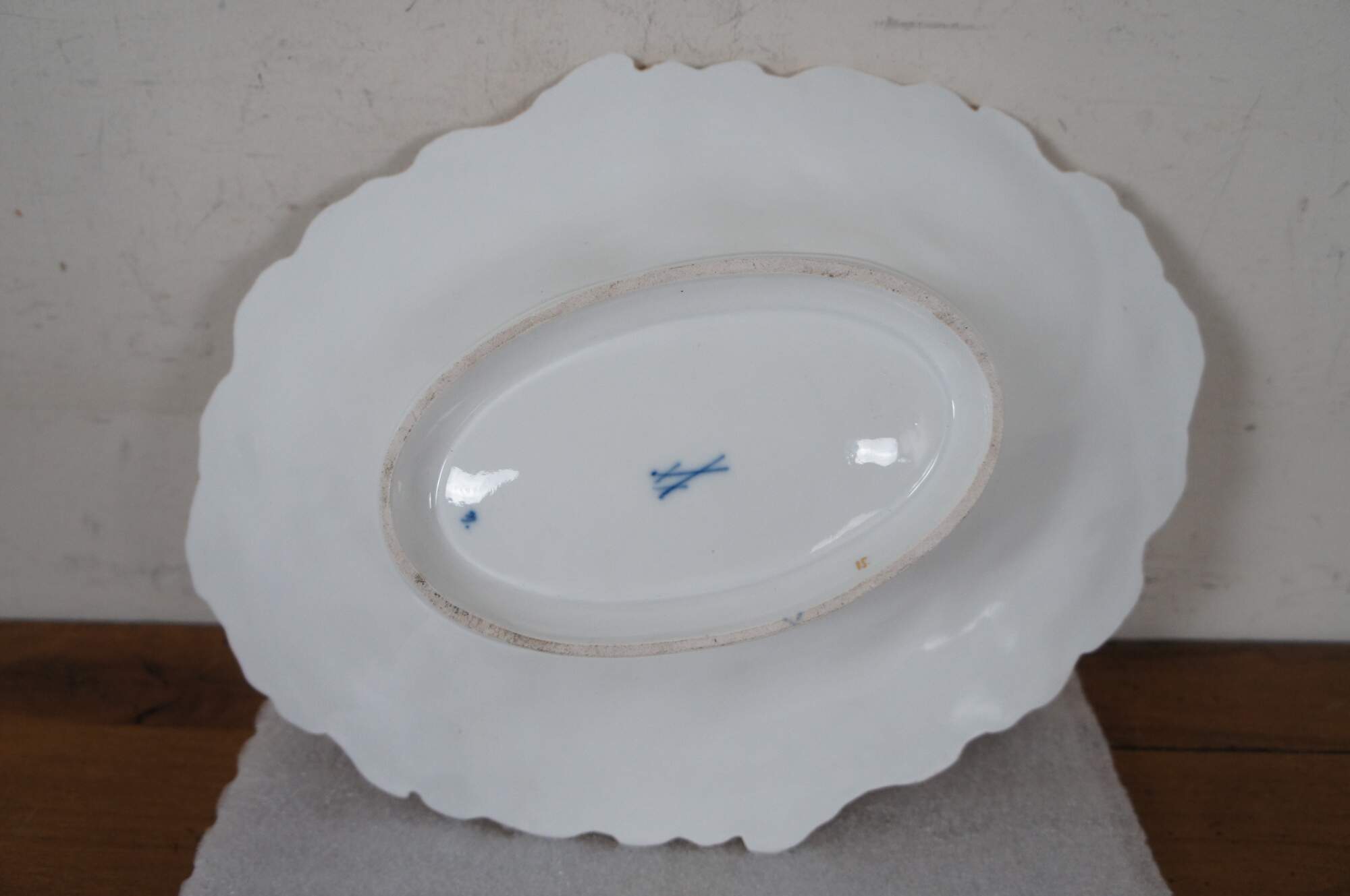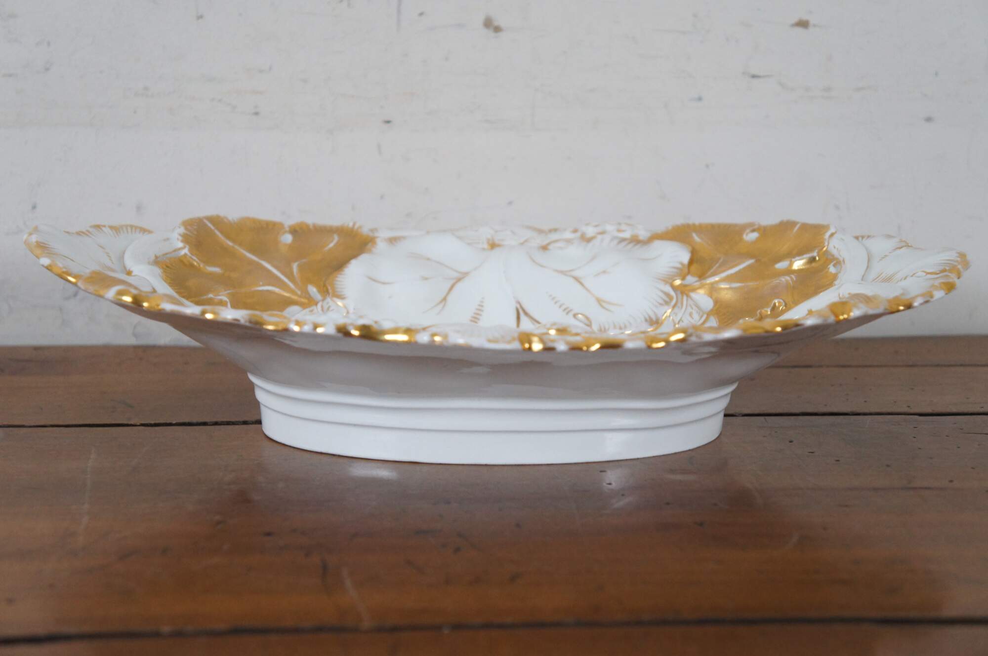 Antique Meissen porcelain footed cabinet plate / centerpiece bowl / serving platter / compote featuring scalloped oval form with low relief grapevines, grapes and leaves with gold gilded accents and footed base. 1815 to 1860 crossed swords mark.