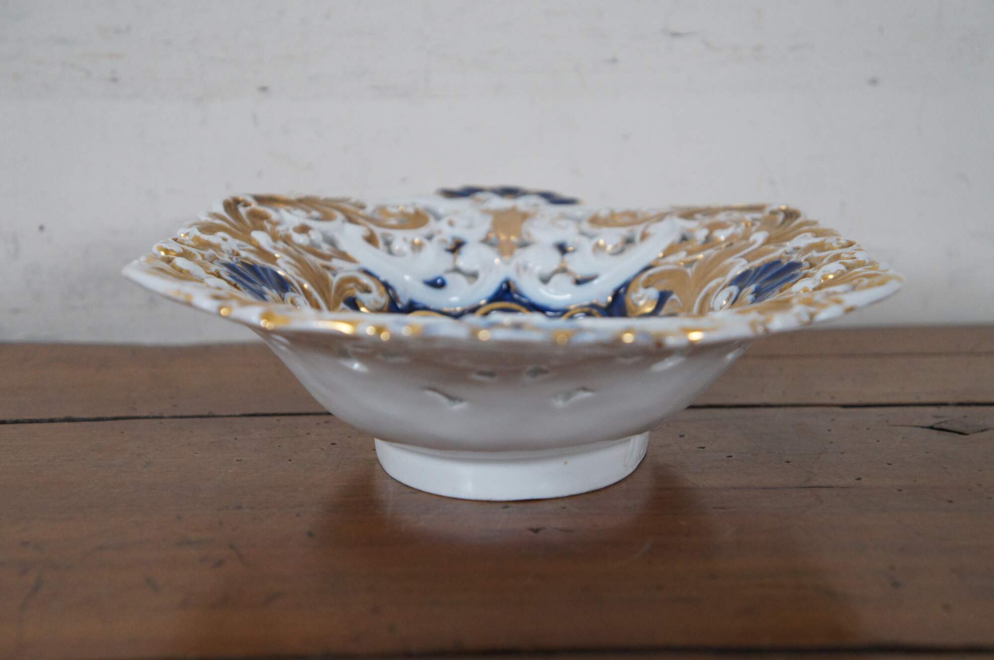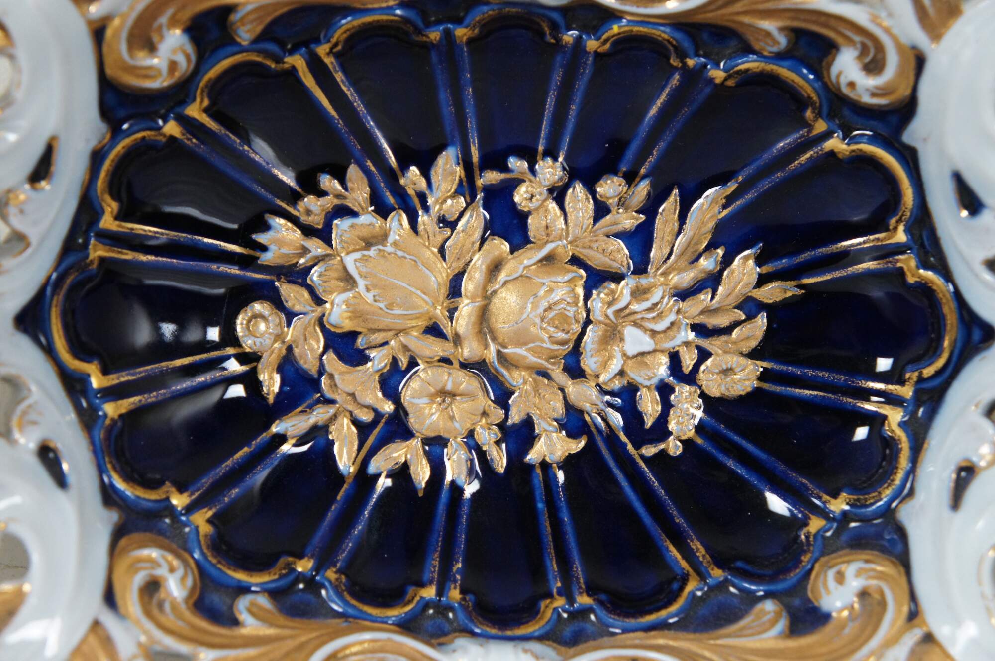 Antique German Meissen porcelain footed cabinet plate / centerpiece bowl / serving platter / compote featuring scalloped oval form with low relief reticulated design of gold gilt roses and acanthus leaves with cobalt blue shell handles and footed base. 1815 to 1860 crossed swords mark.