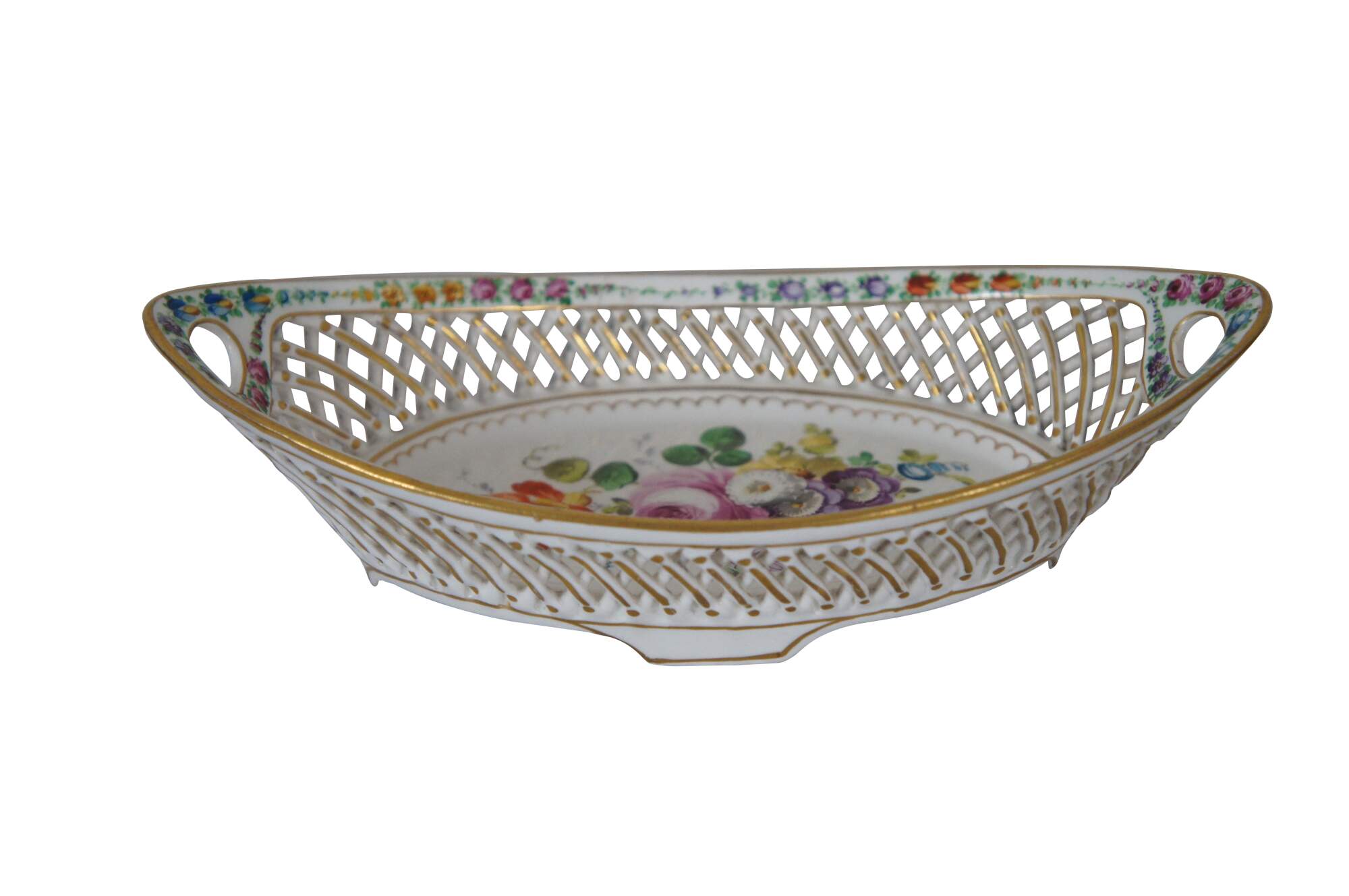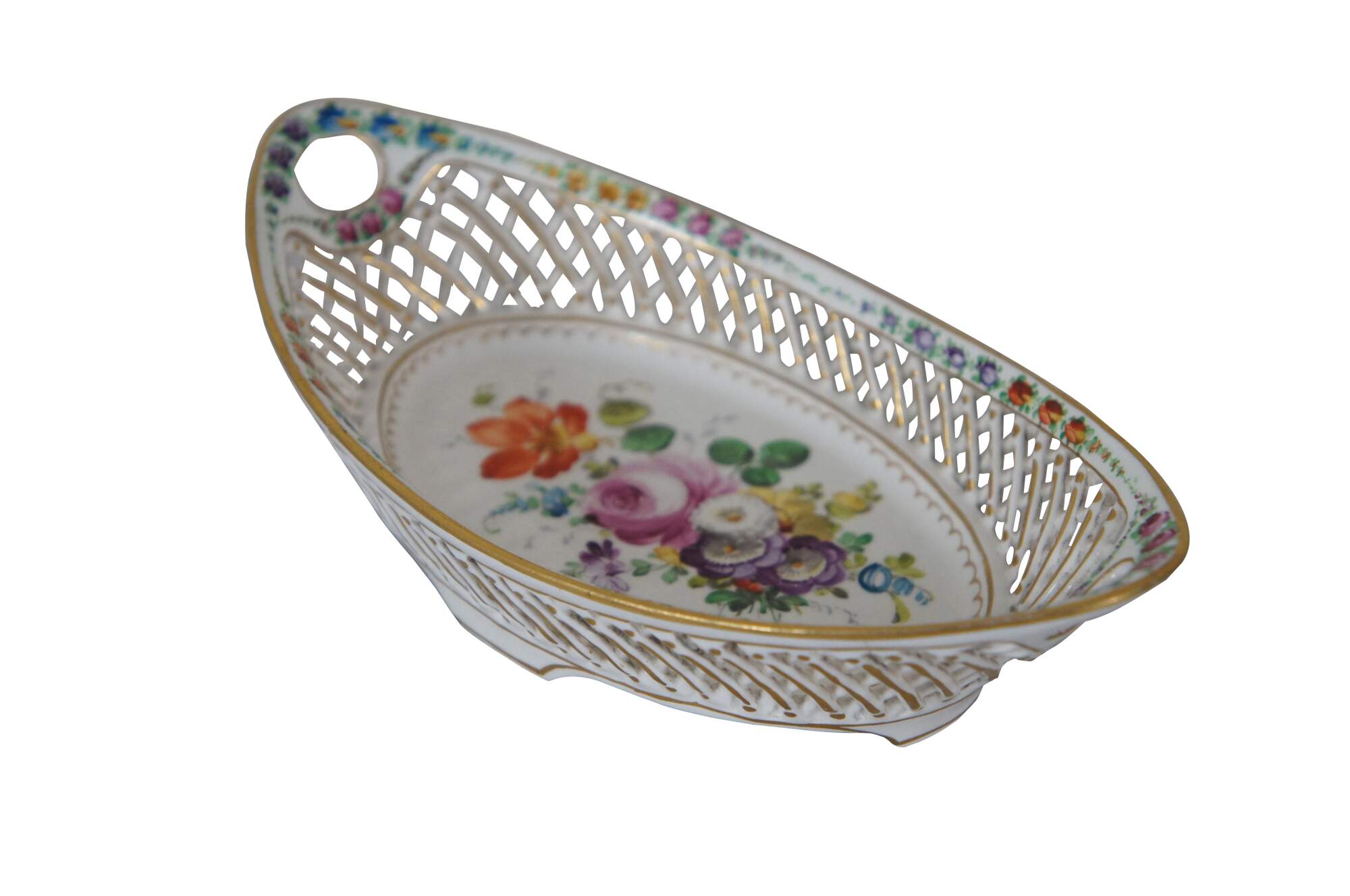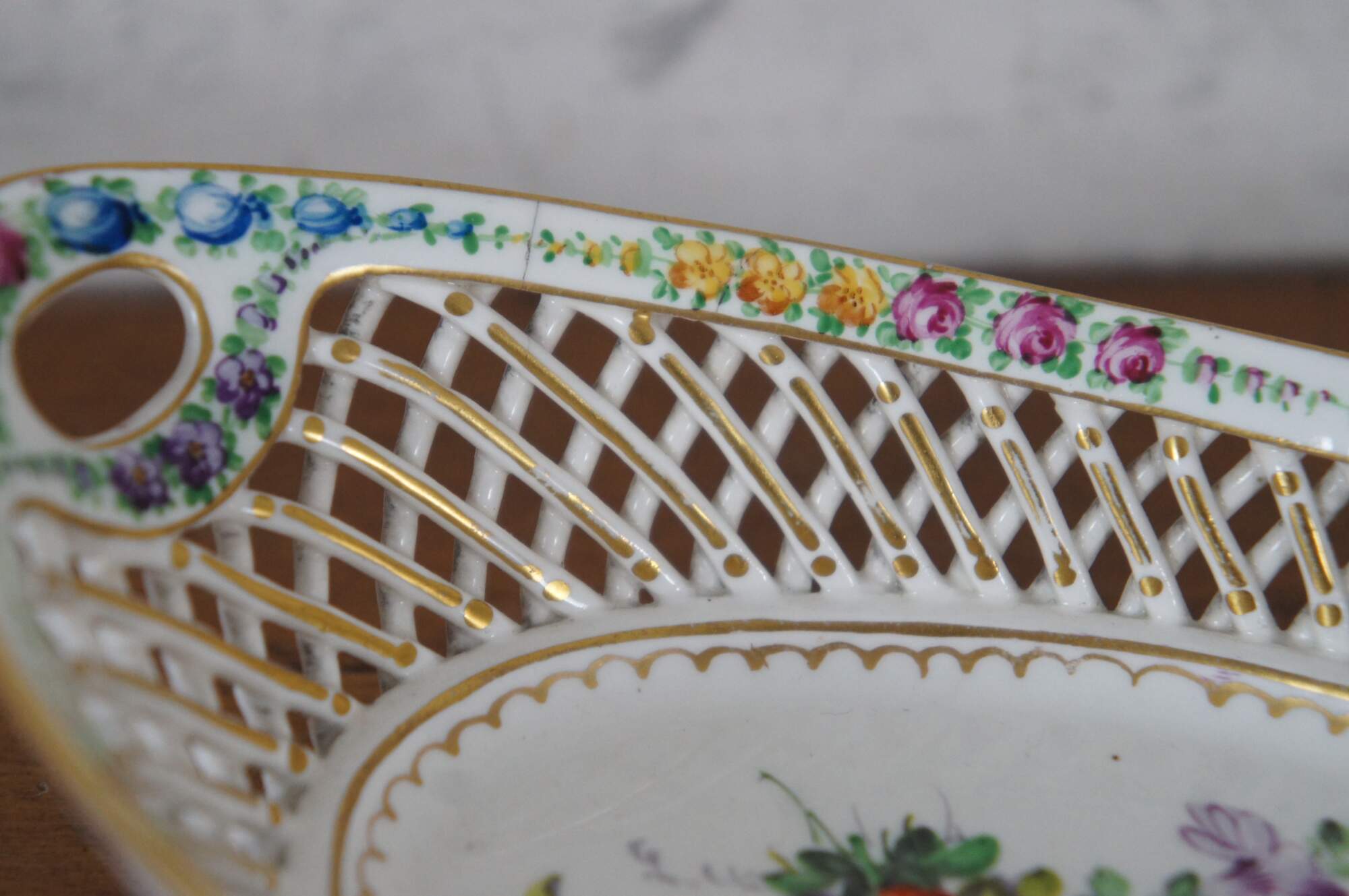 Antique Dresden Germany crown mark bowl or compote. Made of porcelain featuring oval form with reticulated basketweave pattern, handles, footed base and colorful floral motif.