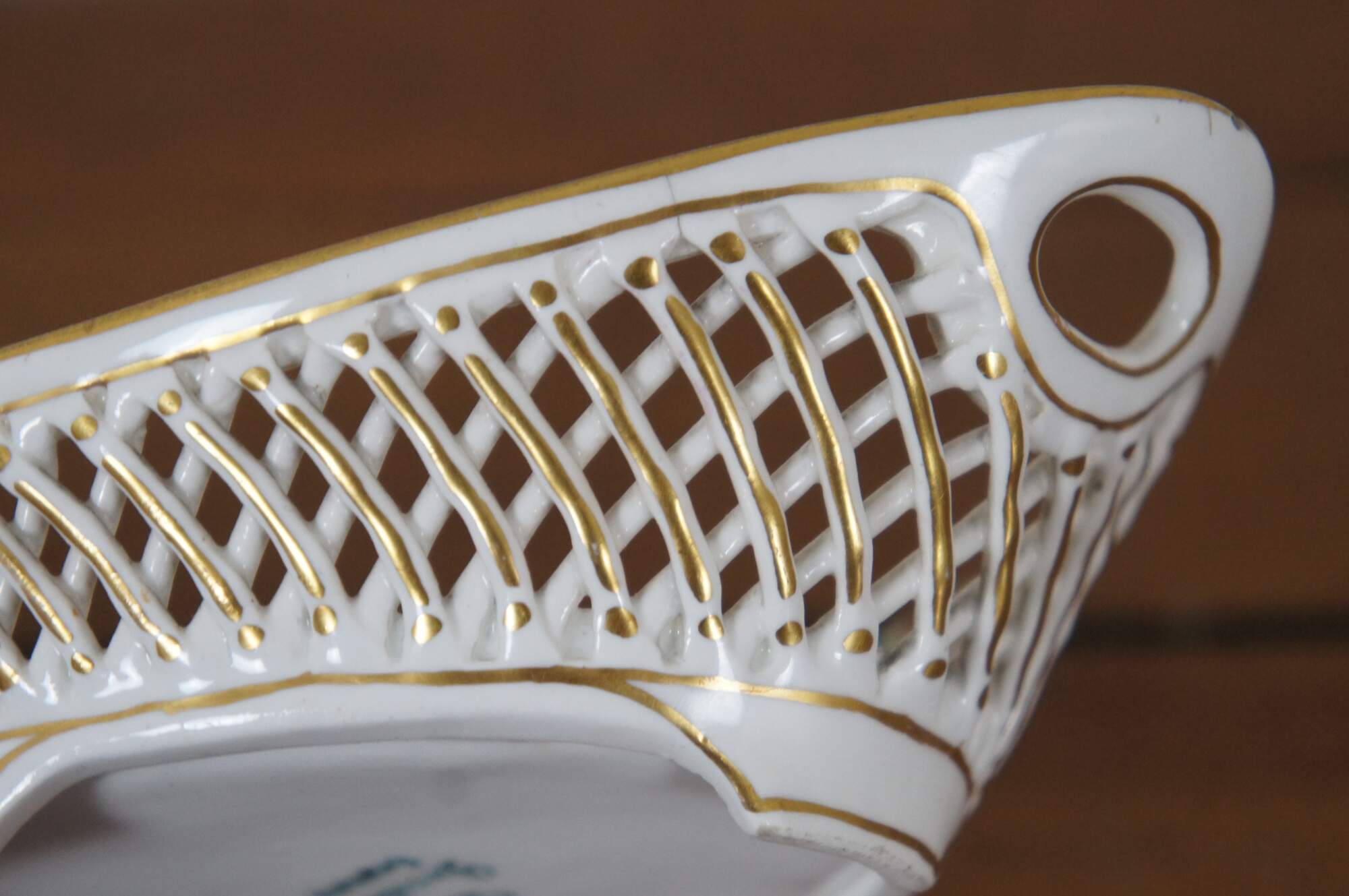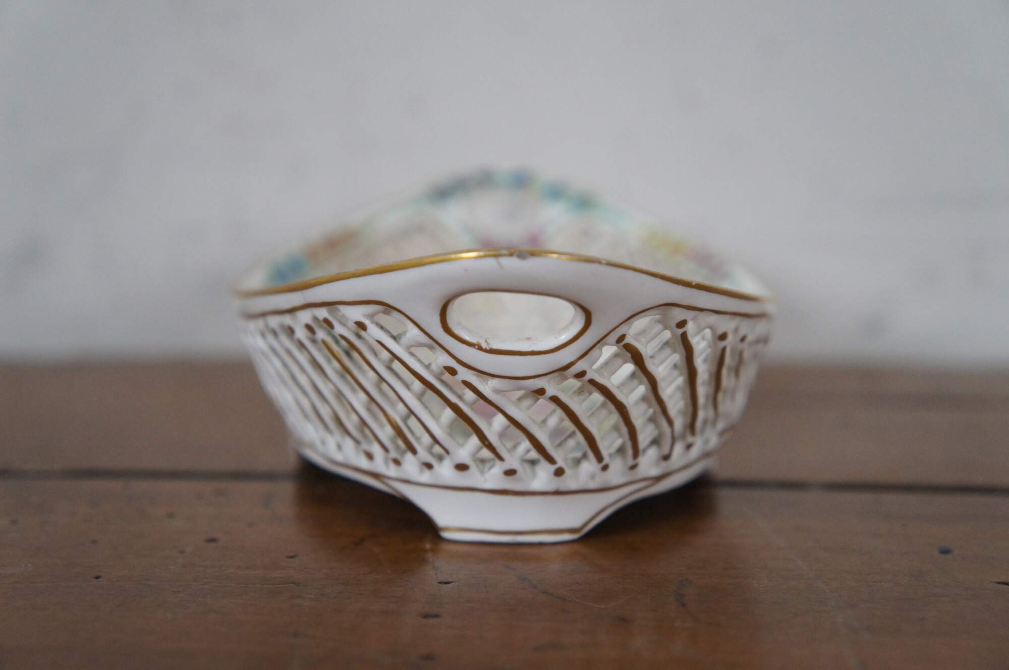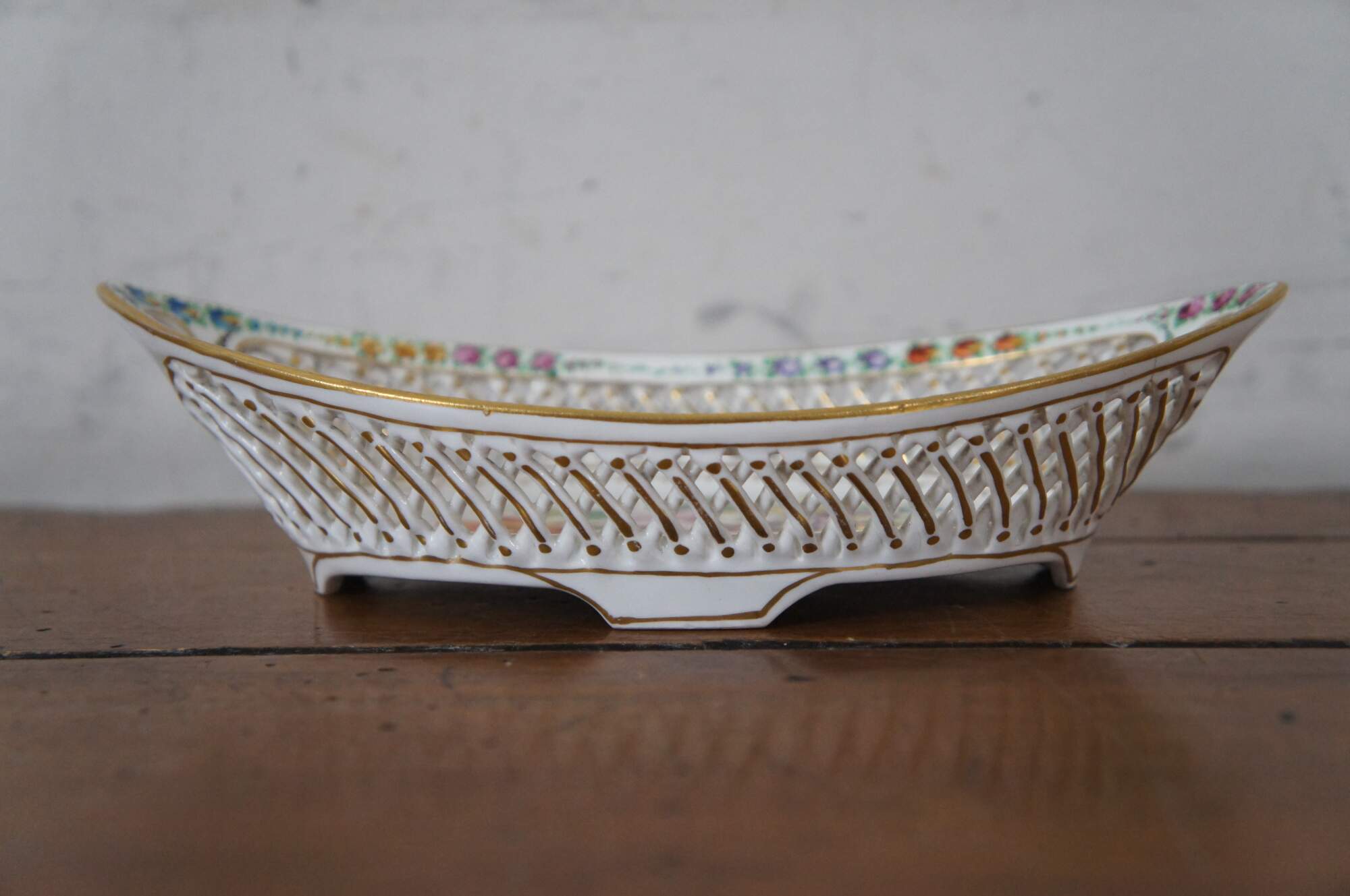 Antique Dresden Germany crown mark bowl or compote. Made of porcelain featuring oval form with reticulated basketweave pattern, handles, footed base and colorful floral motif.