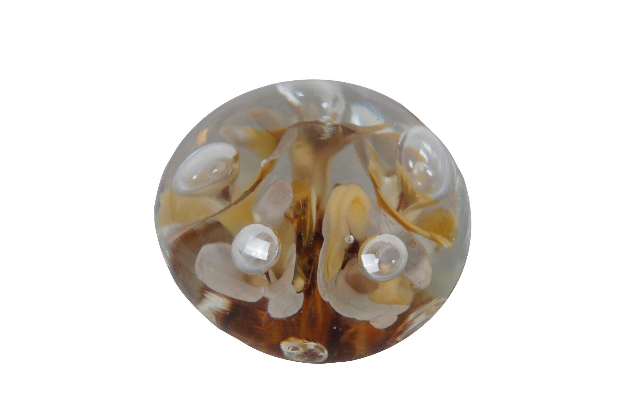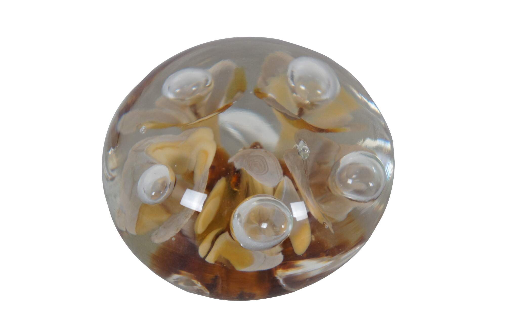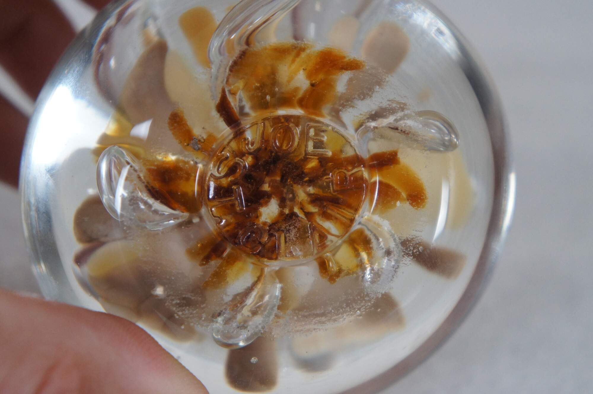 Vintage Joe St Clair handblown art glass paperweight featuring an icepick floral motif circa 1960-1970. As is typical of this style, there is a carefully placed bubble in the center of each flower and also a carefully placed bubble in the ground in between each flower. It is hot stamped on the bottom.