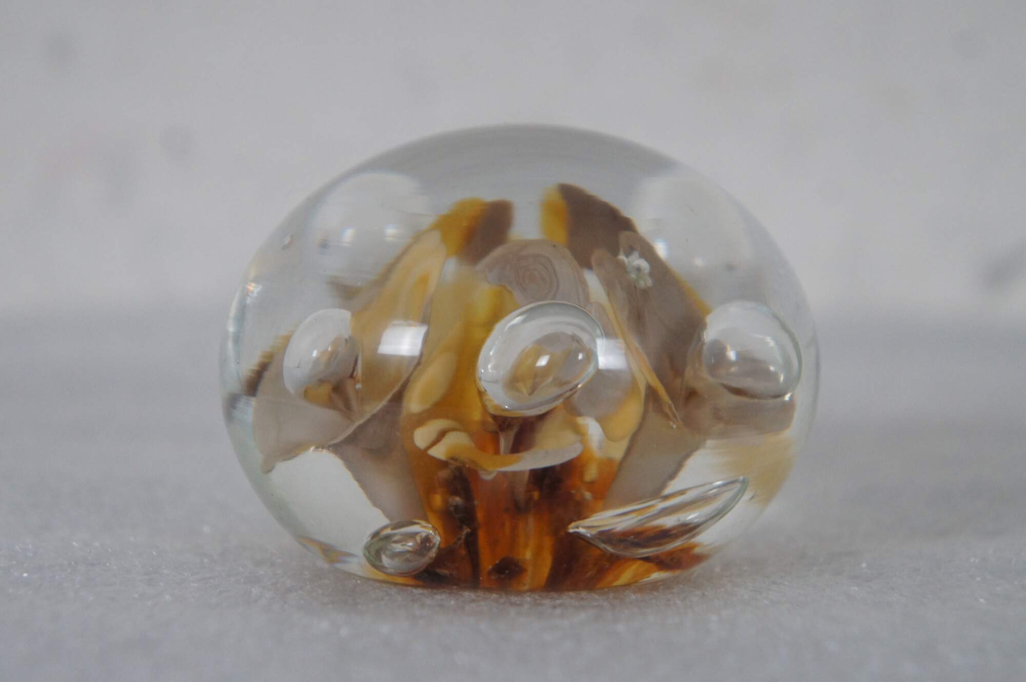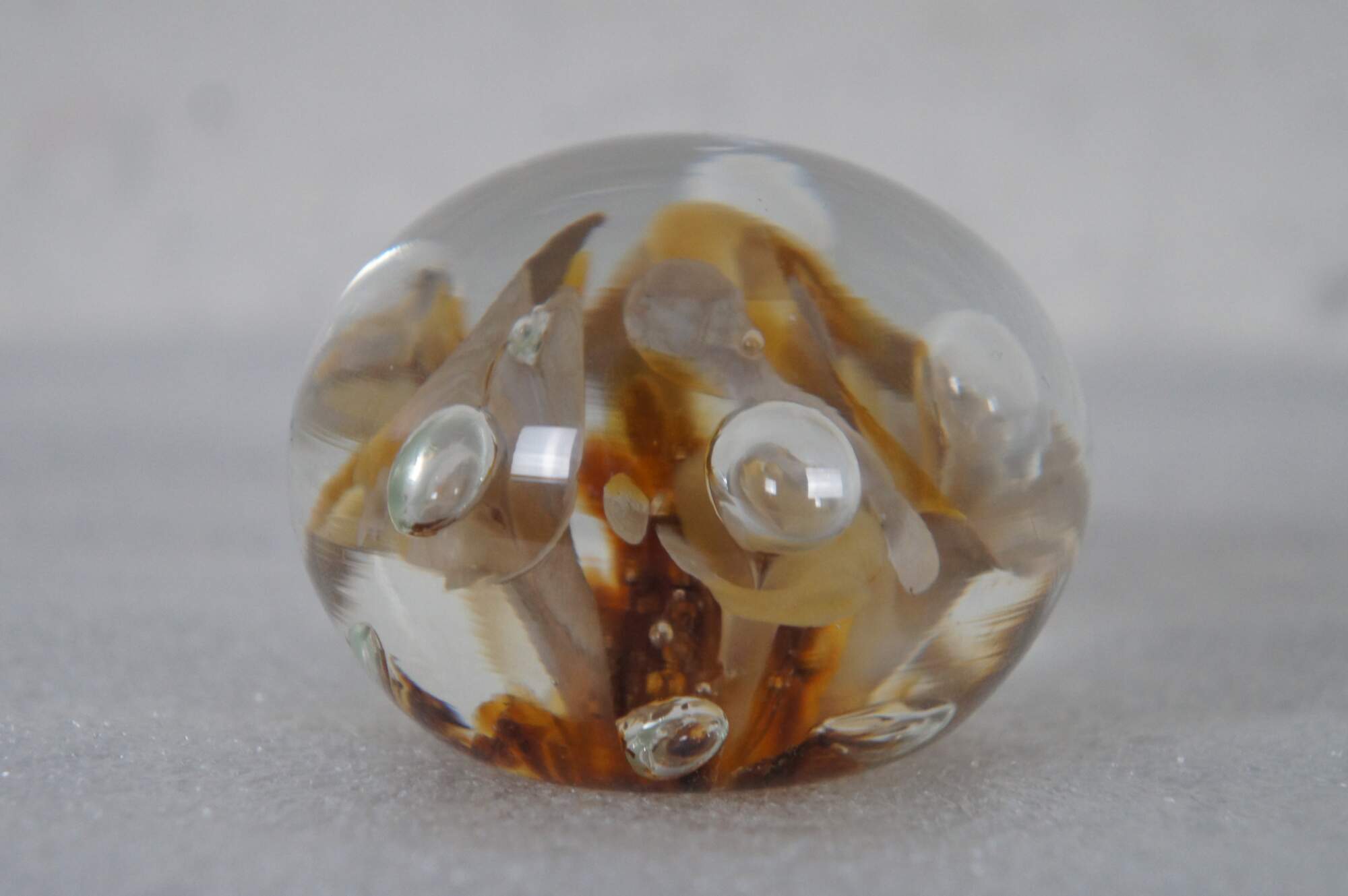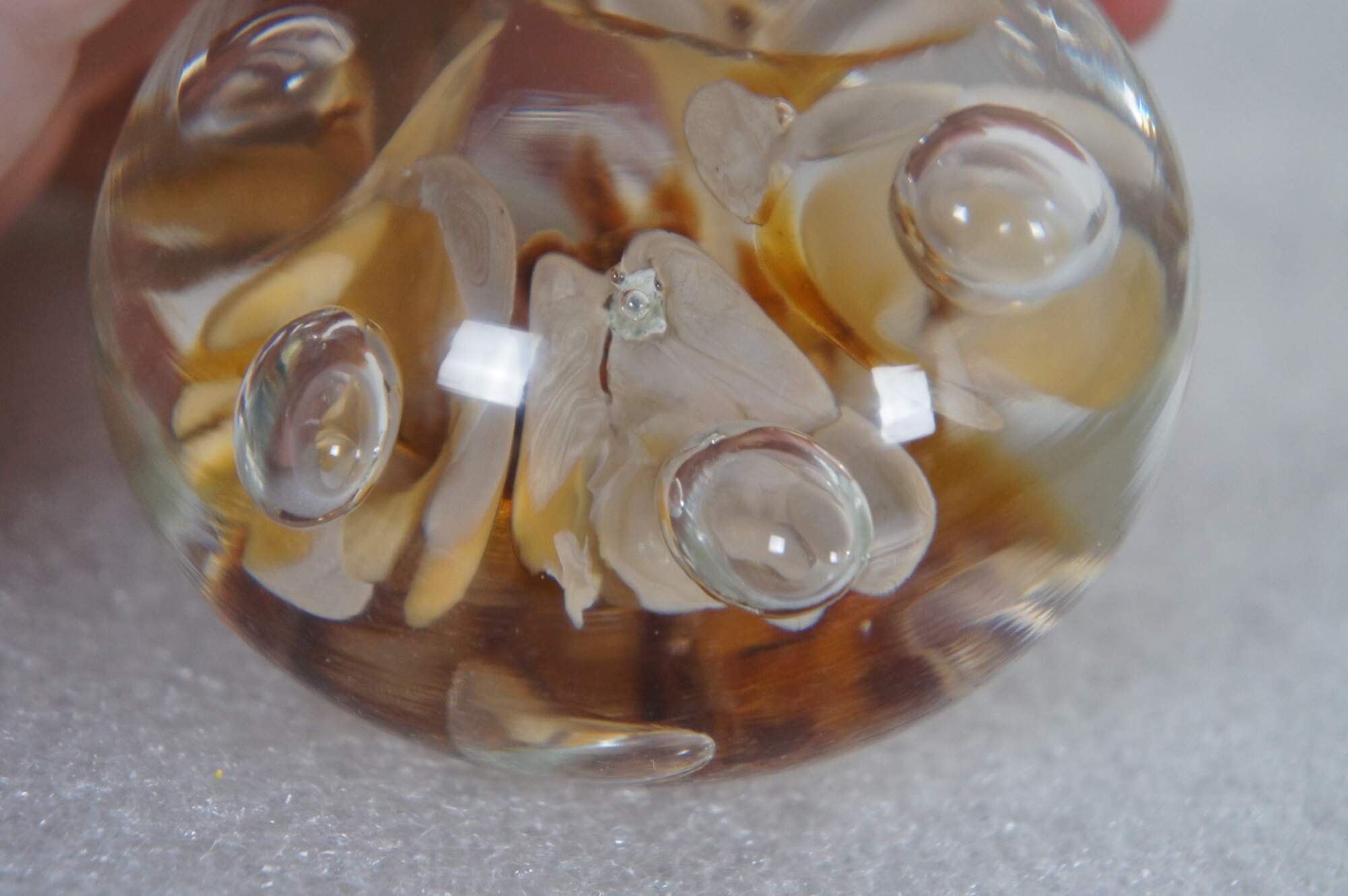 Vintage Joe St Clair handblown art glass paperweight featuring an icepick floral motif circa 1960-1970. As is typical of this style, there is a carefully placed bubble in the center of each flower and also a carefully placed bubble in the ground in between each flower. It is hot stamped on the bottom.