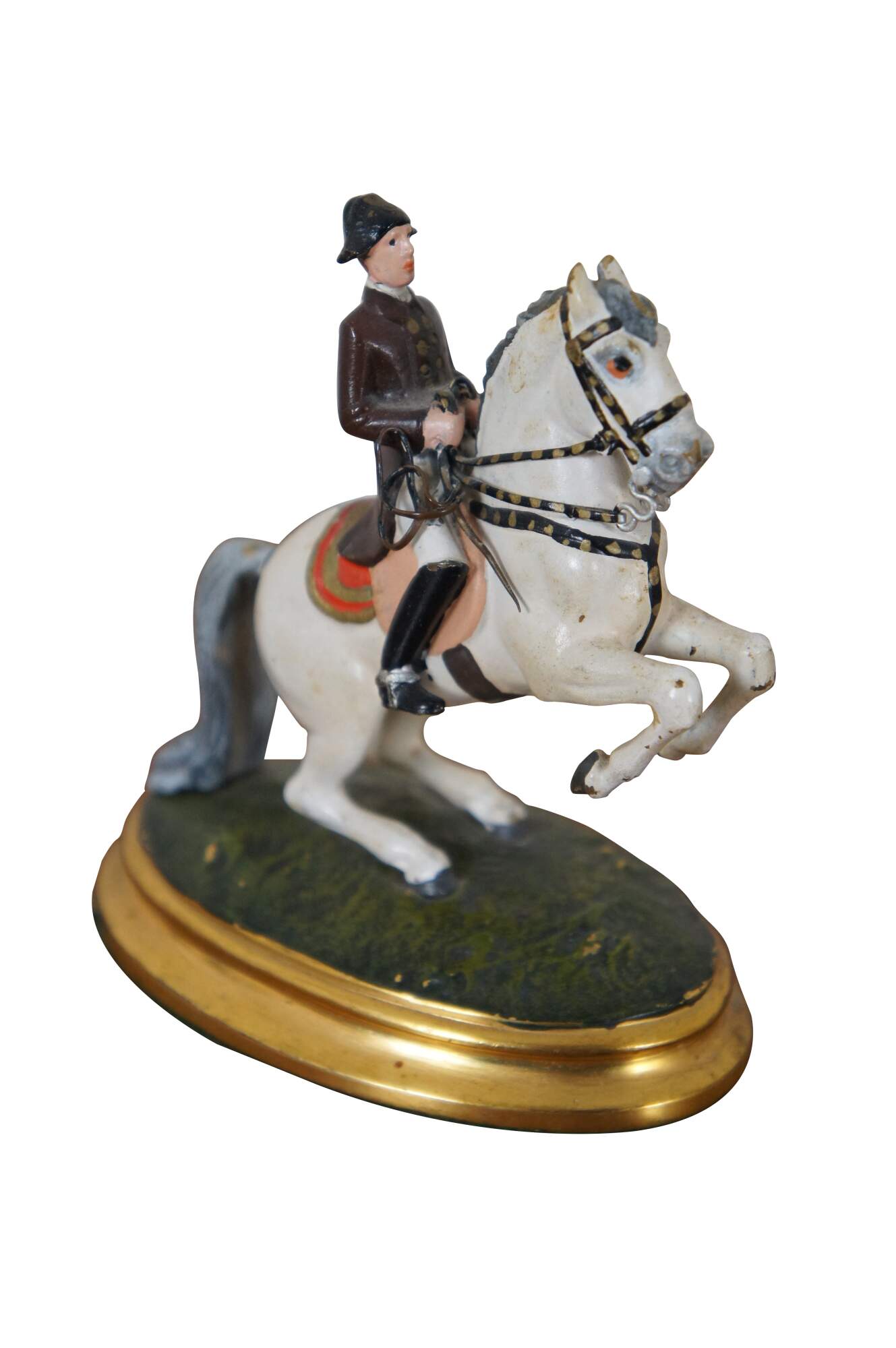Mid to early 20th century equestrian figurine or paperweight of a man on a Lipizzaner horse / stallion from the Spanish Riding School in Vienna Austria. Made of a heavy metal / lead featuring hand painted details.