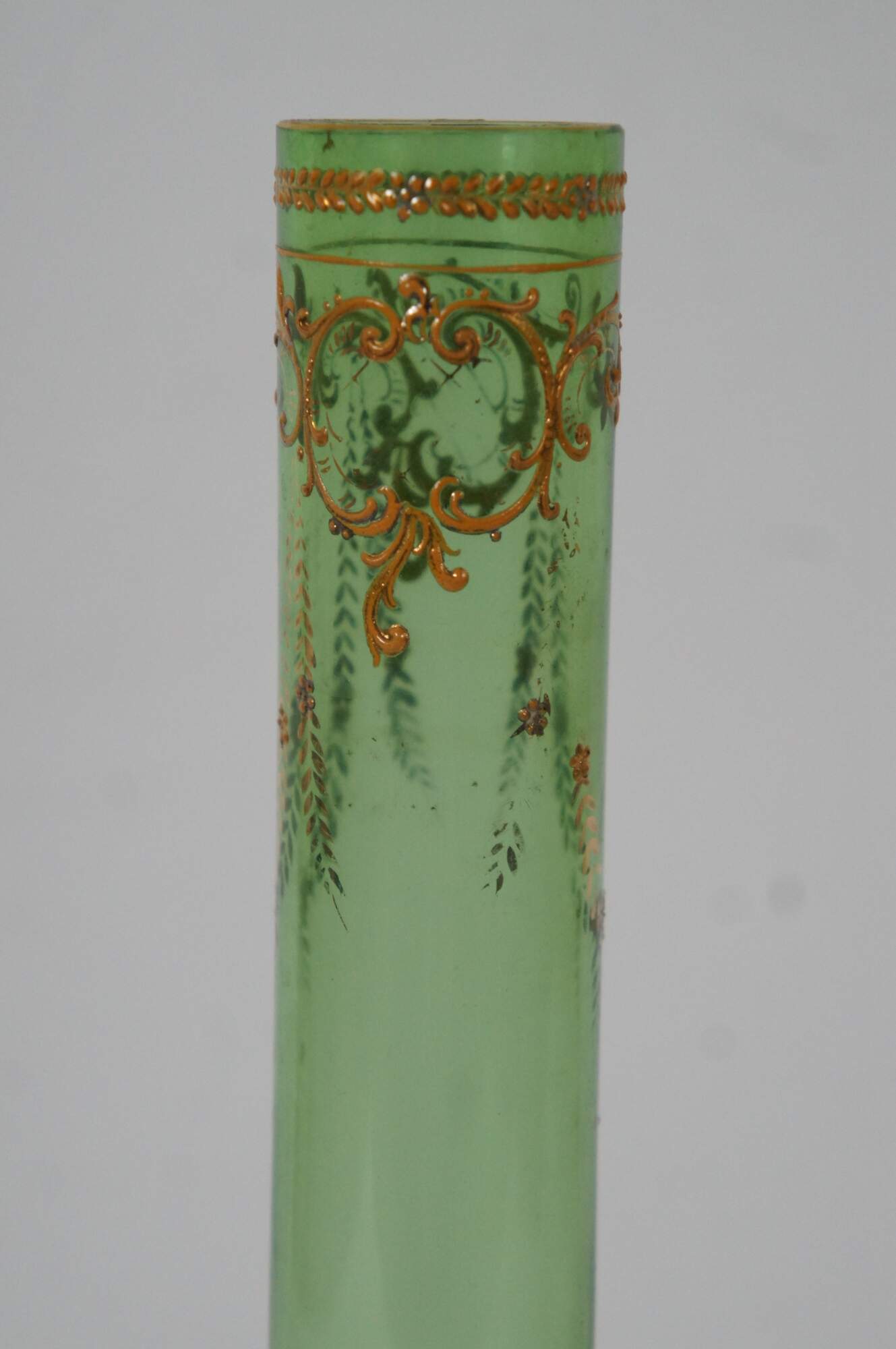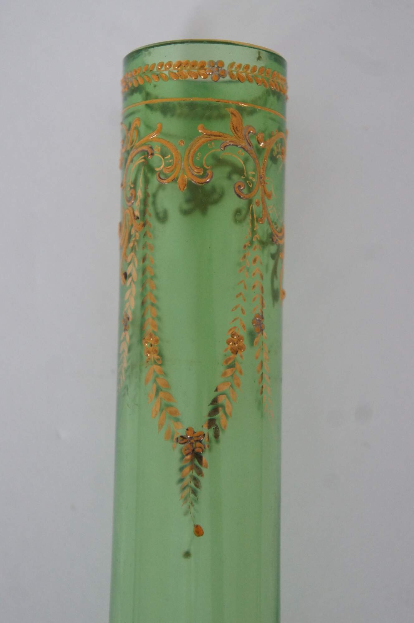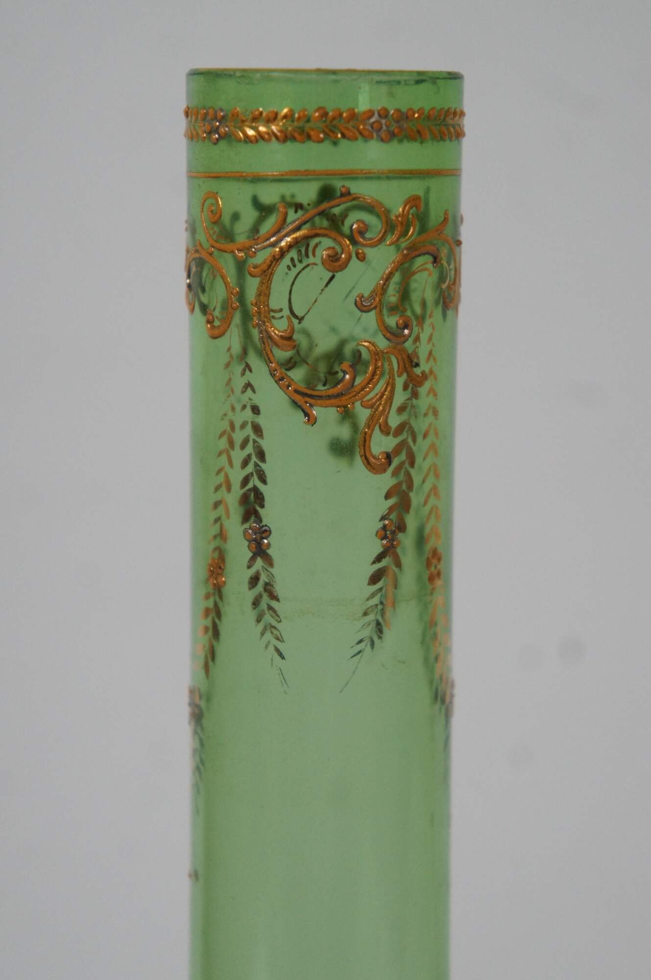 Antique Moser Karlsbad Bohemian Czech art glass bud vase featuring a tubular design with enameled gold gilt accents of florals and swags.