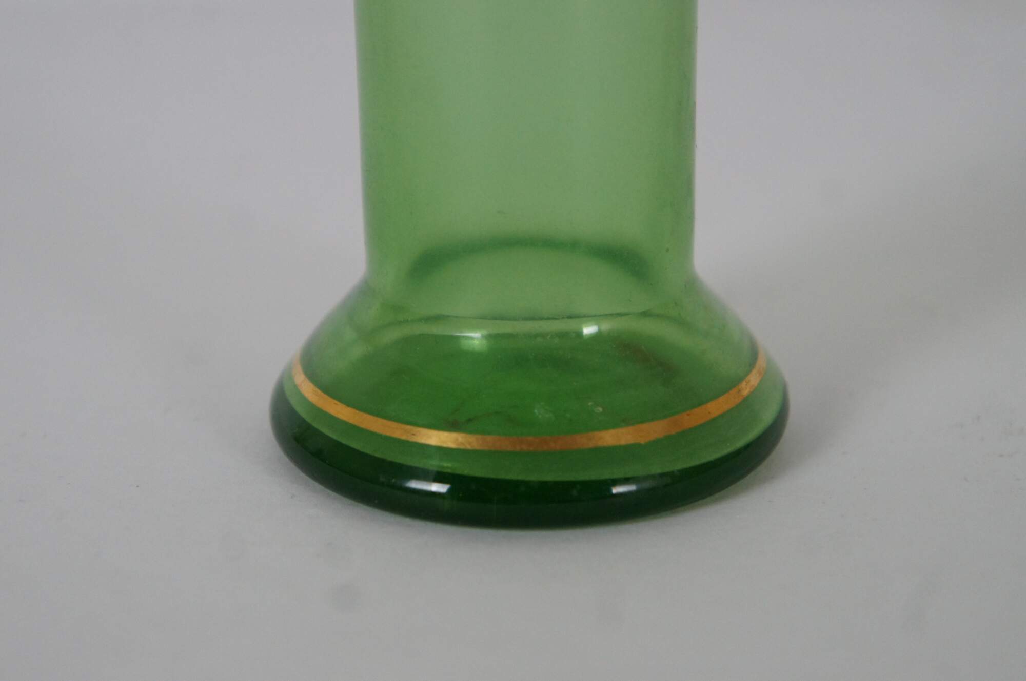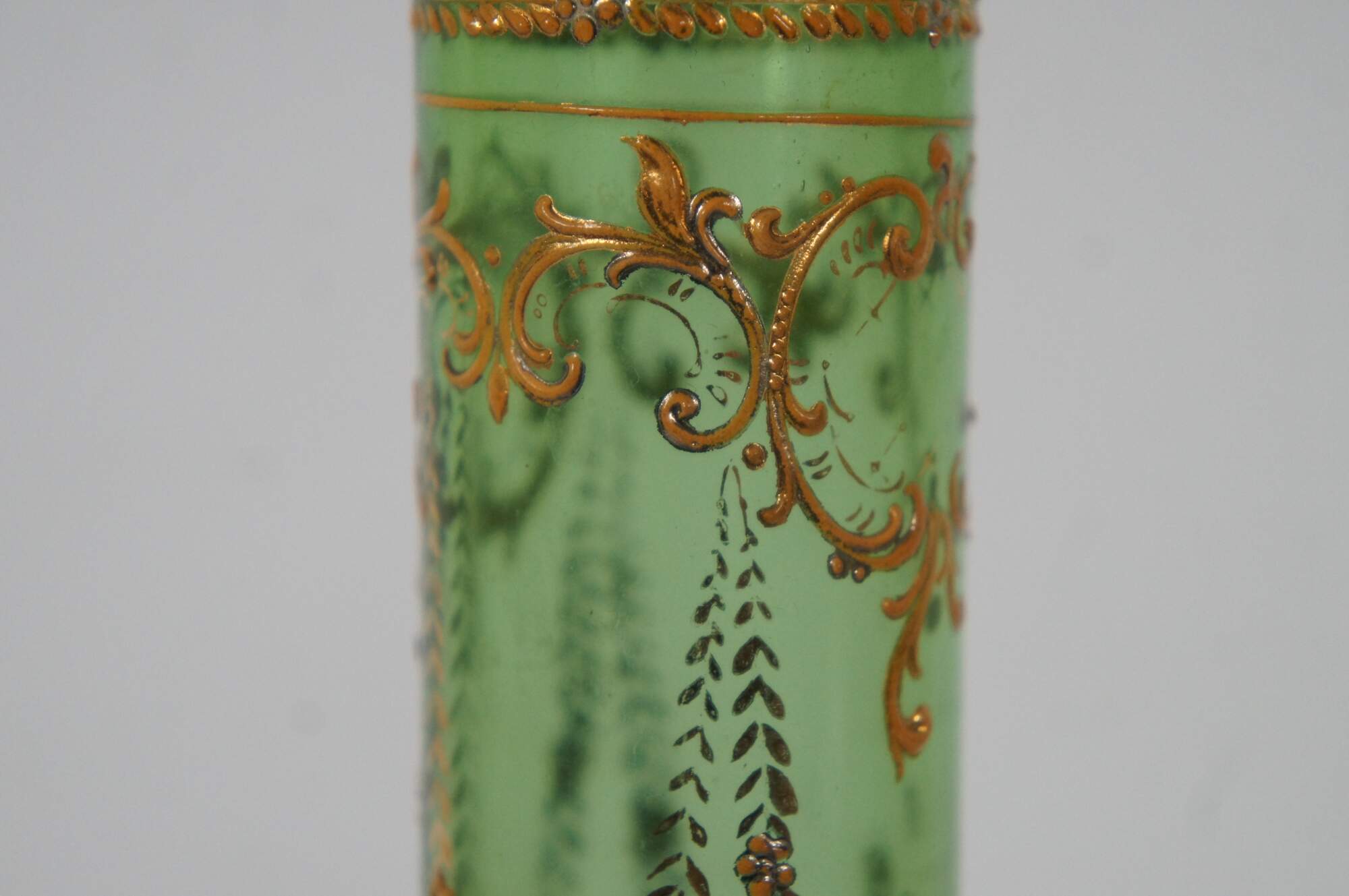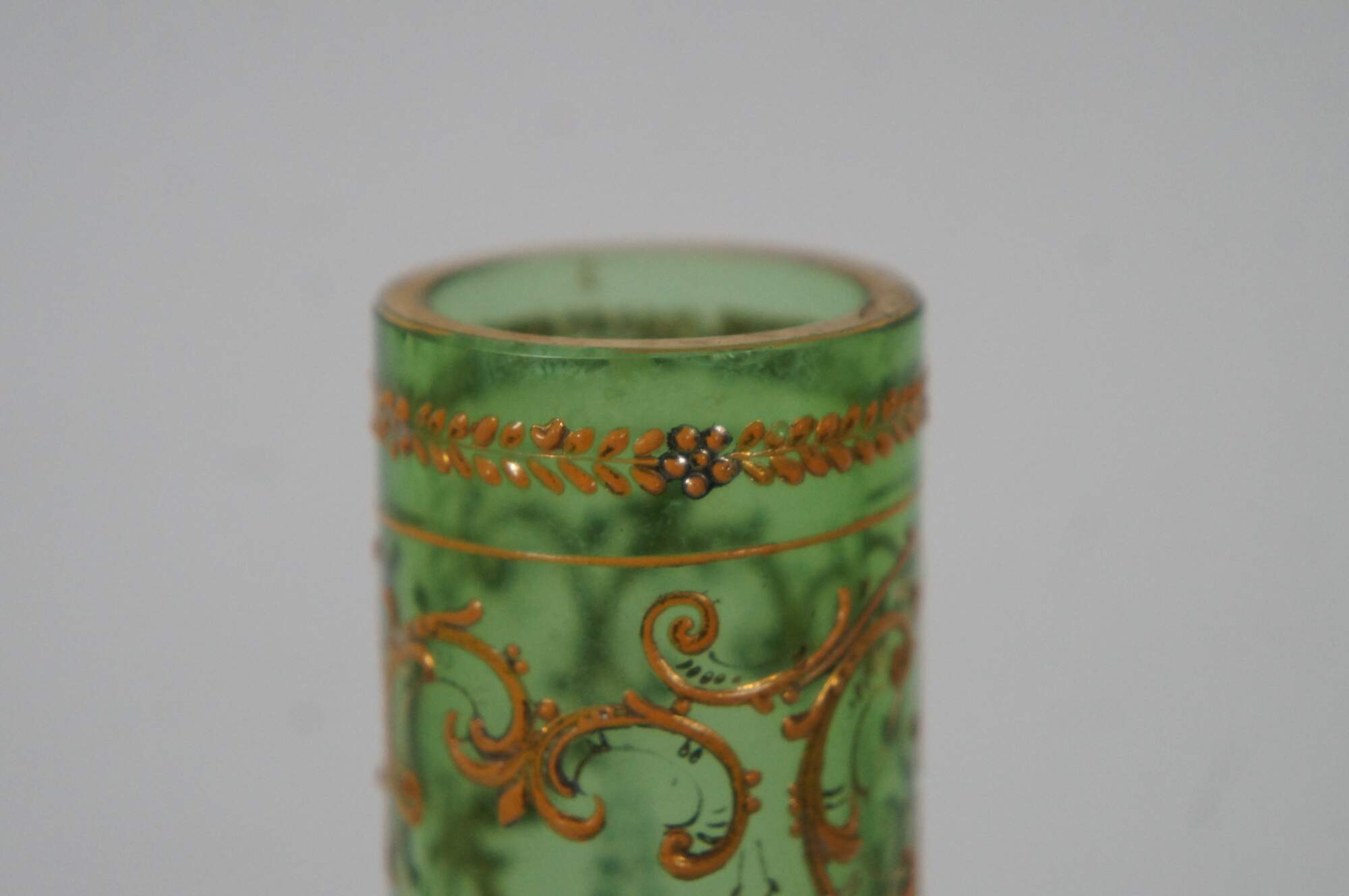 Antique Moser Karlsbad Bohemian Czech art glass bud vase featuring a tubular design with enameled gold gilt accents of florals and swags.