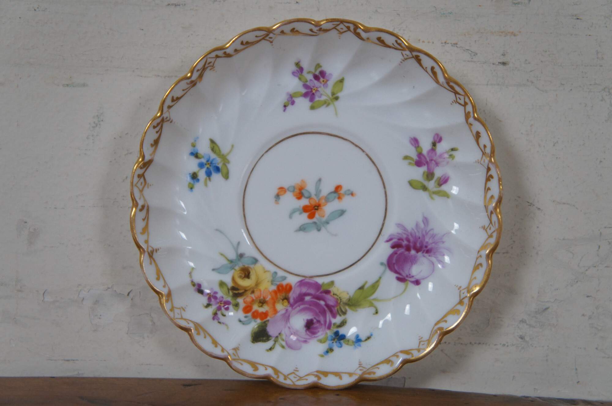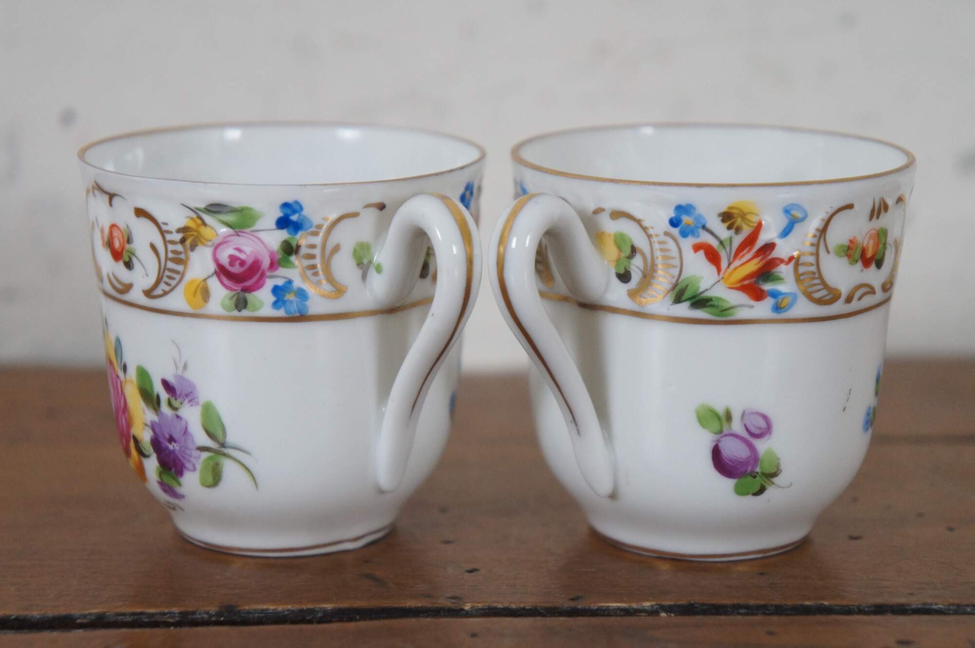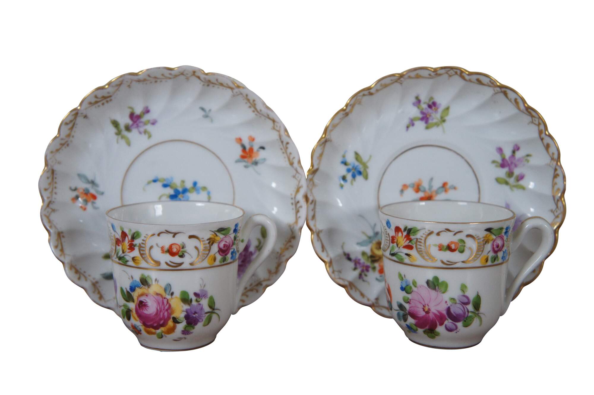 Antique four piece Carl Thieme German Dresden porcelain demitasse teacup / tea / coffee cups and saucers featuring floral design with gold accents.