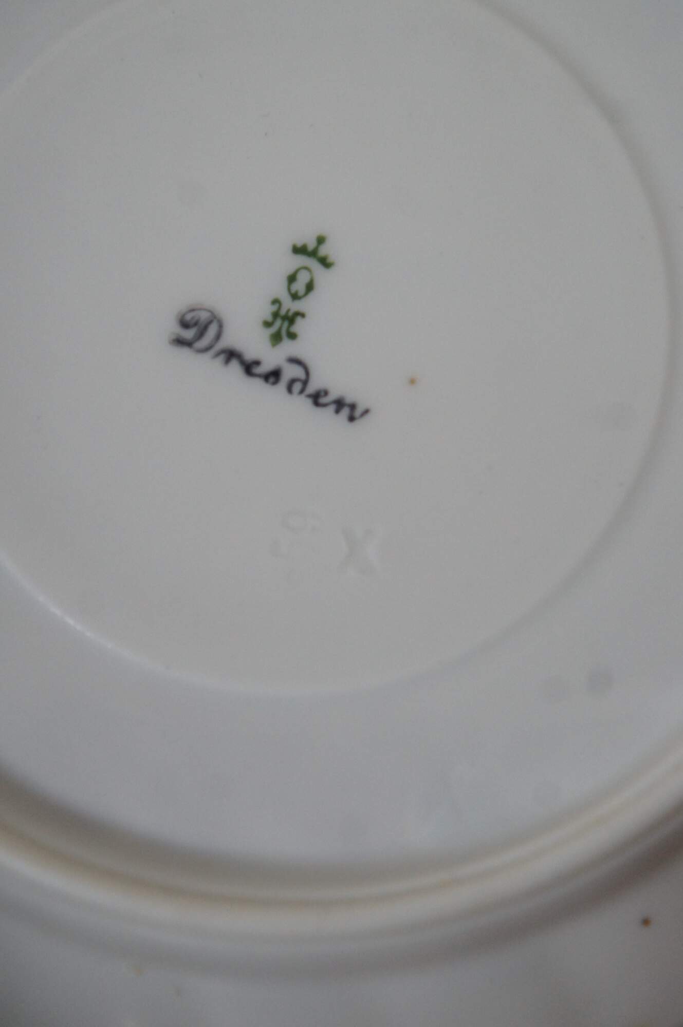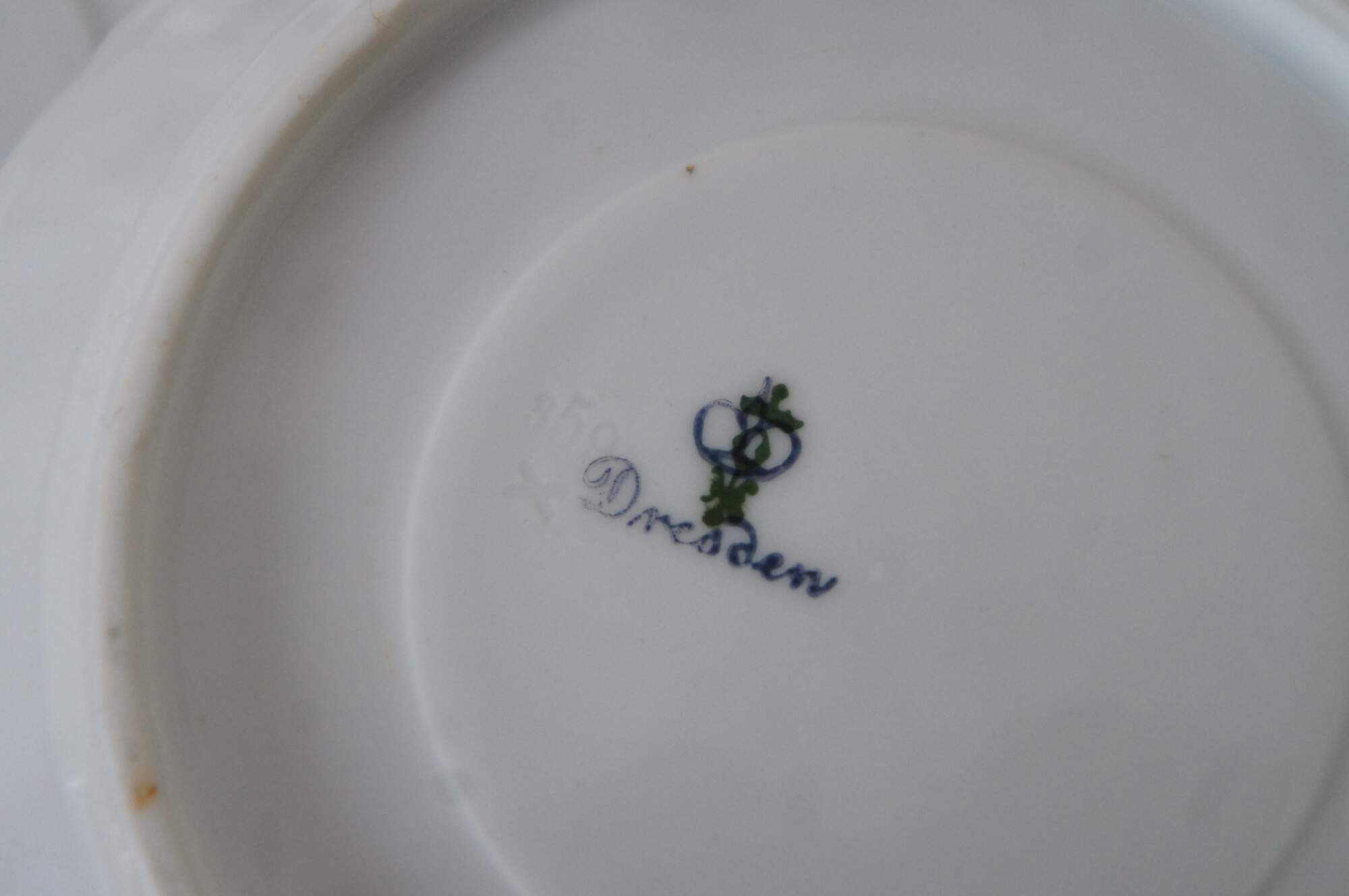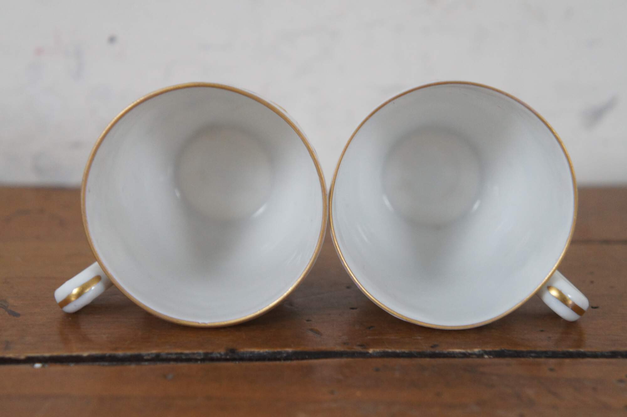 Antique four piece Carl Thieme German Dresden porcelain demitasse teacup / tea / coffee cups and saucers featuring floral design with gold accents.