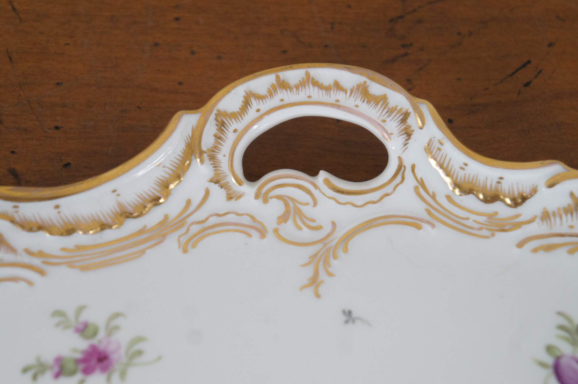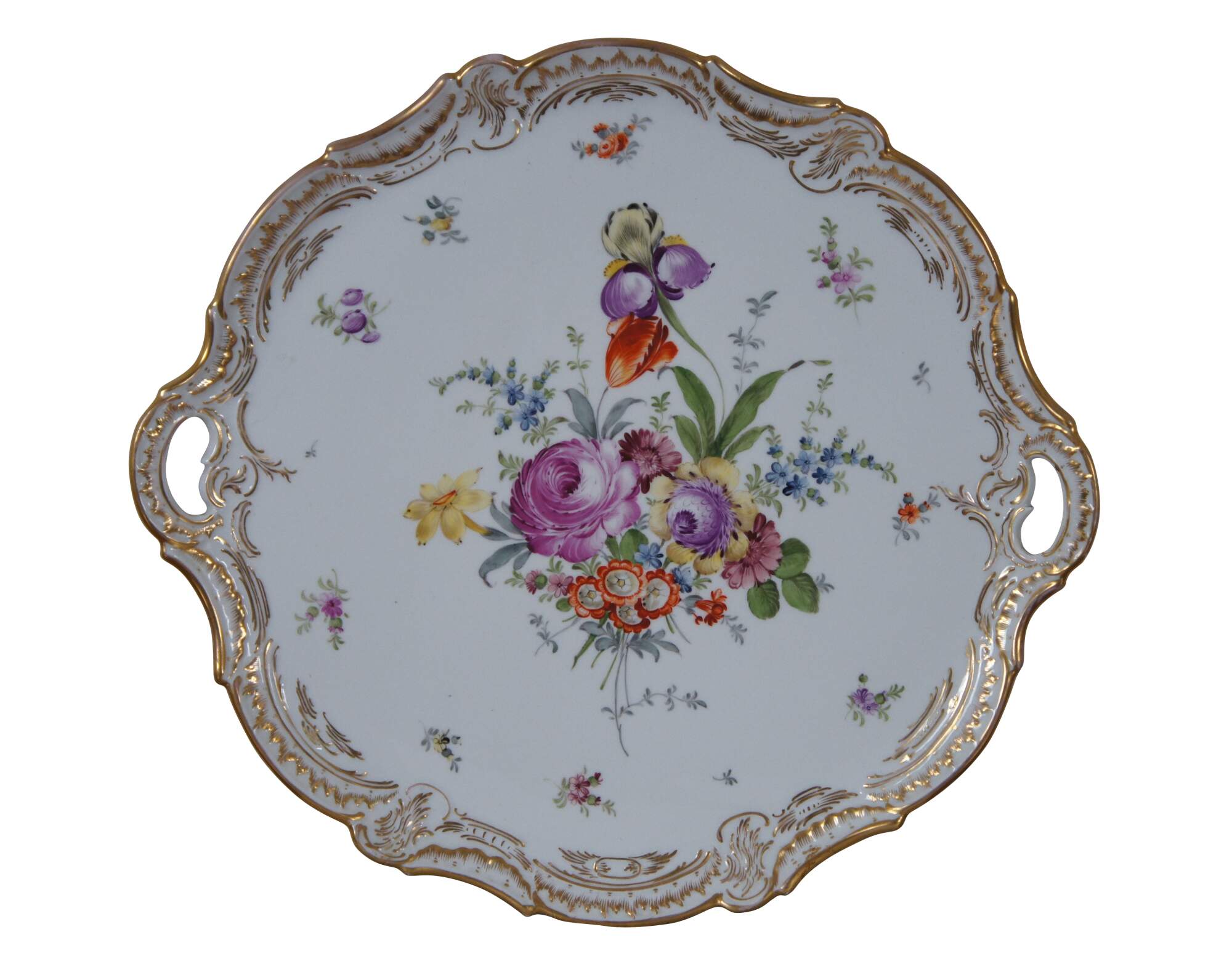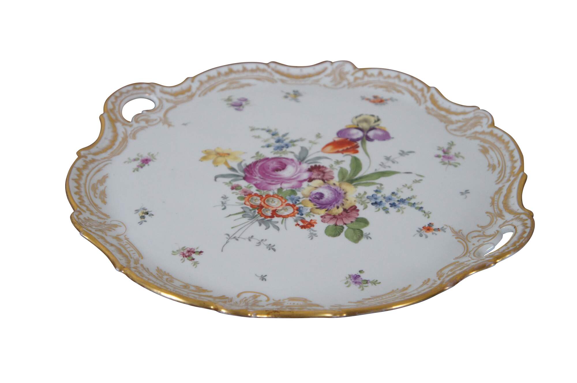 Antique German Dresden porcelain tray, serving platter or cake plate featuring scalloped form with gold accents, floral design and handles.