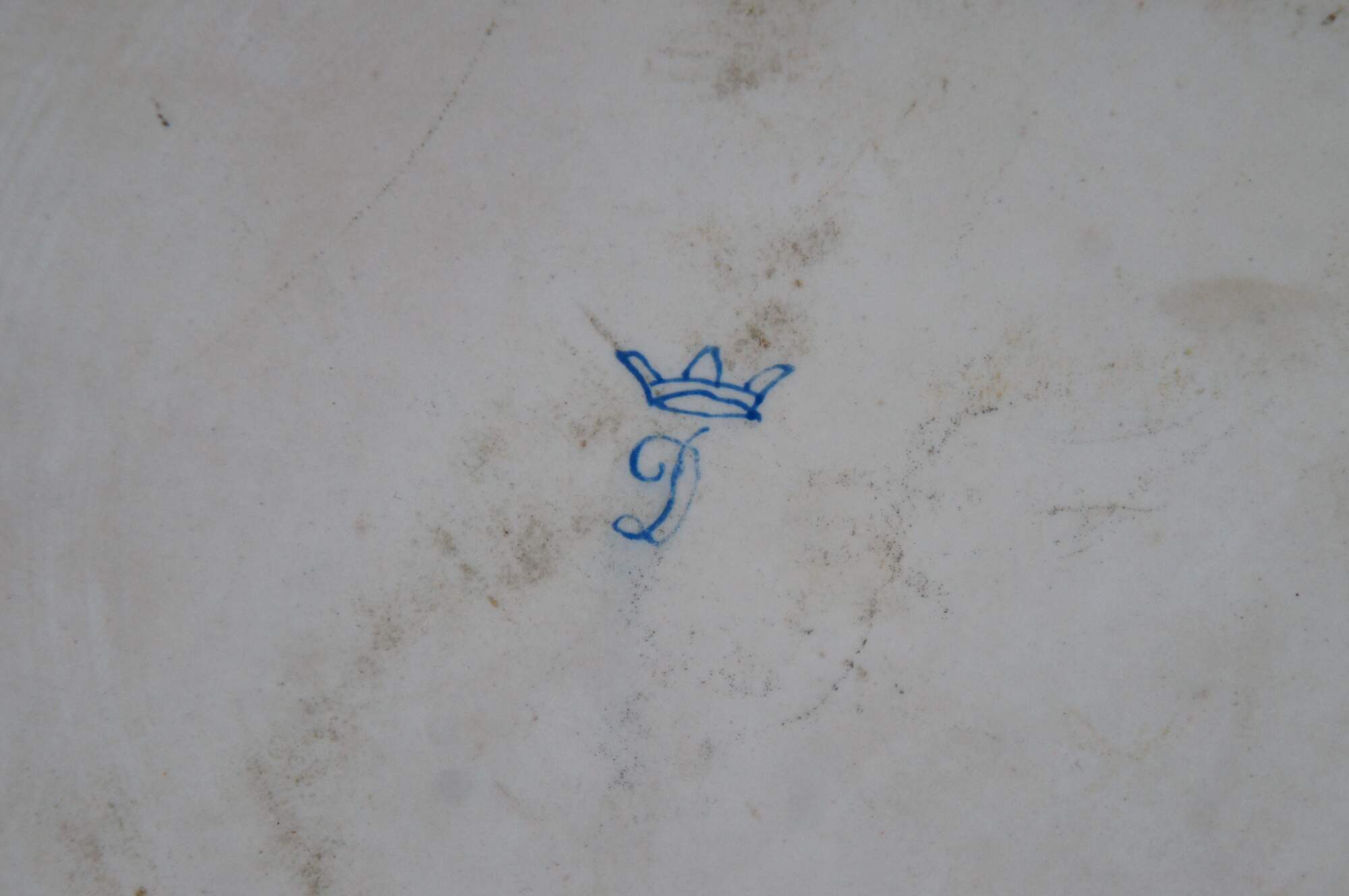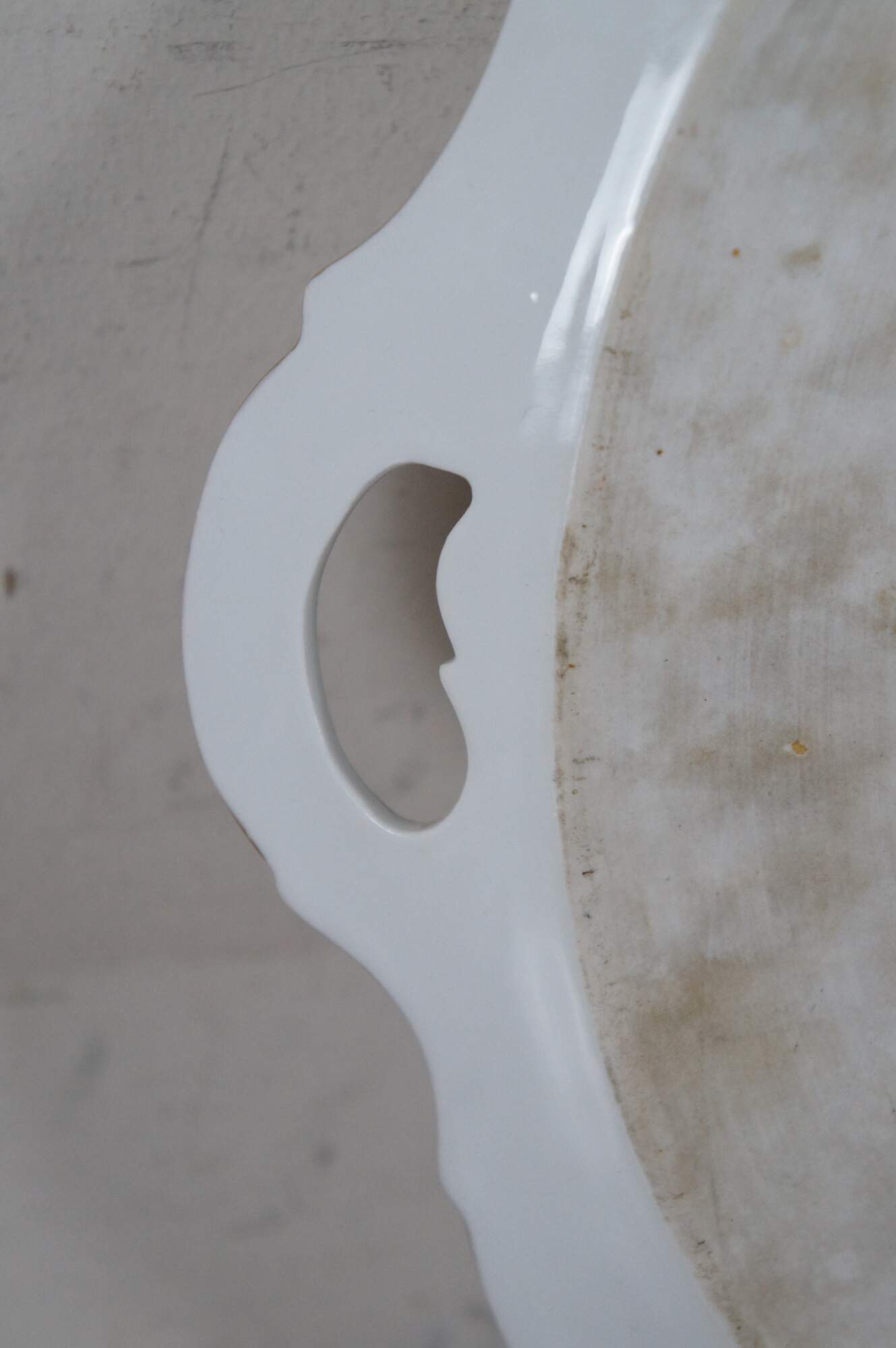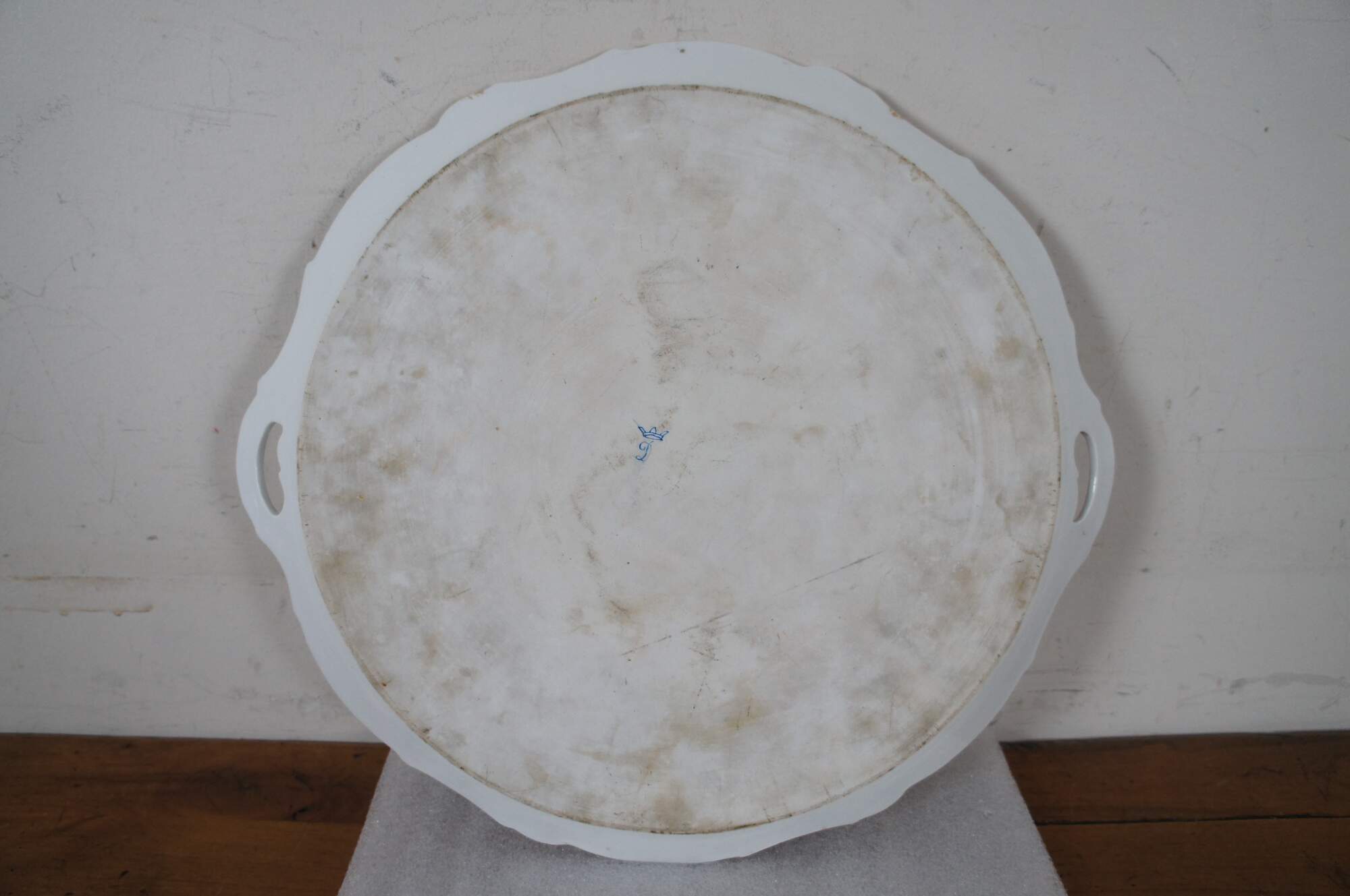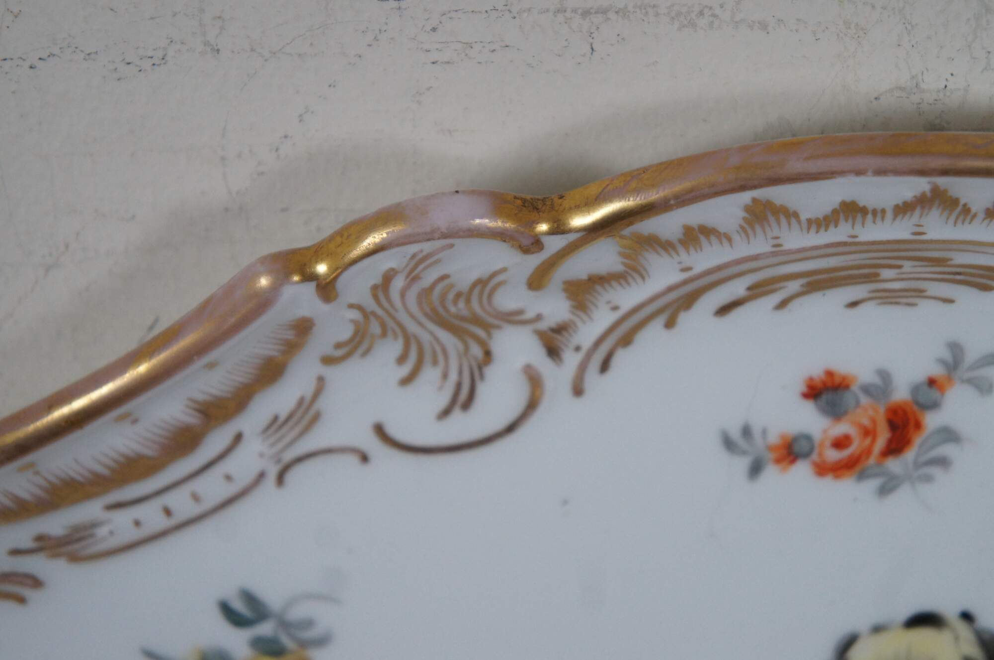 Antique German Dresden porcelain tray, serving platter or cake plate featuring scalloped form with gold accents, floral design and handles.
