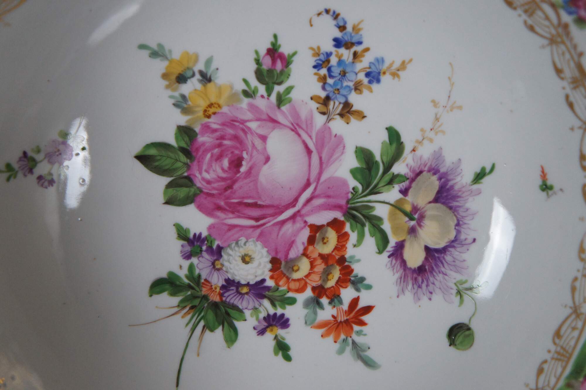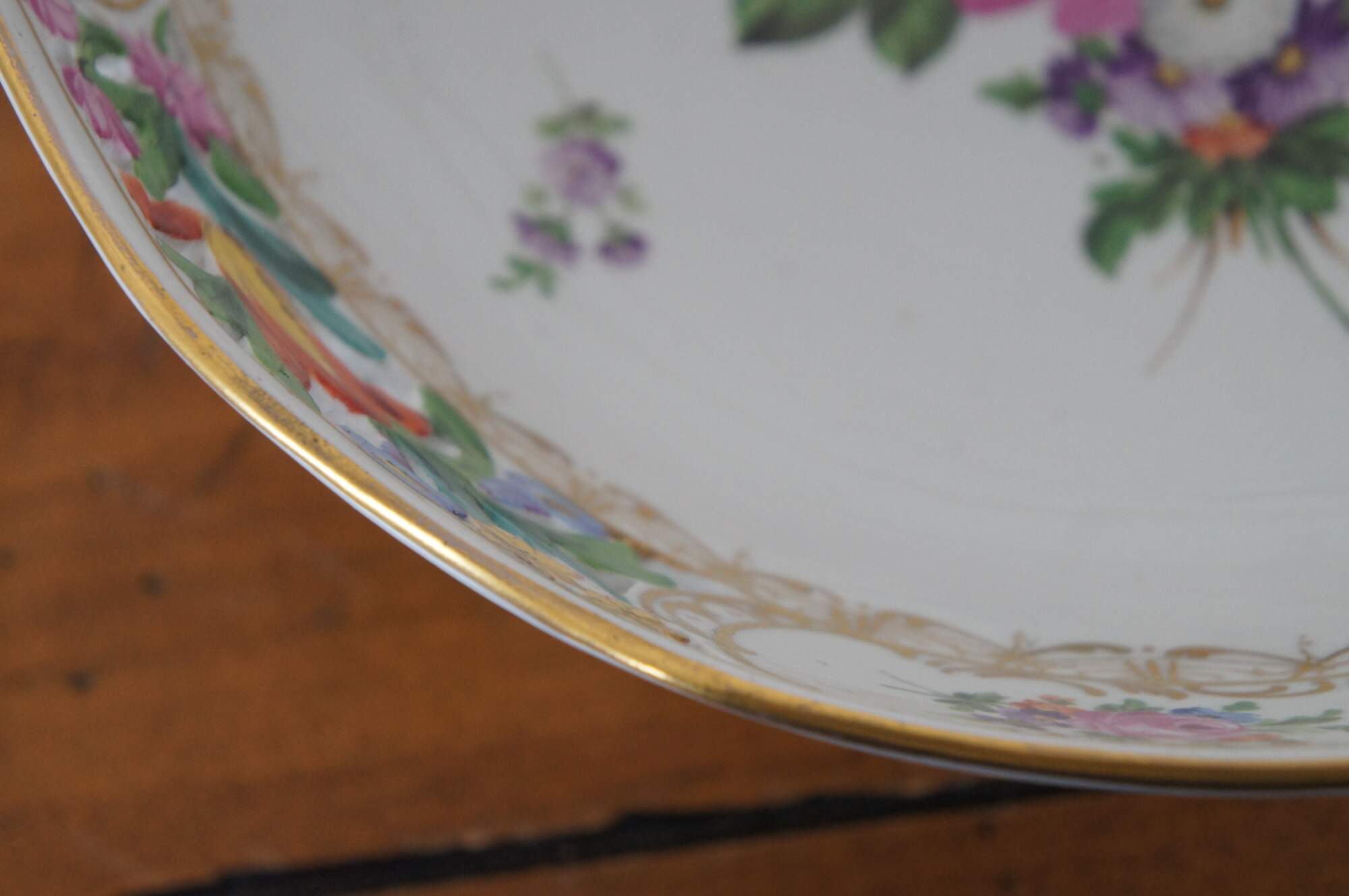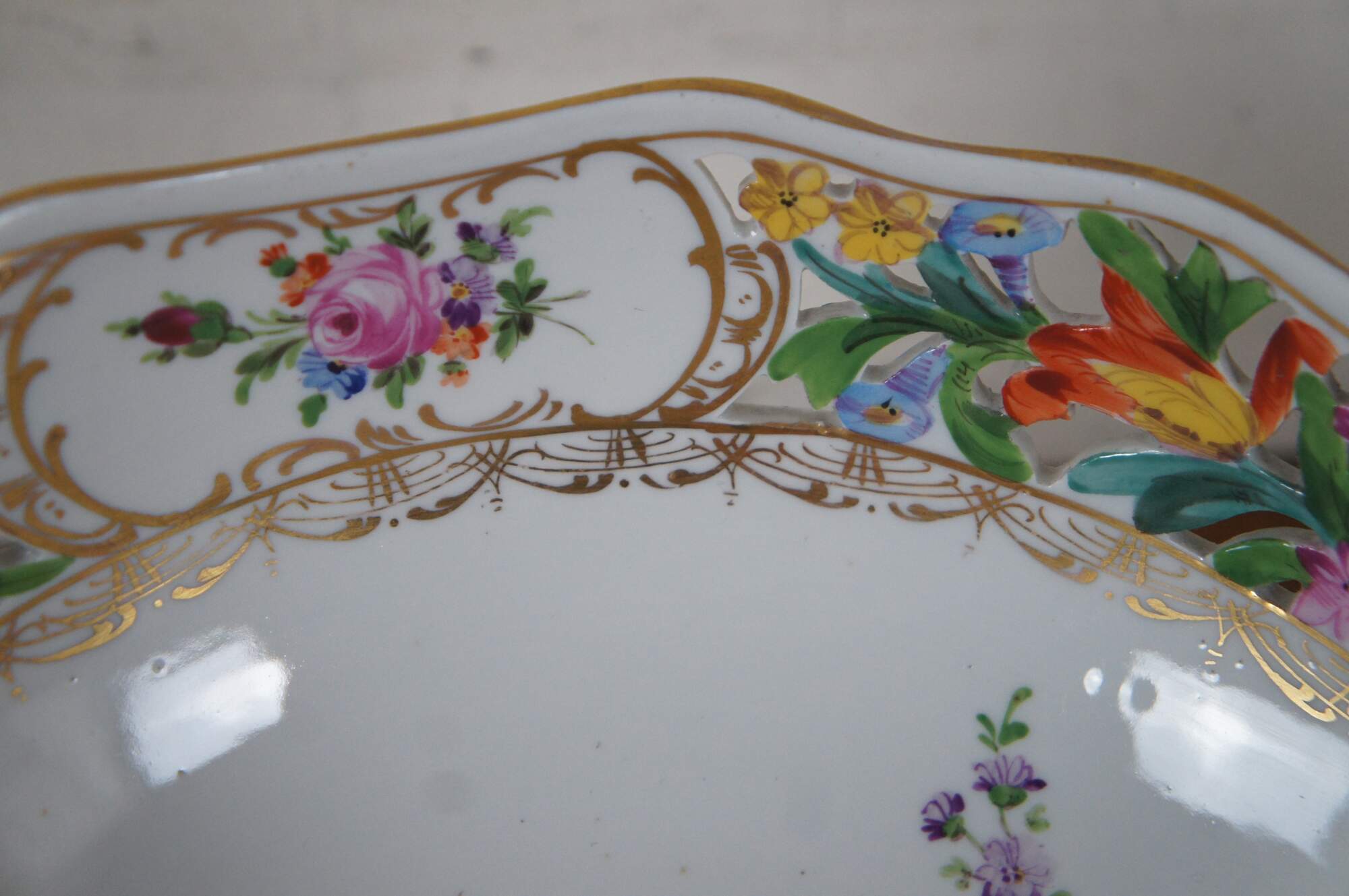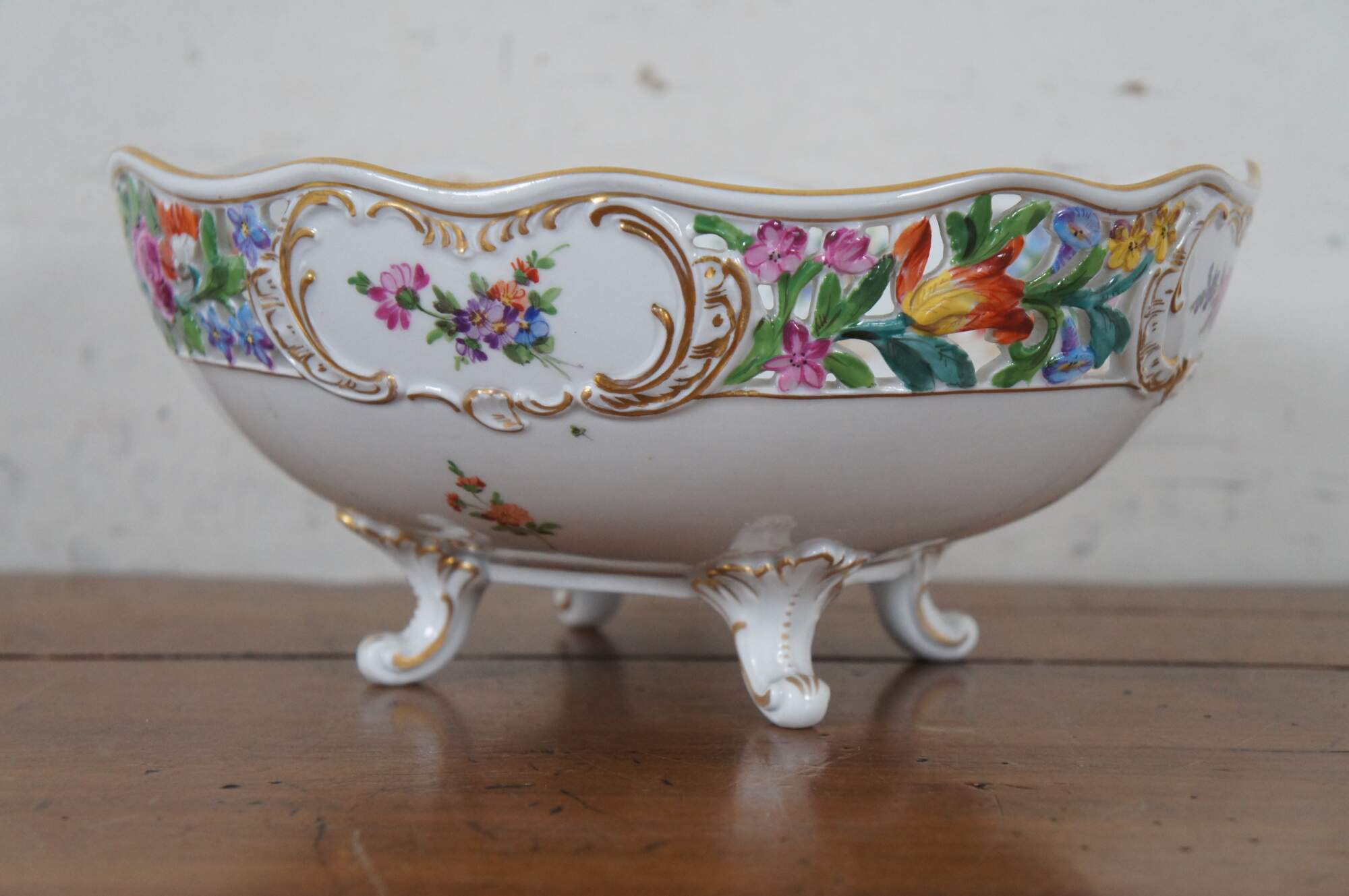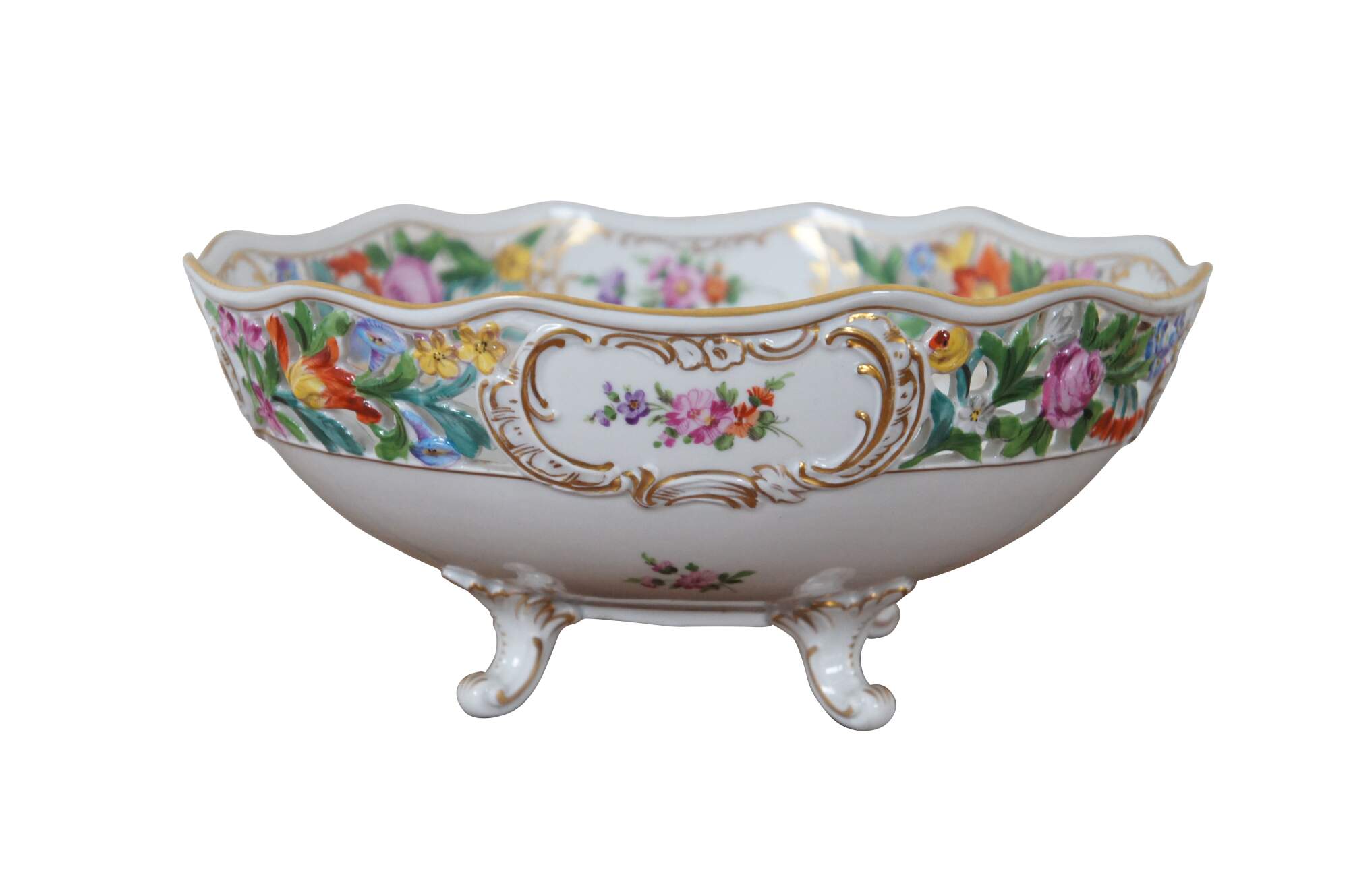 Antique Carl Thieme Dresden porcelain centerpiece bowl, basket or compote featuring round scalloped form with reticulated floral design and footed base.