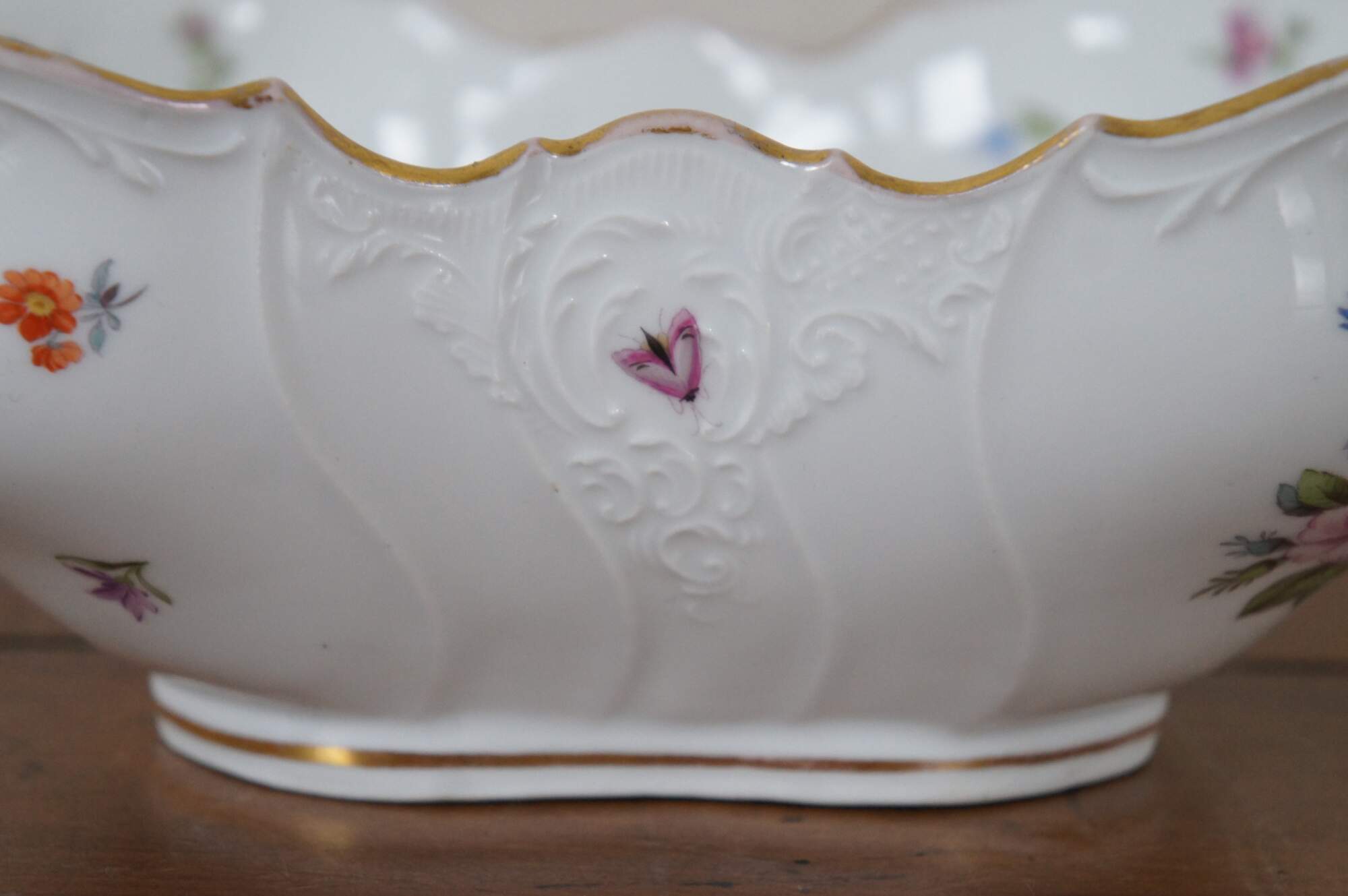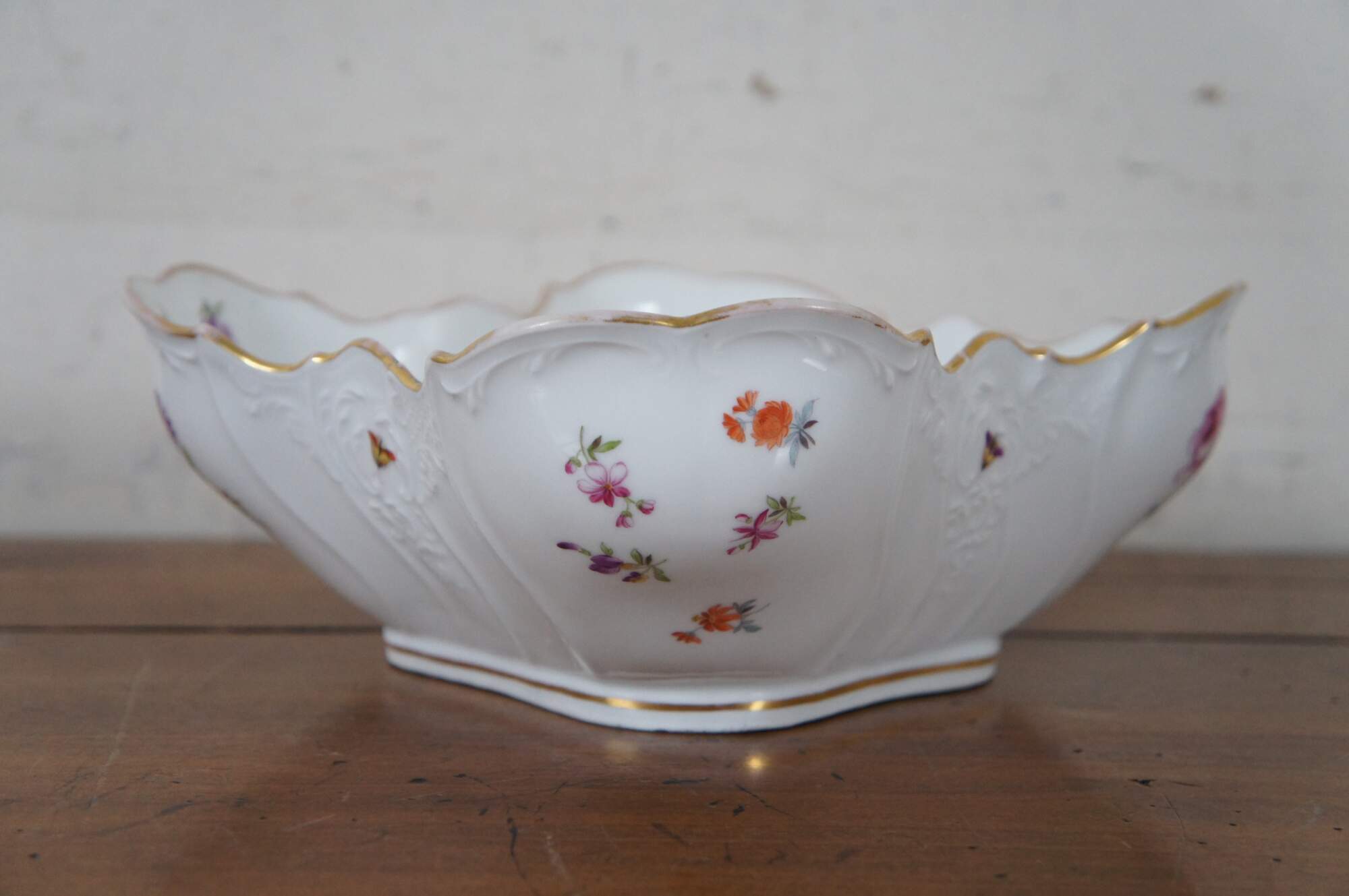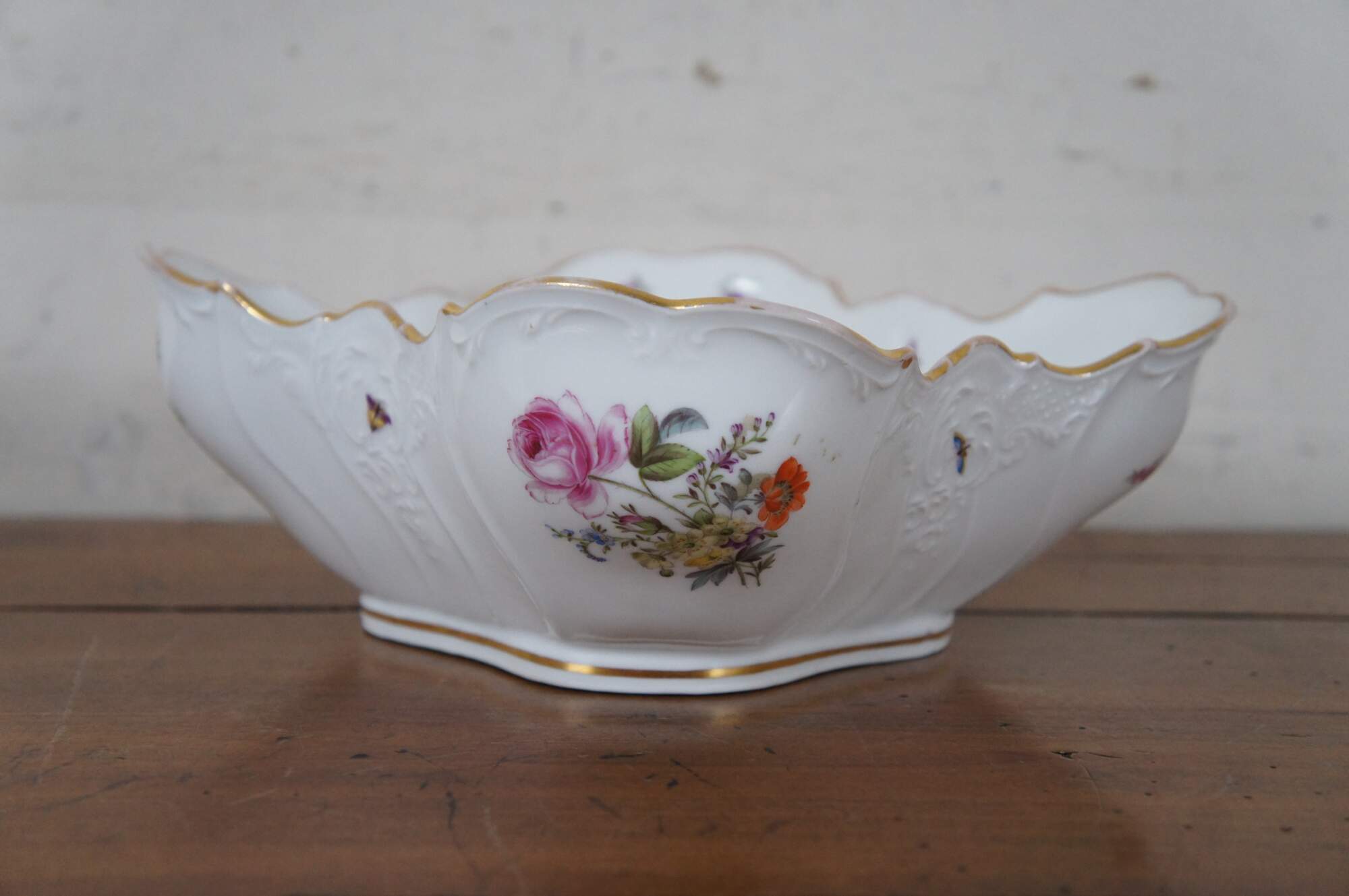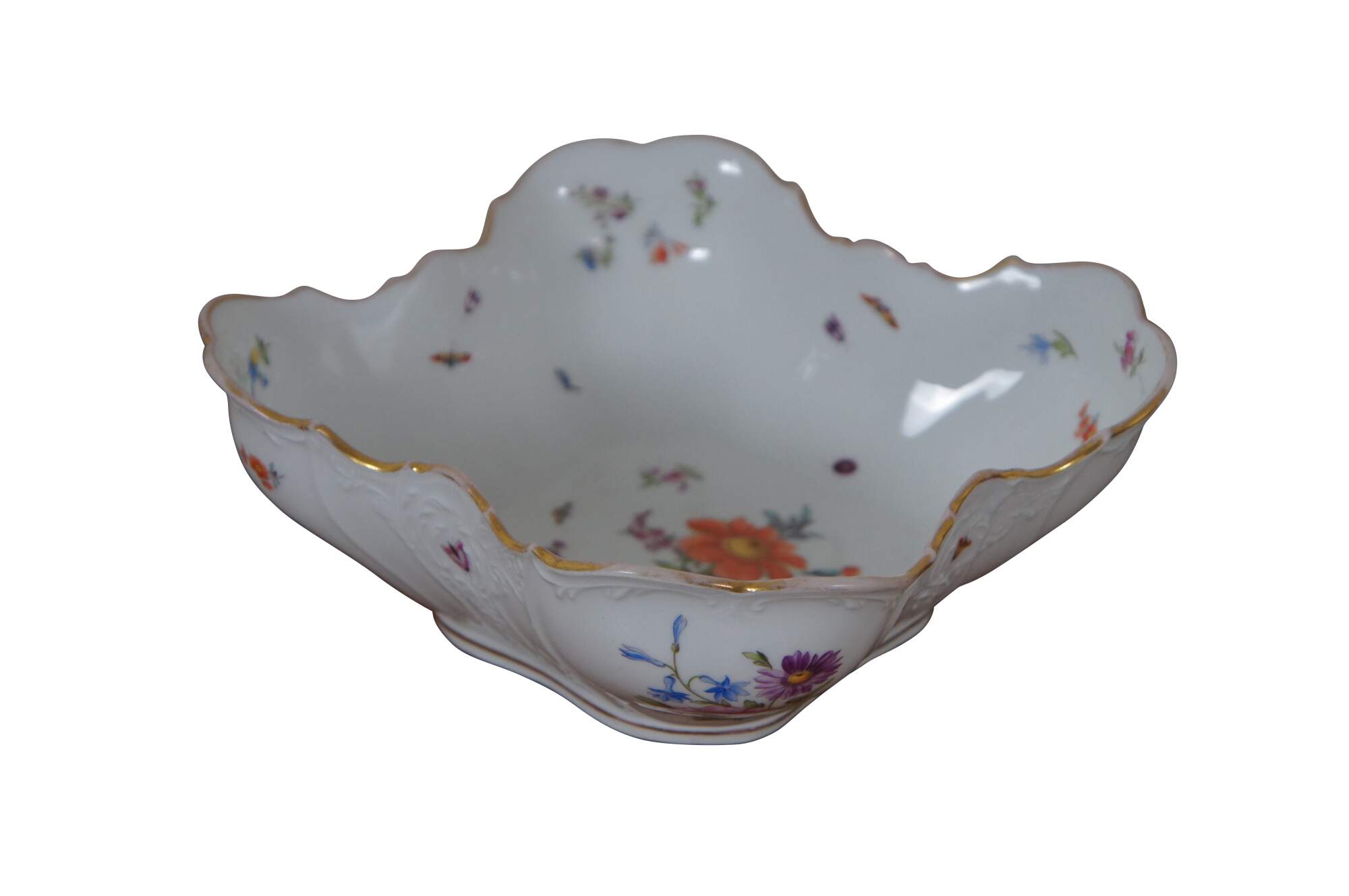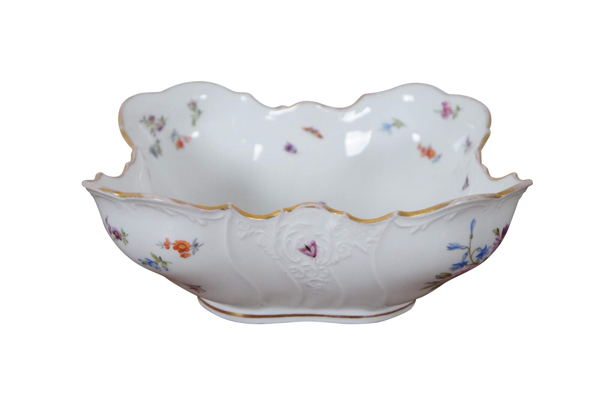 Antique German Dresden porcelain serving bowl or compote featuring square form with serpentine ruffled edge design, gold trim, flowers and insects (butterflies, ladybugs, moths).