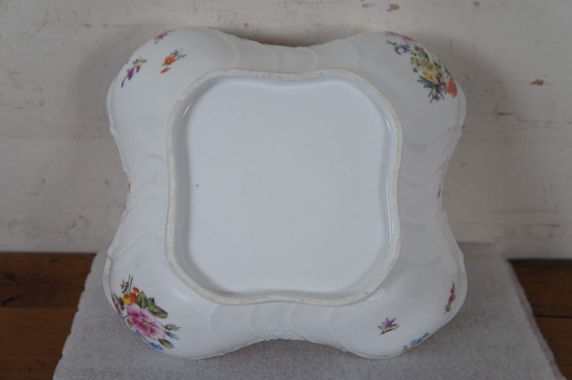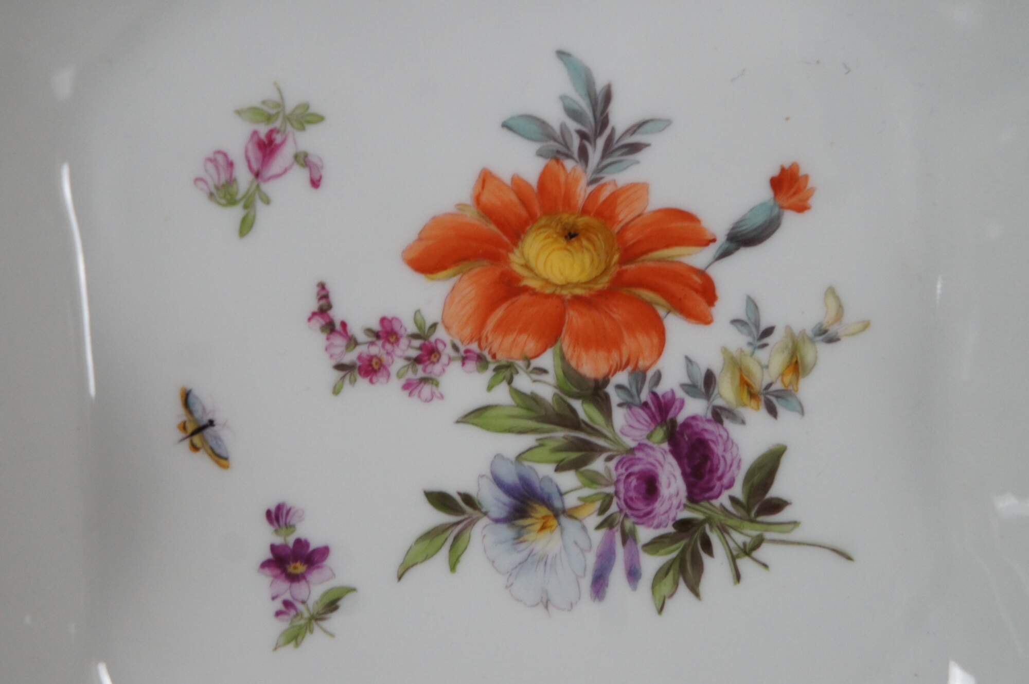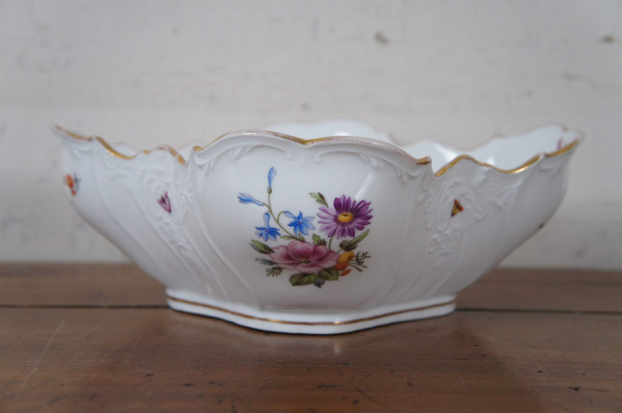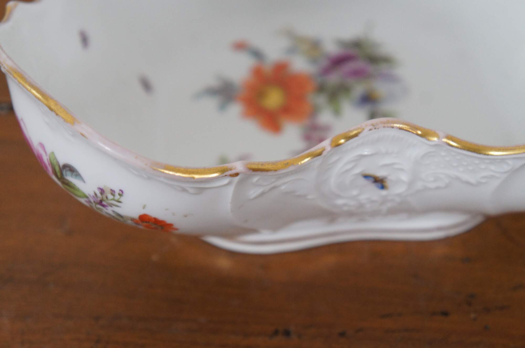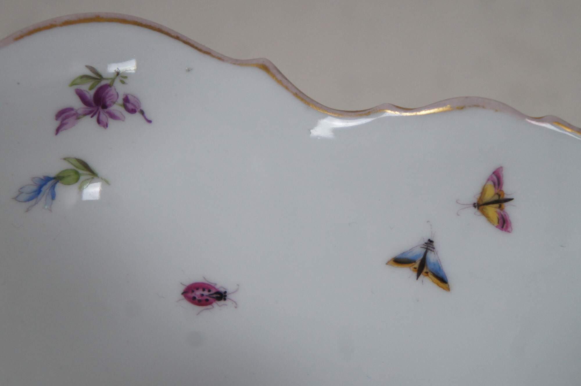Antique German Dresden porcelain serving bowl or compote featuring square form with serpentine ruffled edge design, gold trim, flowers and insects (butterflies, ladybugs, moths).
