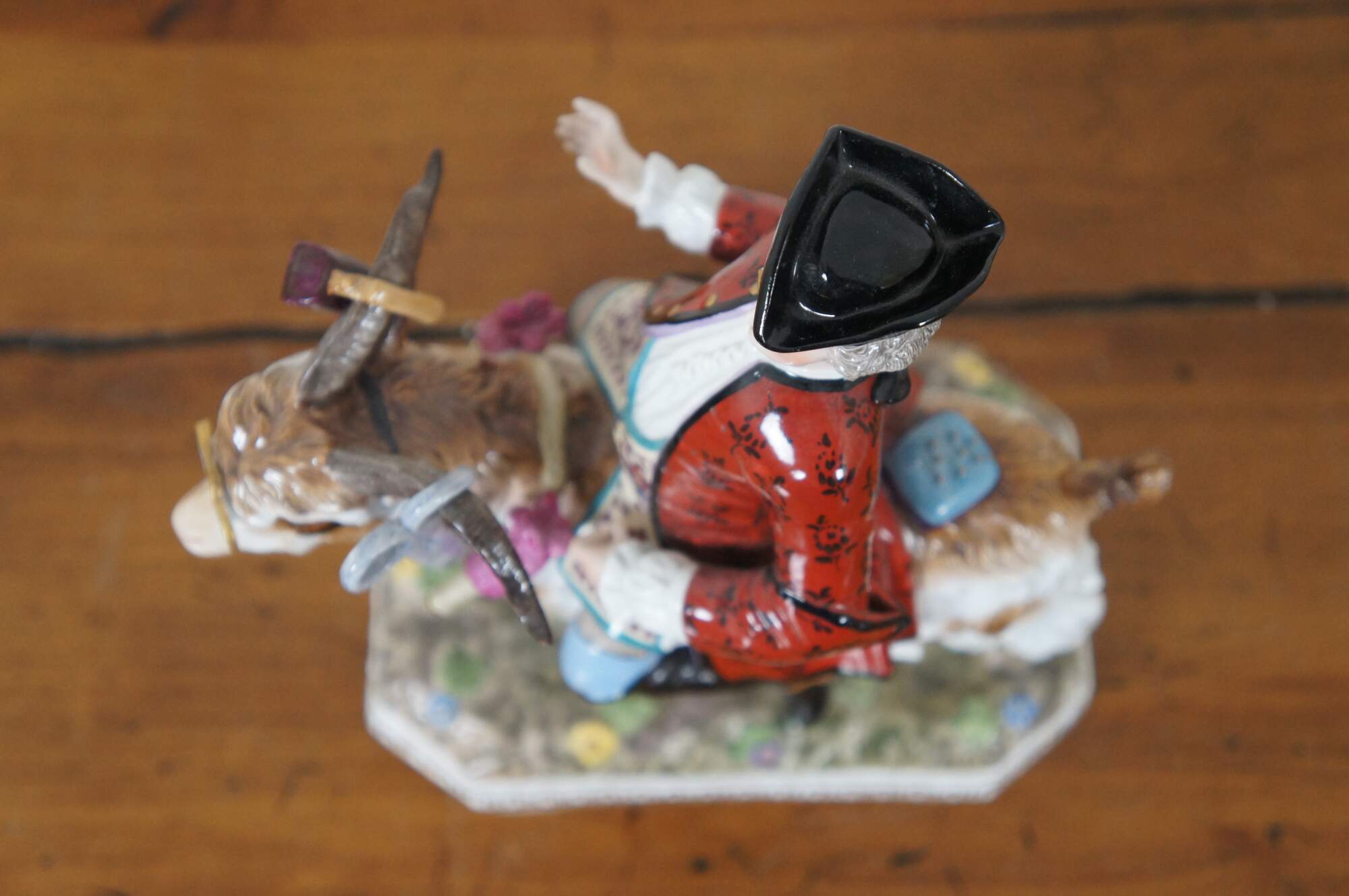 Antique 19th century Carl Thieme German Dresden porcelain polychrome figurine featuring Cout Bruhl's tailor (tailor of kings) on a goat. Modeled seated astride a billy-goat, the bewigged and bespectacled gentleman wearing a floral coat, boots and a tricorn hat, the tools of his trade all about him, including an iron and scissors hanging from the animal's horns and a pin-cushion on his rump.