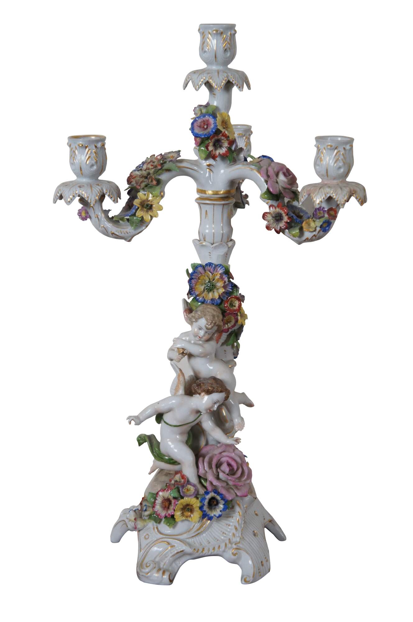 Exquisite pair of two antique German Dresden four light convertable candlesticks or candleabras by Von Schierholz porcelain factory featuring a colorful high relief cherubs / puttis / angels and floral theme.