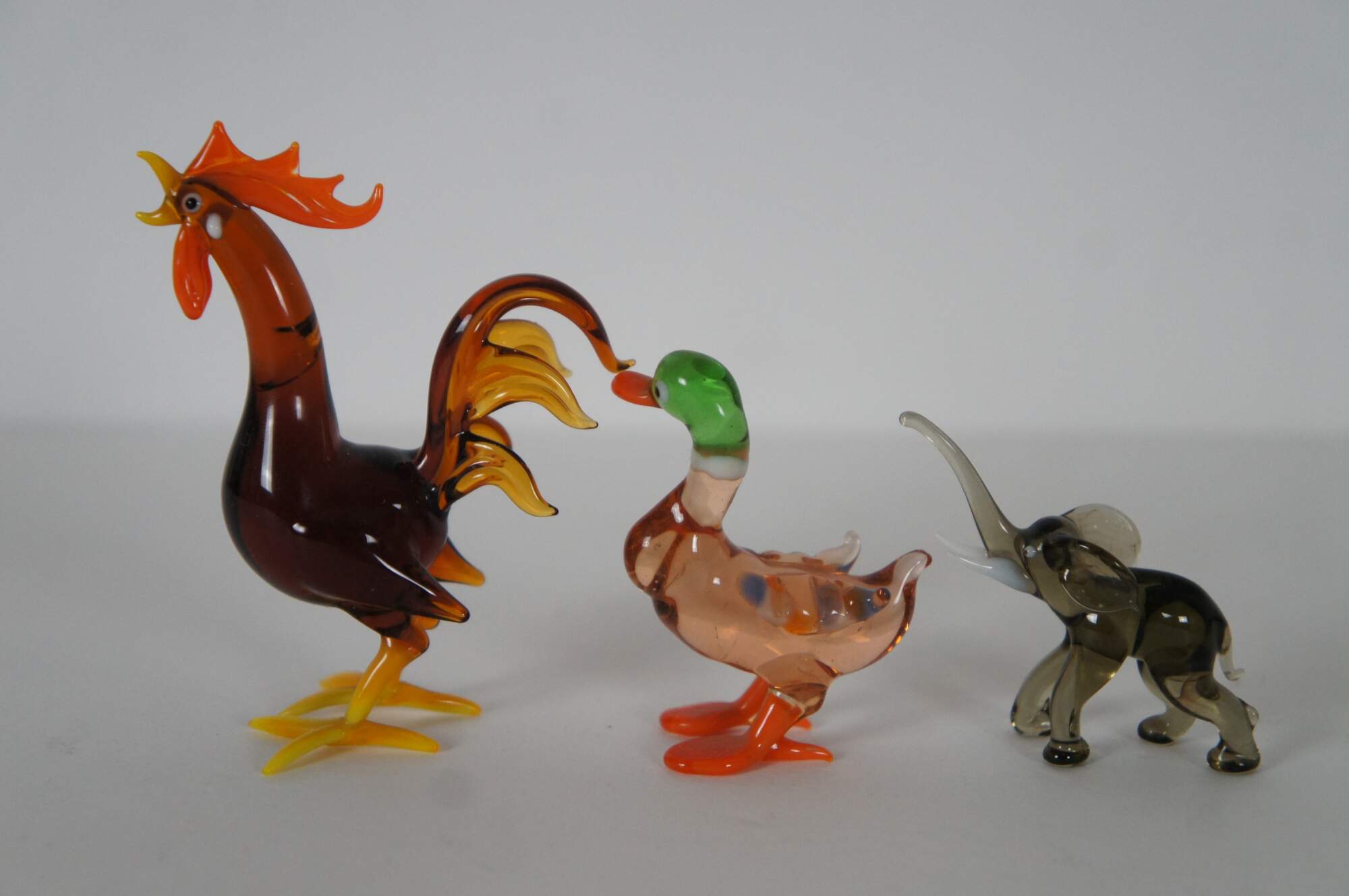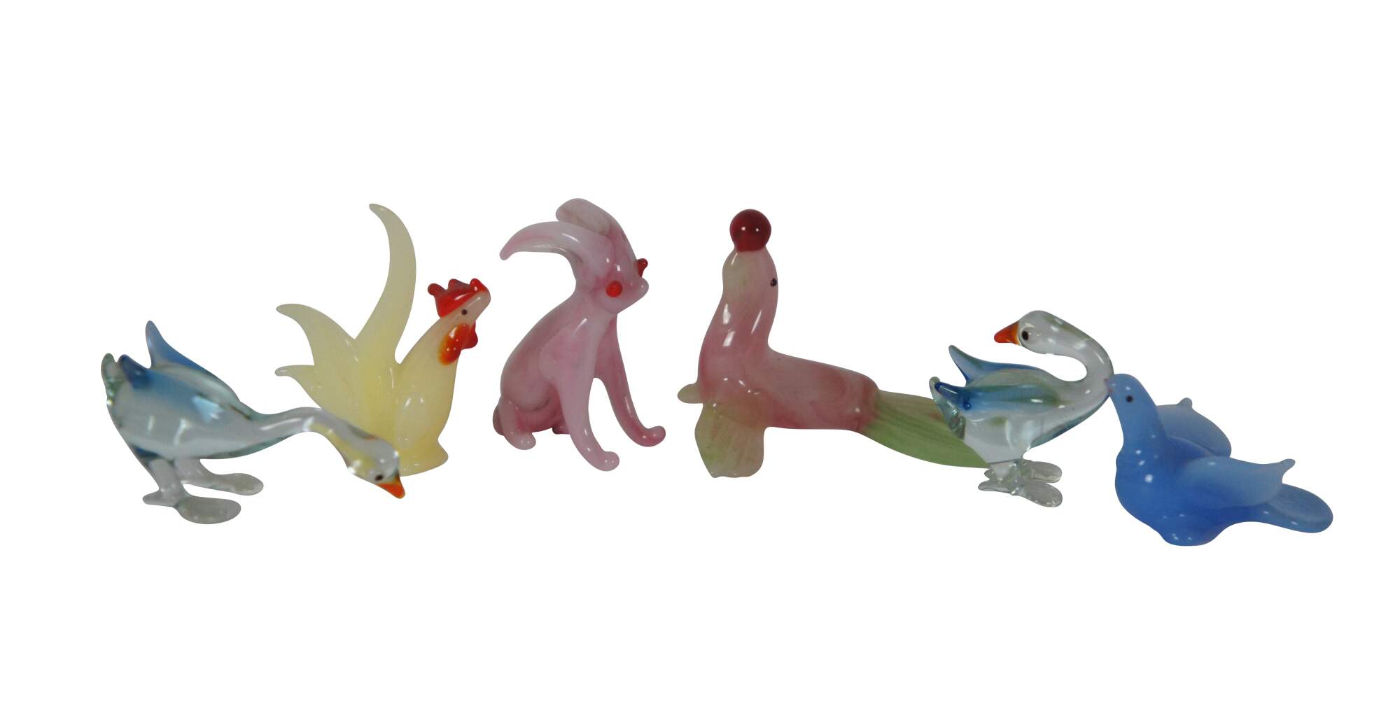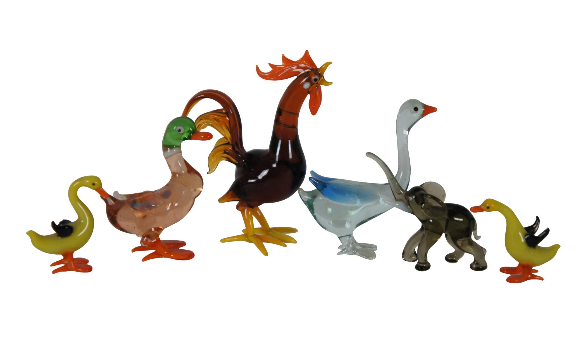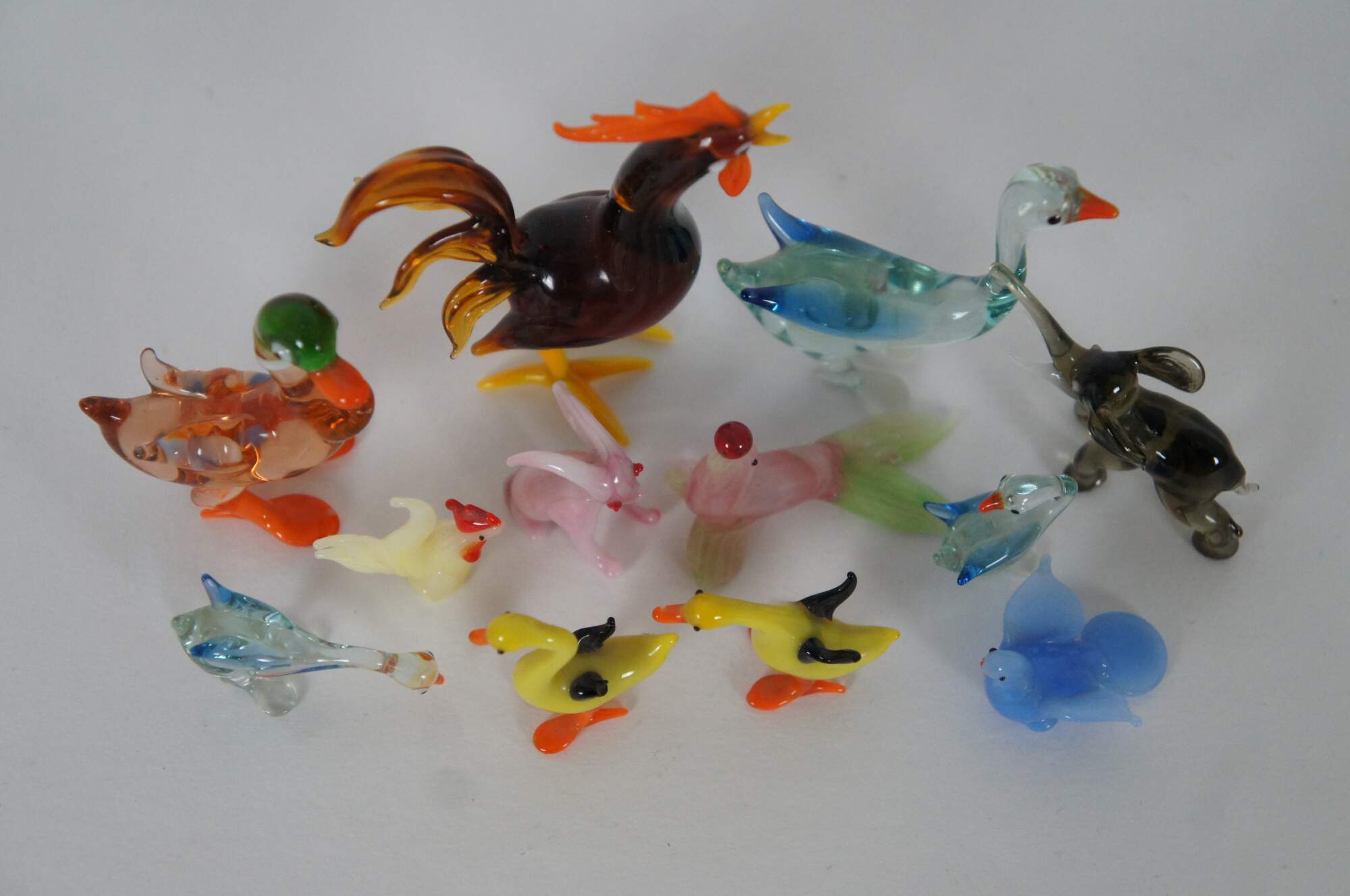 Vintage lot of twelve farmhouse ornament / figurine animals, hand blown in various colors and designs. Includes Rooster, Chicken, Geese / Goose, Rabbit, Seal / Sea Lion, Dove, Ducks, and Elephant.