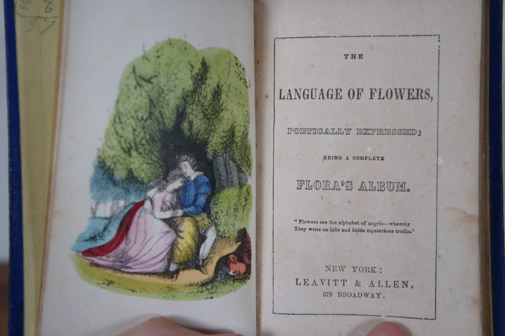 Antique leather bound Language of Flowers Floras Album poems, Leavitt & Allen, circa 1850s. Presented to a friend November 8th, 1861.