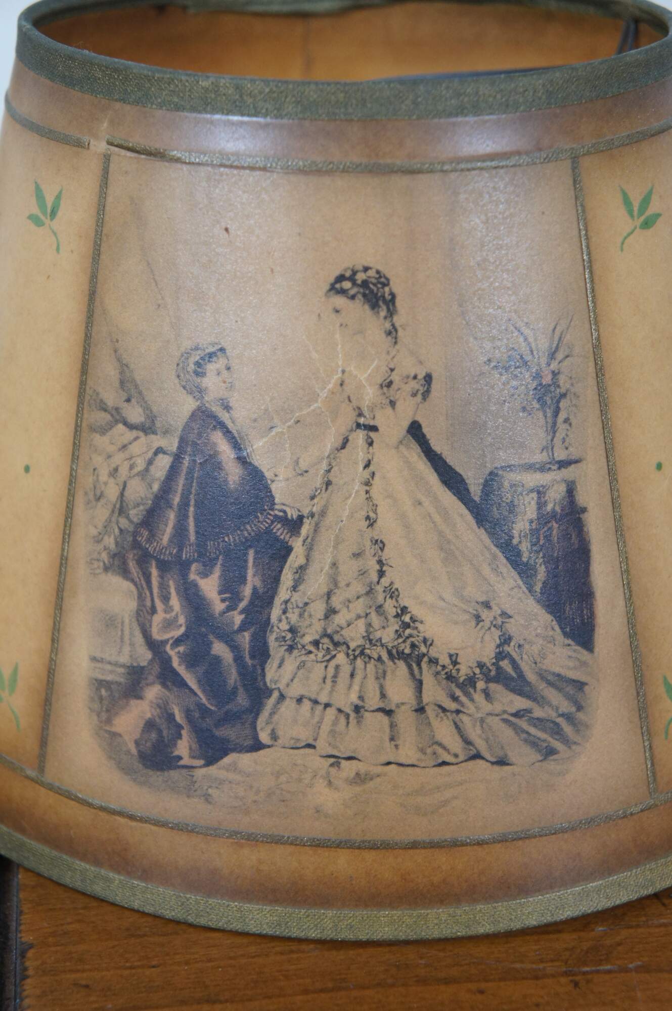 Fair condition, finish loss / tarnish, body of lamp is bent, loose drop finial, wear to shade.