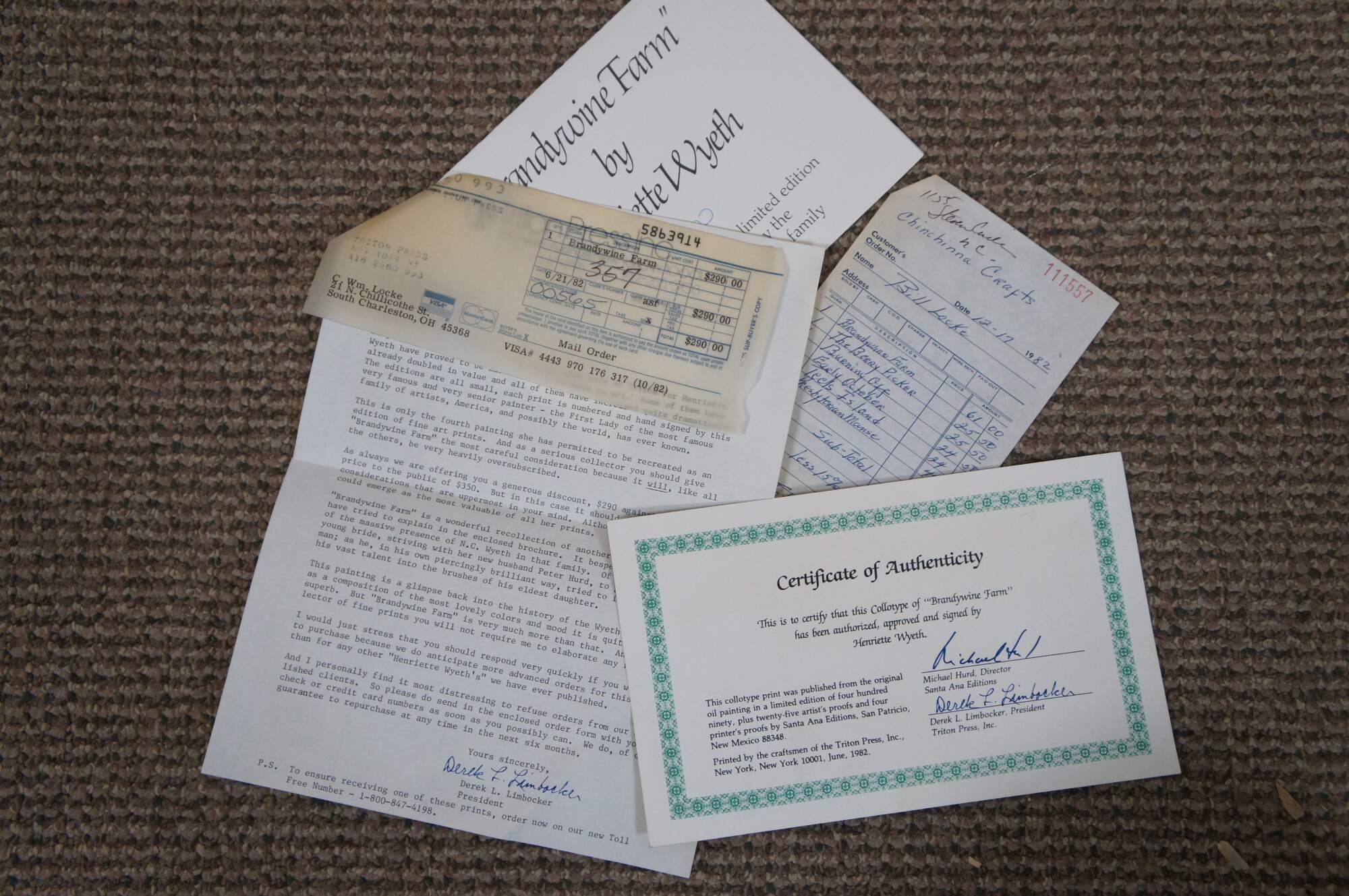 Vintage Henriette Wyeth farmhouse landscape collotype print titled Brandywine Farm. Includes Certificate of Authenticity, numbered 357/490. Purchased circa 1982. Published by Santa Ana Editions, San Patricio New Mexico, Trinton Press Inc.
