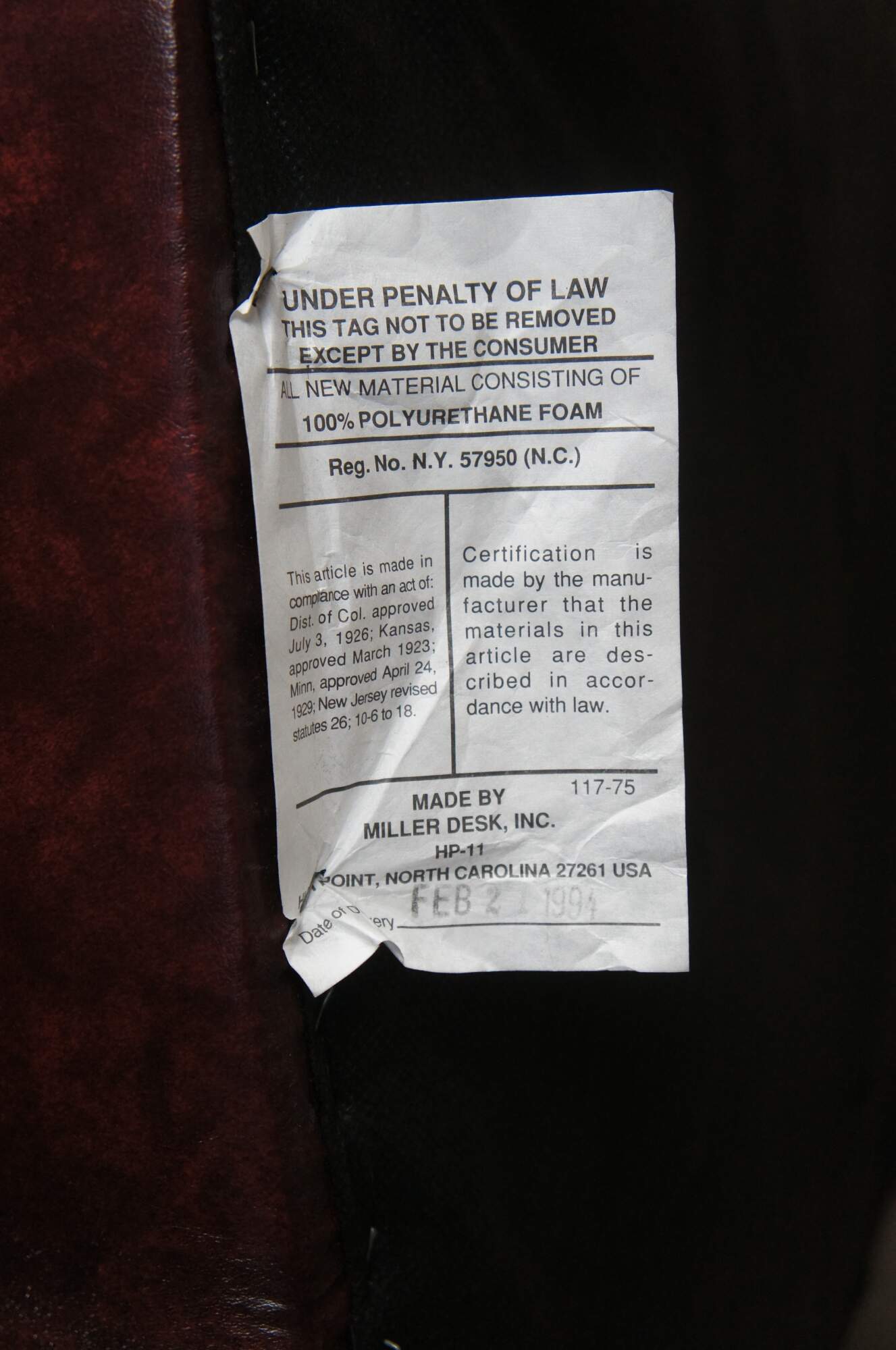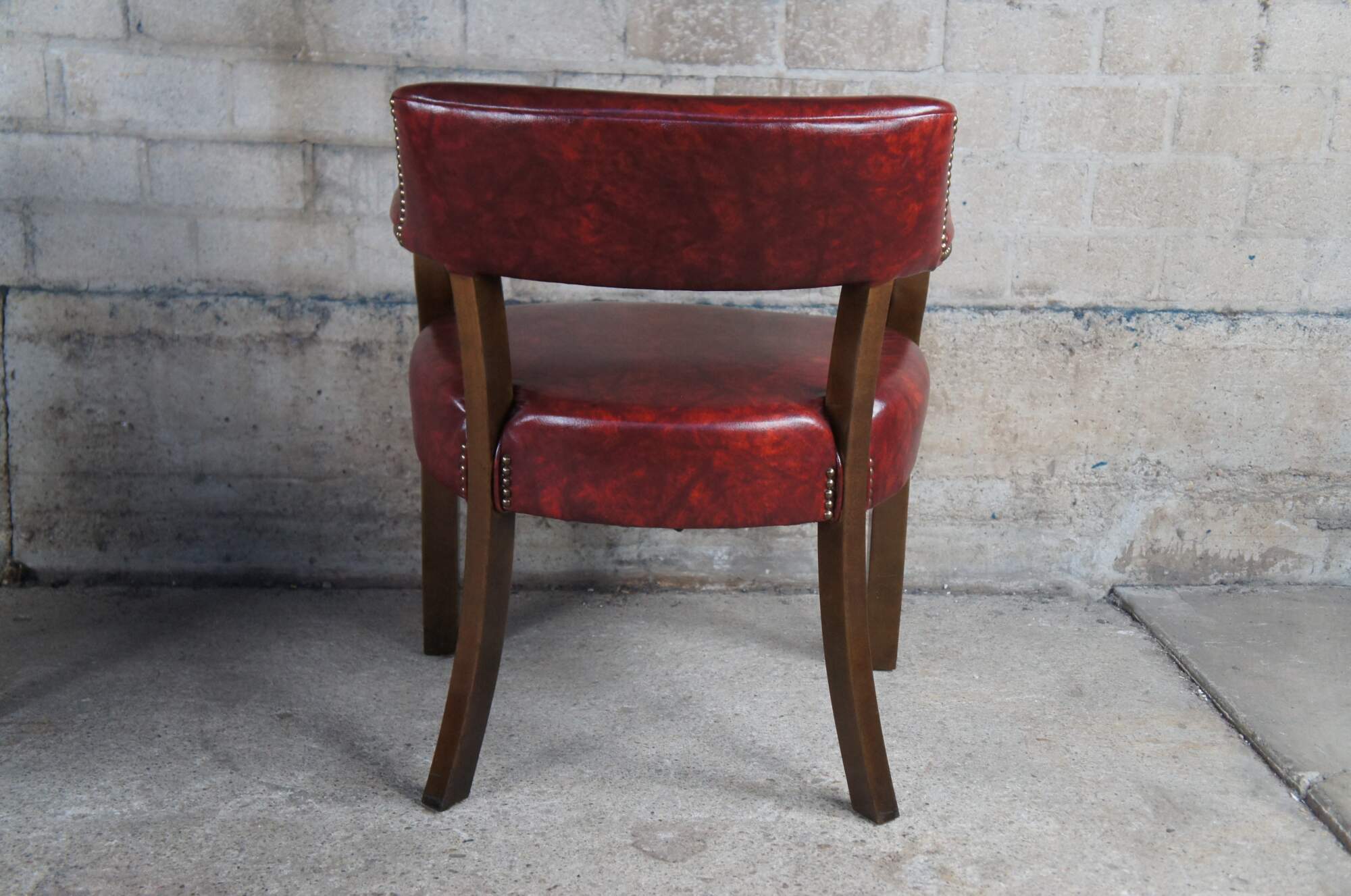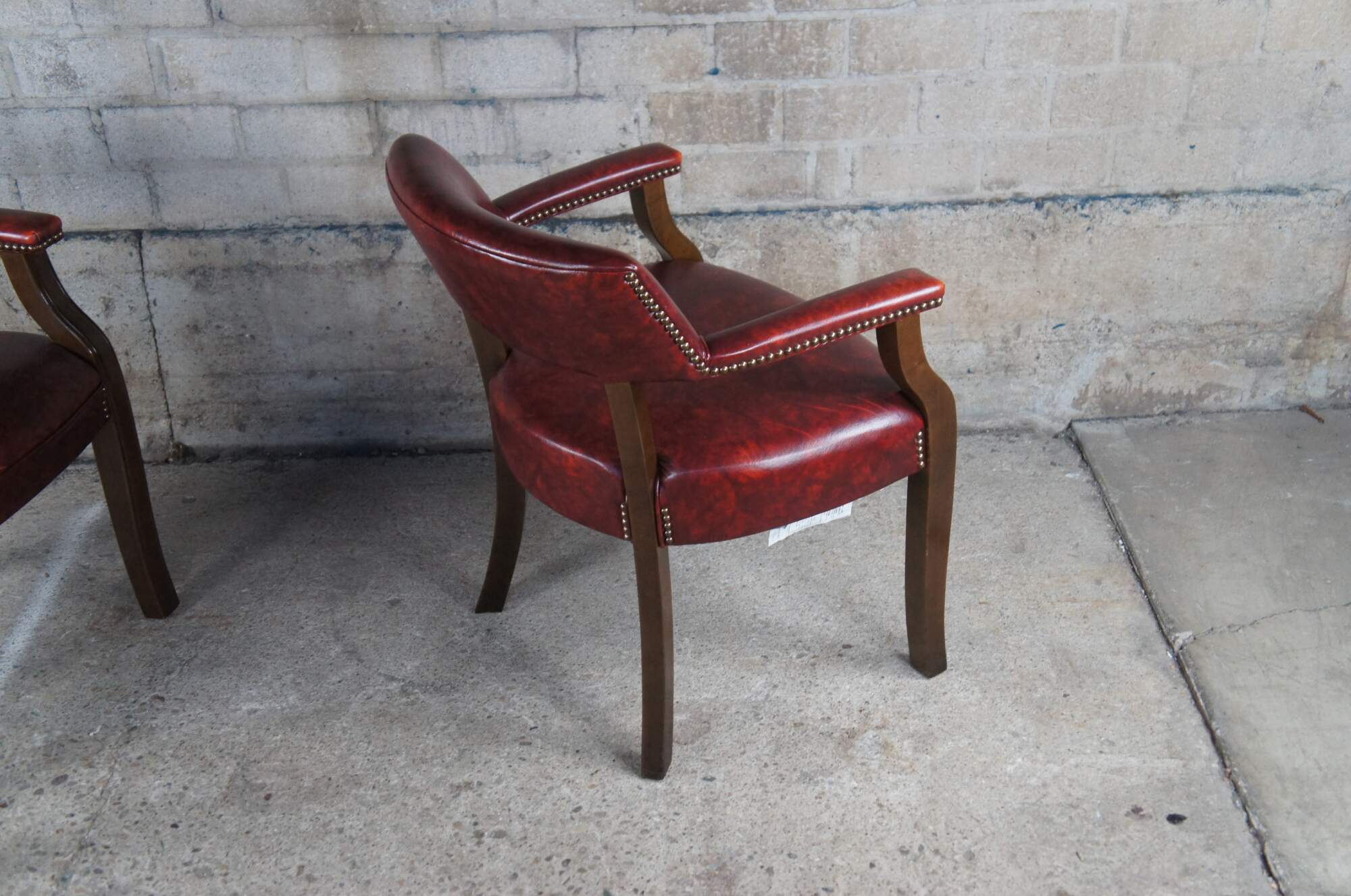 Vintage pair of two office armchairs featuring red vinyl upholstery with nailhead trim. Made by Miller Desk Inc of High Point North Carolina, circa 1994.
