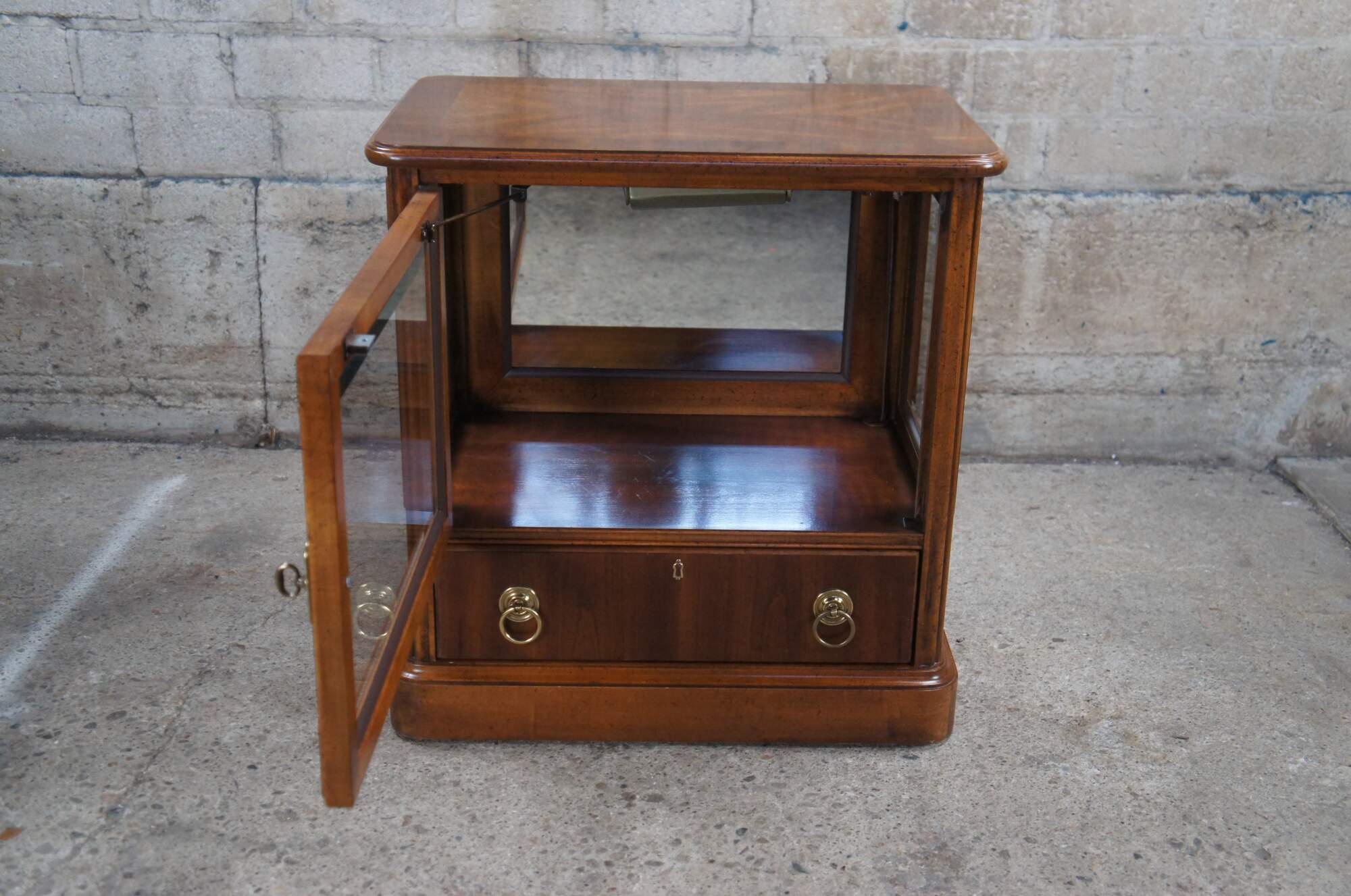 Vintage curio display cabinet / side table / apothecary vitrine. Made of mahogany featuring upper beveled glass cabinet with lower drawer and brass hardware.