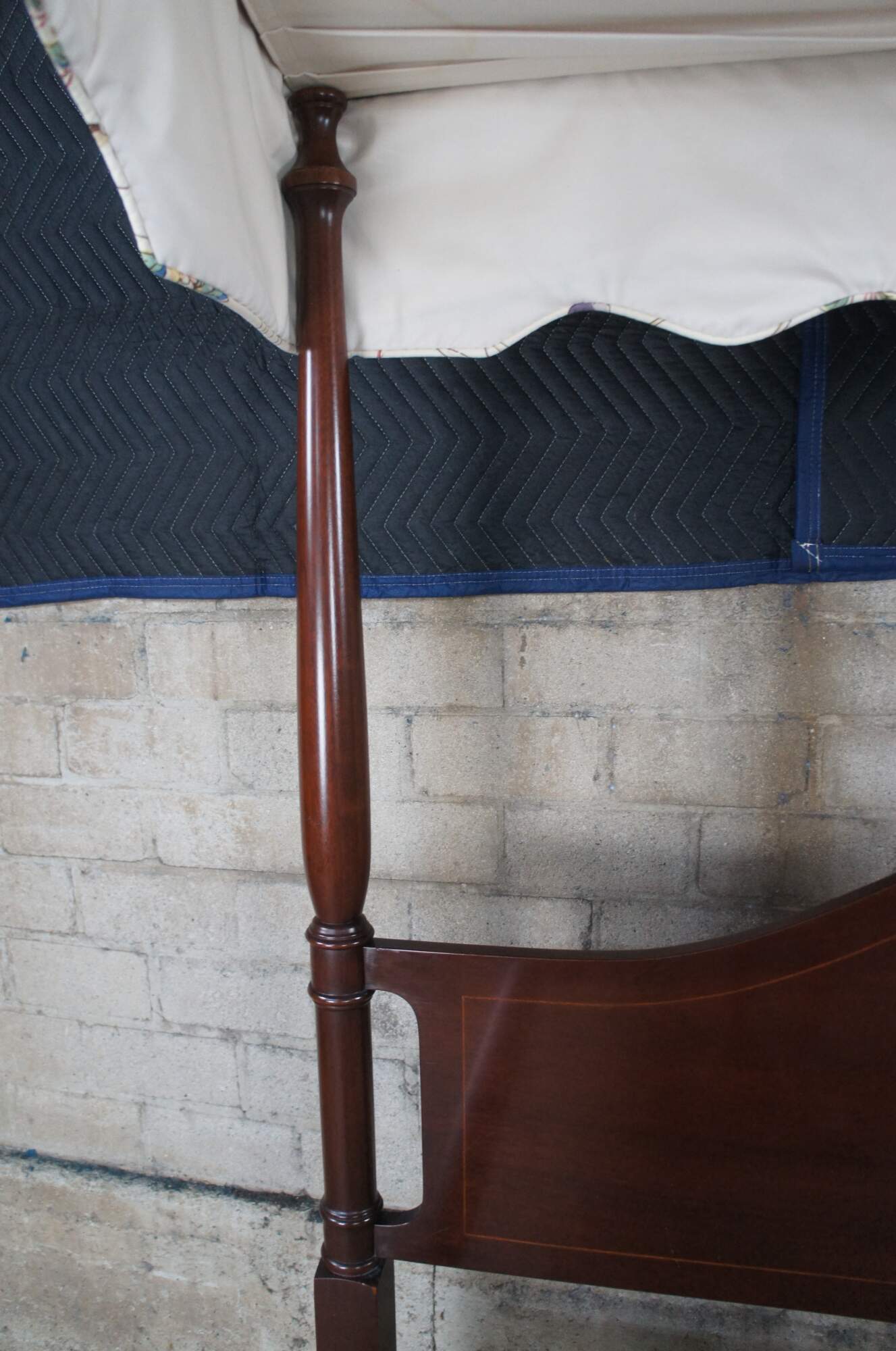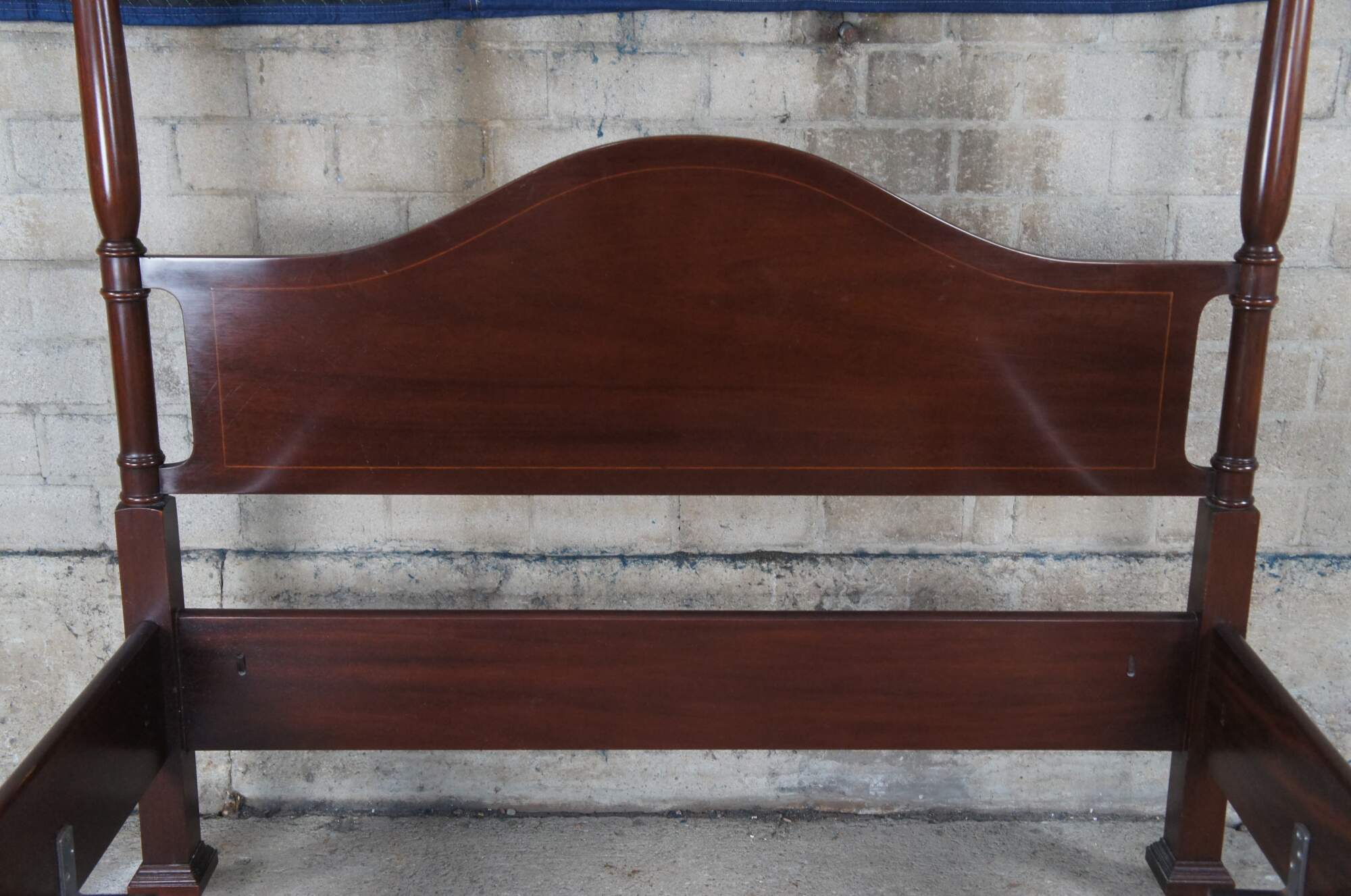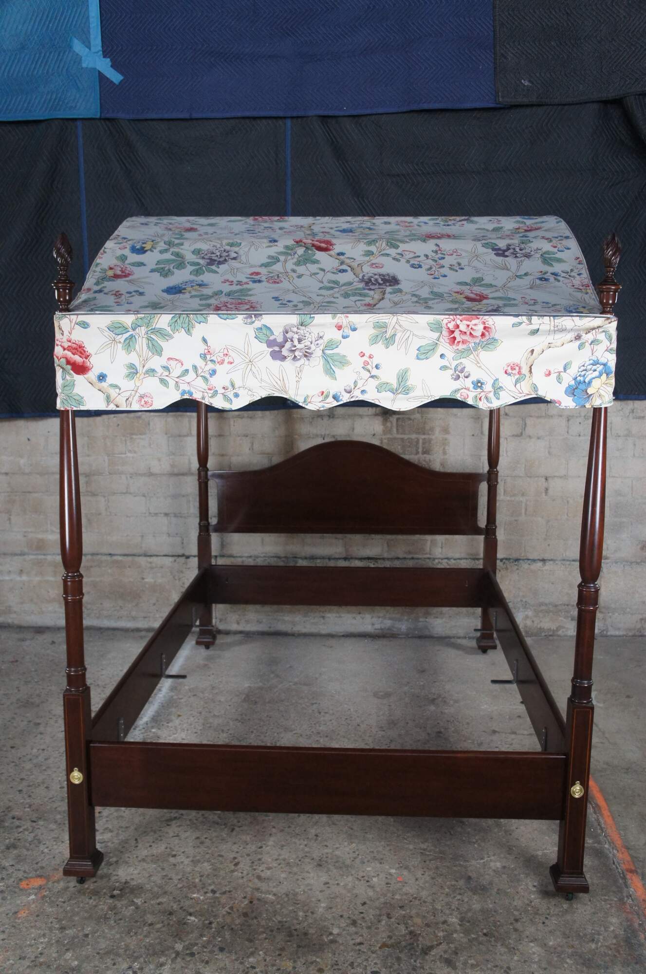 An impressive 20th Century inlaid mahogany four poster double size tester bed featuring Hepplewhite and colonial styling. Features a camelback, through bolts and trophy cup turned and carved spire finials. Includes a crewel style serpentine canopy with pleated silk lining, matching bedding, skirt and 2 accent pillows. The bed is on removable casters for ease of movement. Originally purchased from William Sauer Associates Interior Design in Bethesda MD circa 1983.