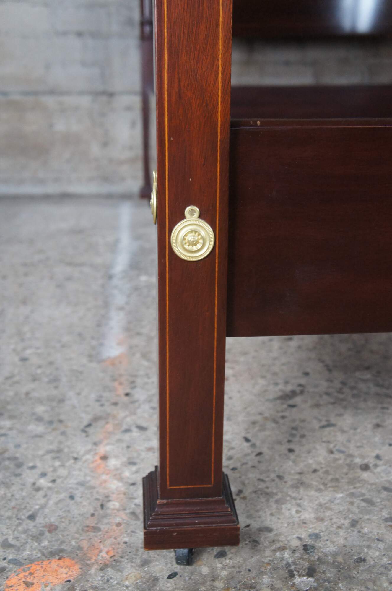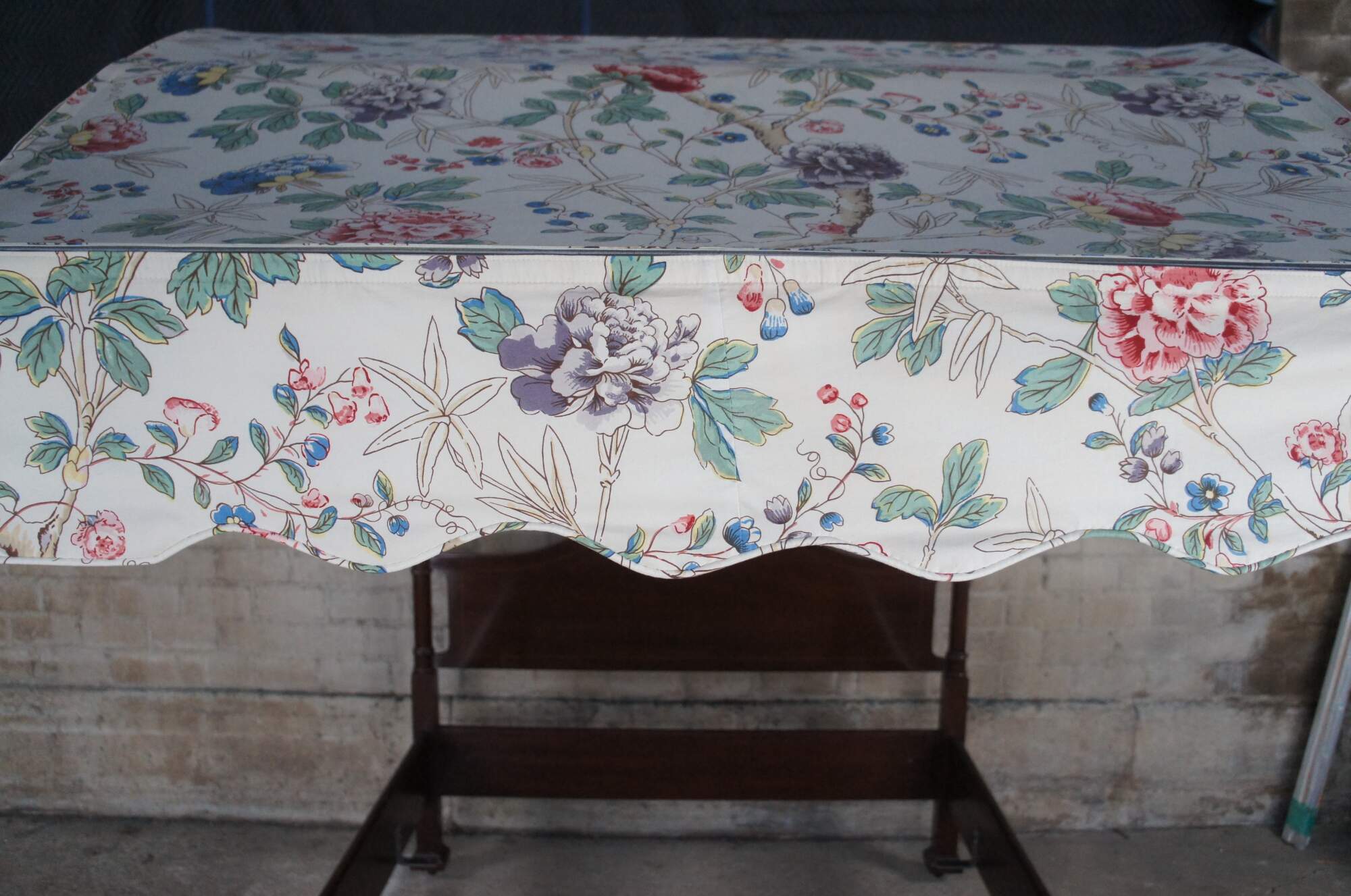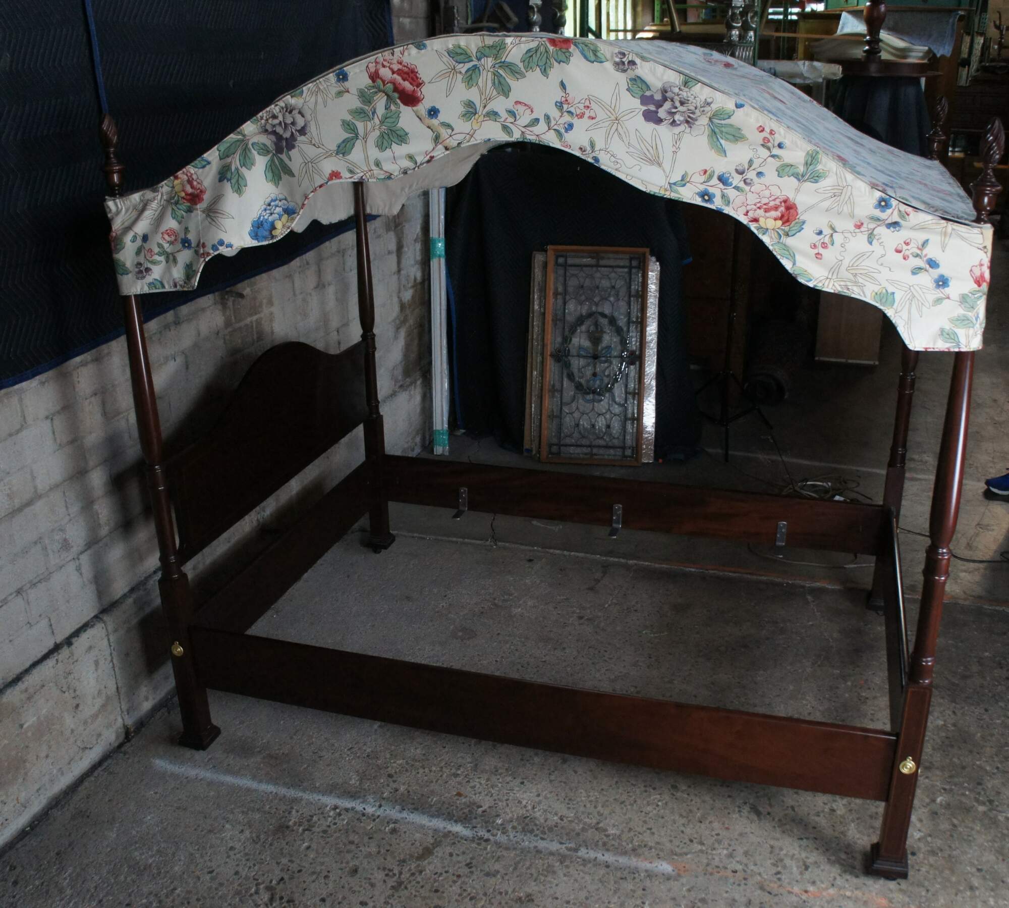An impressive 20th Century inlaid mahogany four poster double size tester bed featuring Hepplewhite and colonial styling. Features a camelback, through bolts and trophy cup turned and carved spire finials. Includes a crewel style serpentine canopy with pleated silk lining, matching bedding, skirt and 2 accent pillows. The bed is on removable casters for ease of movement. Originally purchased from William Sauer Associates Interior Design in Bethesda MD circa 1983.