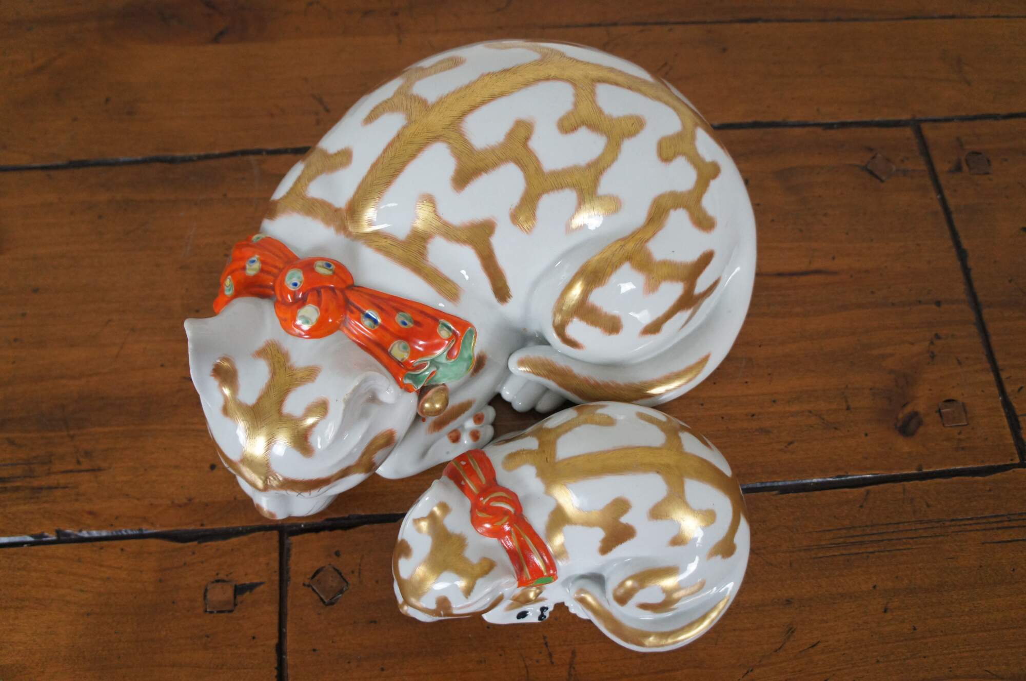 Antique porcelain Imari sleeping cat and kitten figurines featuring gold accents and red bandana with bells.