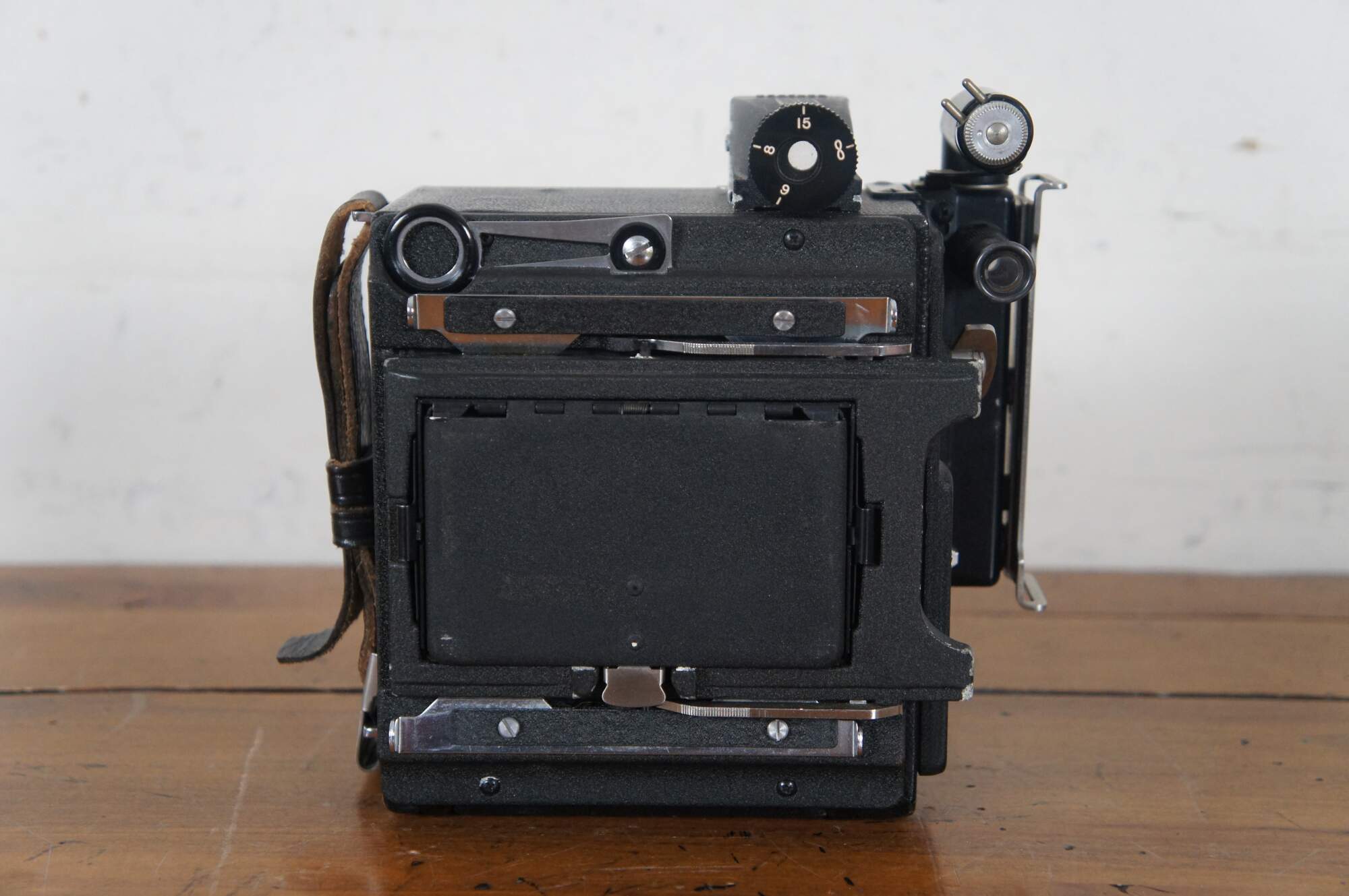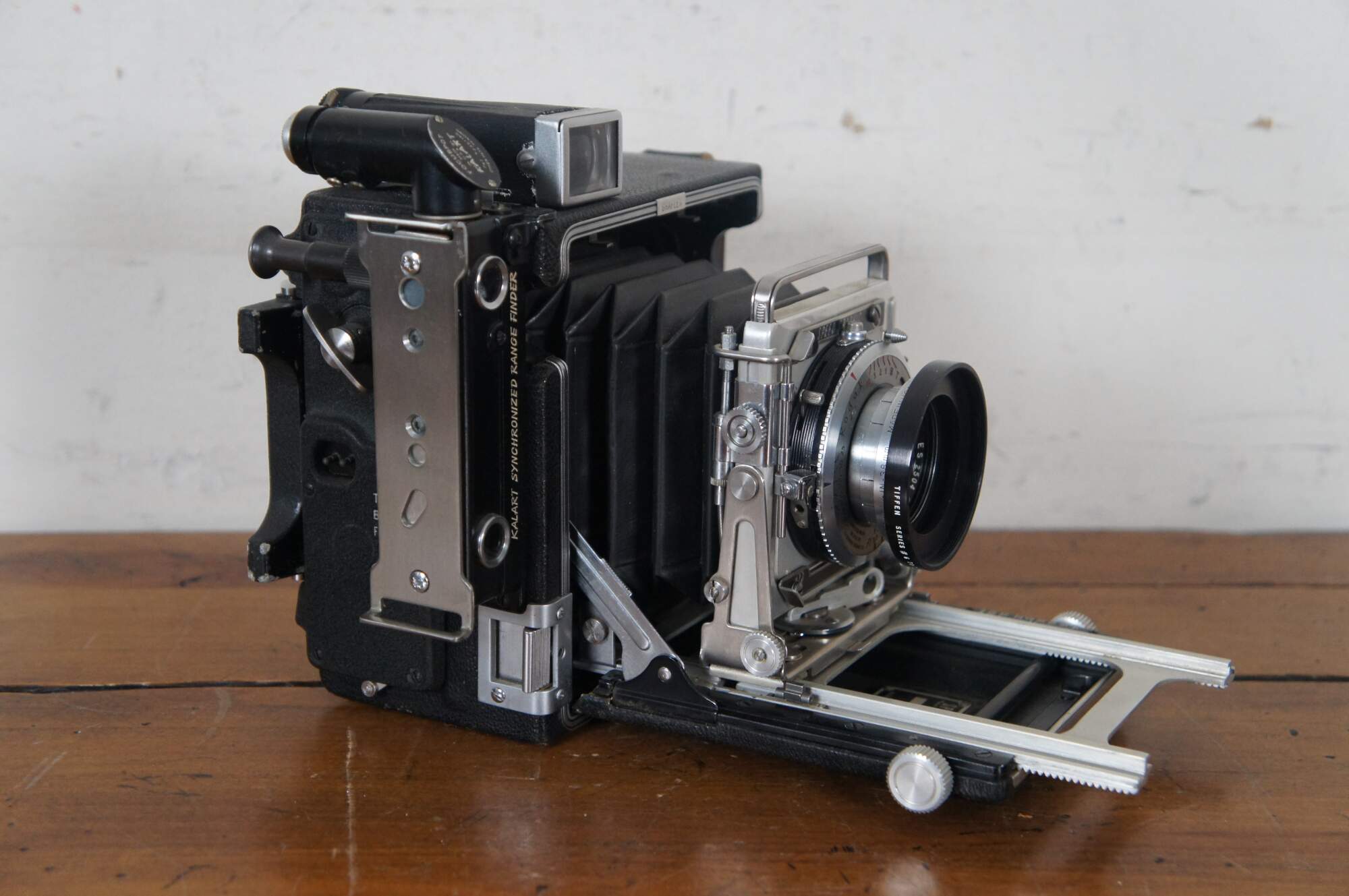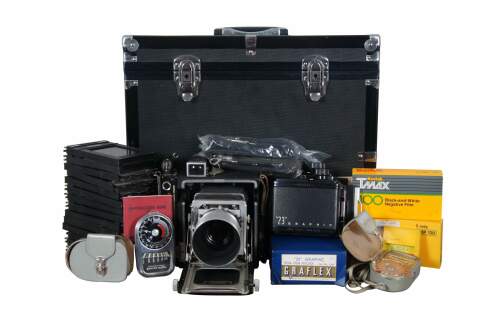 Vintage Graflex Speed Graphic camera with Kodak Ektar 3.7 105mm lens. Comes with Kalart Focuspot sychronized range finder. Contemporary case with 2 new straps/key sets; 14 Lisco Regal 2 1/4 x 3 1/4 Cut Film Holders; 2 Graflex "23" Graphic Roll Film Holders Cat. No. 1246; un-opened Kodak Tri-X Pan Professional 5 Rolls TXP 120 black and white film; un-opened Kodak Tmax 400 TMY 120 black and white negative film; Series VII Kodak Lens Hood; Tiffen Series #6 to 7 Step-Up Ring; Kodak Series VI Adapter Ring 1 1/2 in - 38mm; Kodak Ektar f:3.7 105mm ES 2504 lens; Kodak Wratten Filter Series 7 K2-#8; Weston Master III Universal Exposure Meter Model 737 Serial #1236449 & Case; Weston Master V Universal Exposure Meter Model 748 Serial #HB773