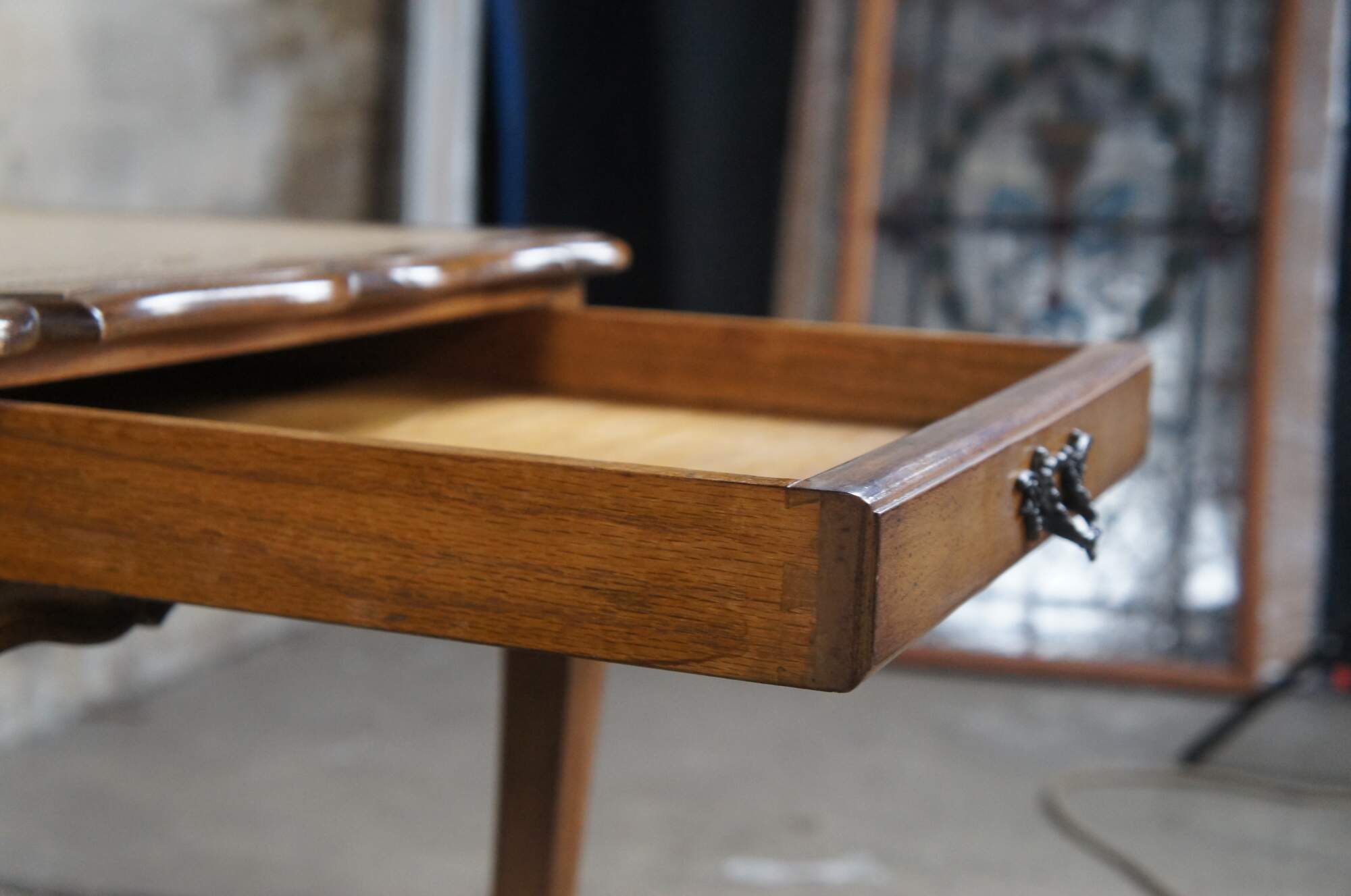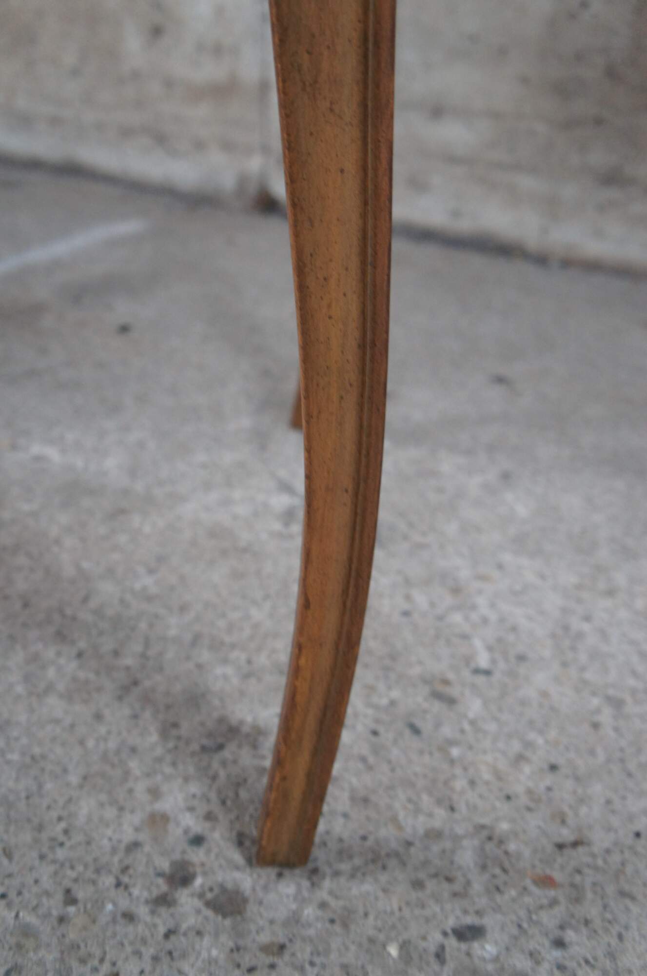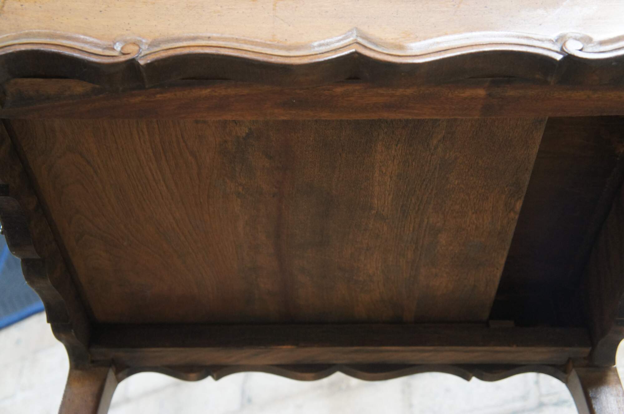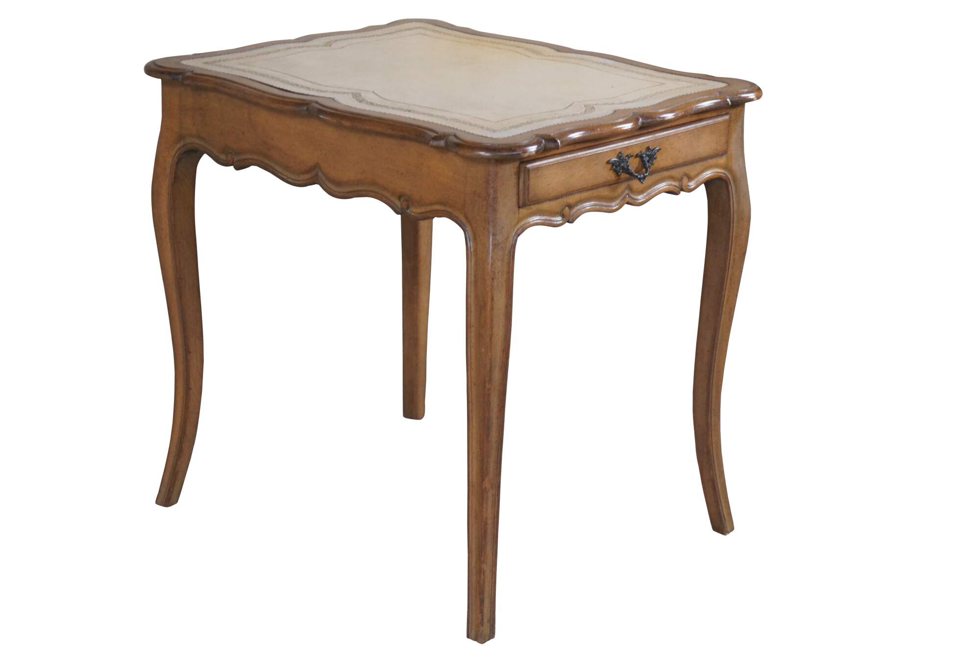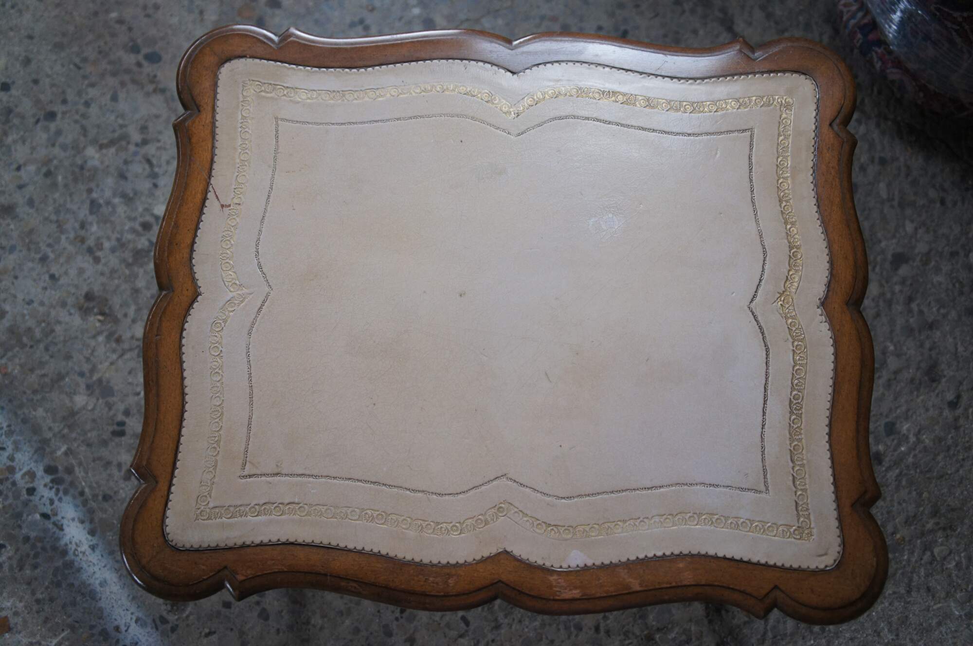 Two vintage French Provincial / Louis XV style side accent tables, circa 1960s. Made of walnut featuring serpentine form with inlaid tooled leather top, slender dovetailed storage drawer and cabriole legs.