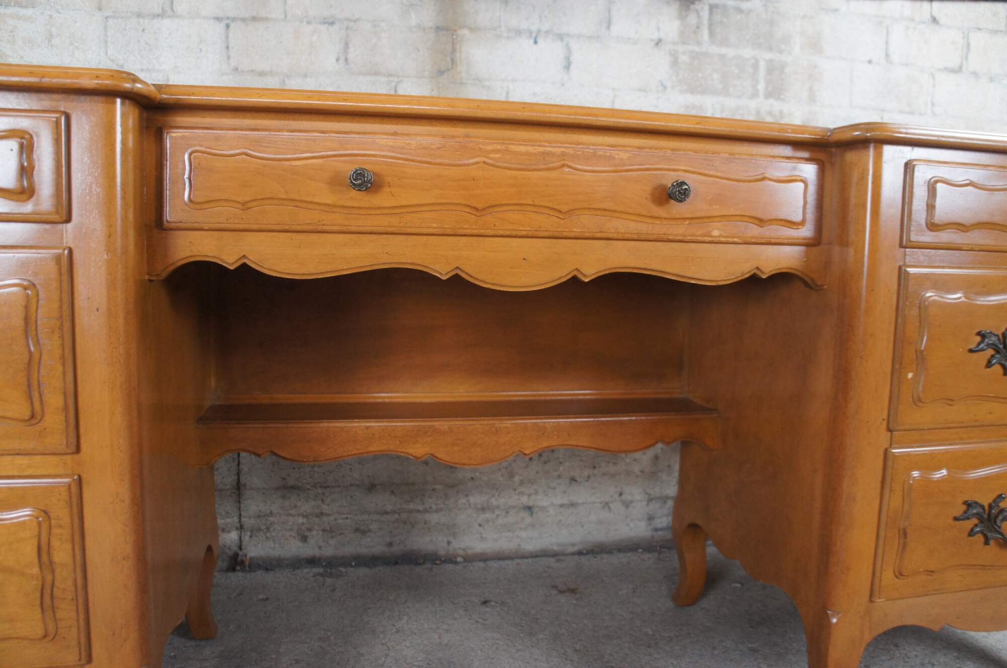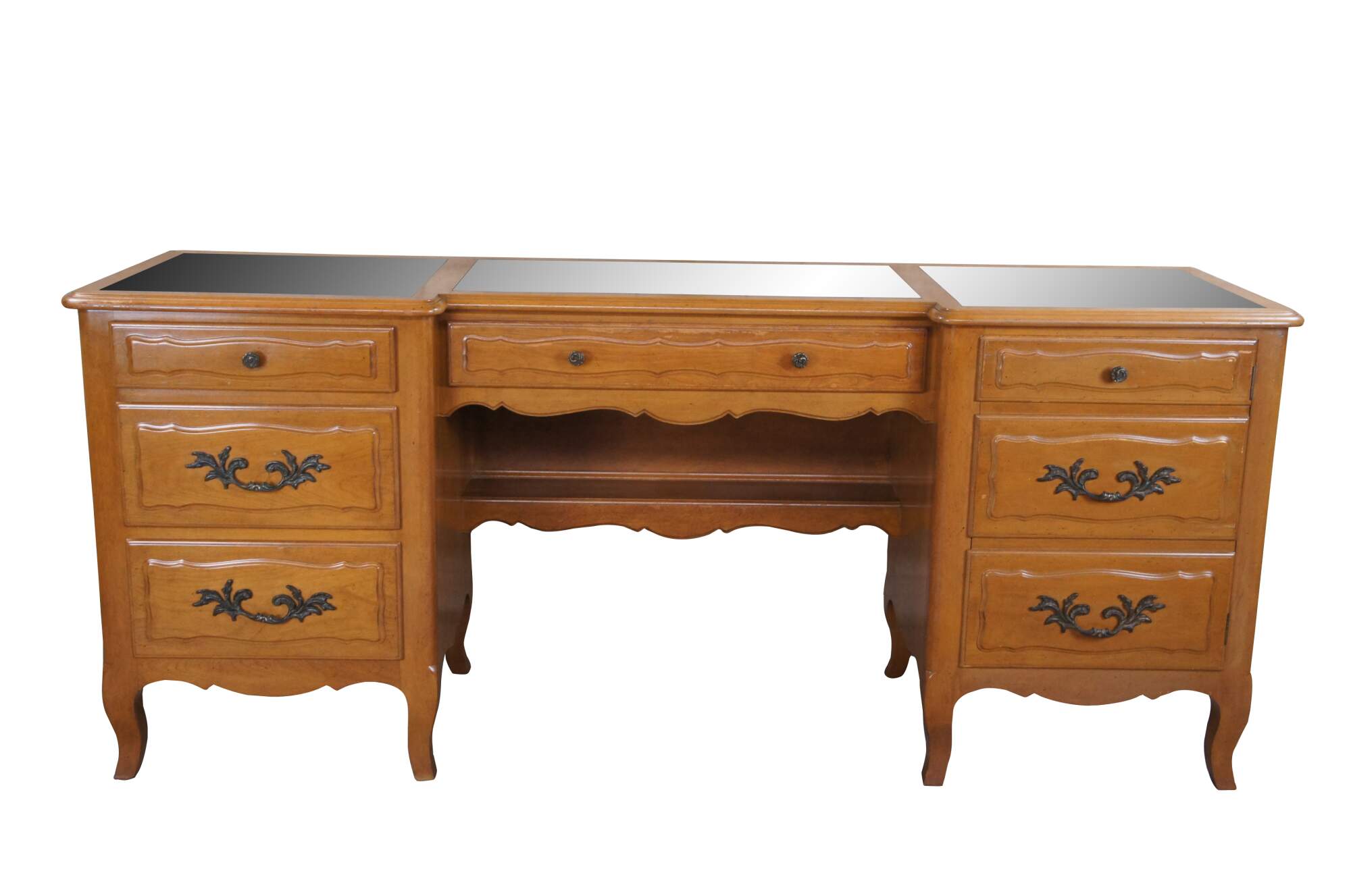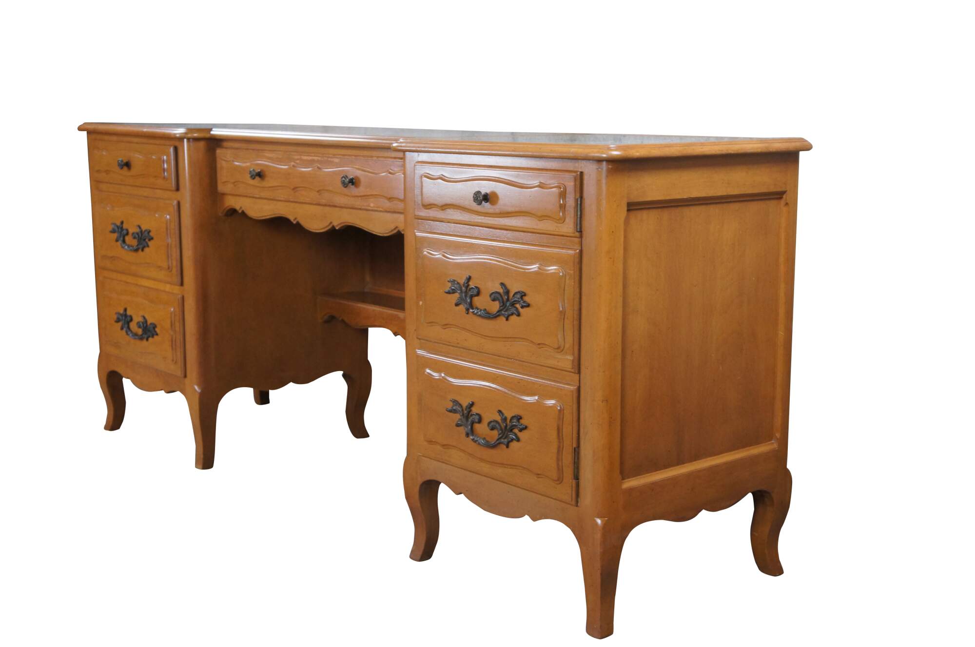 Mid century French Provincial vanity desk or credenza featuring serpentine form with antiqued mirrored top, four drawers and one cabinet.