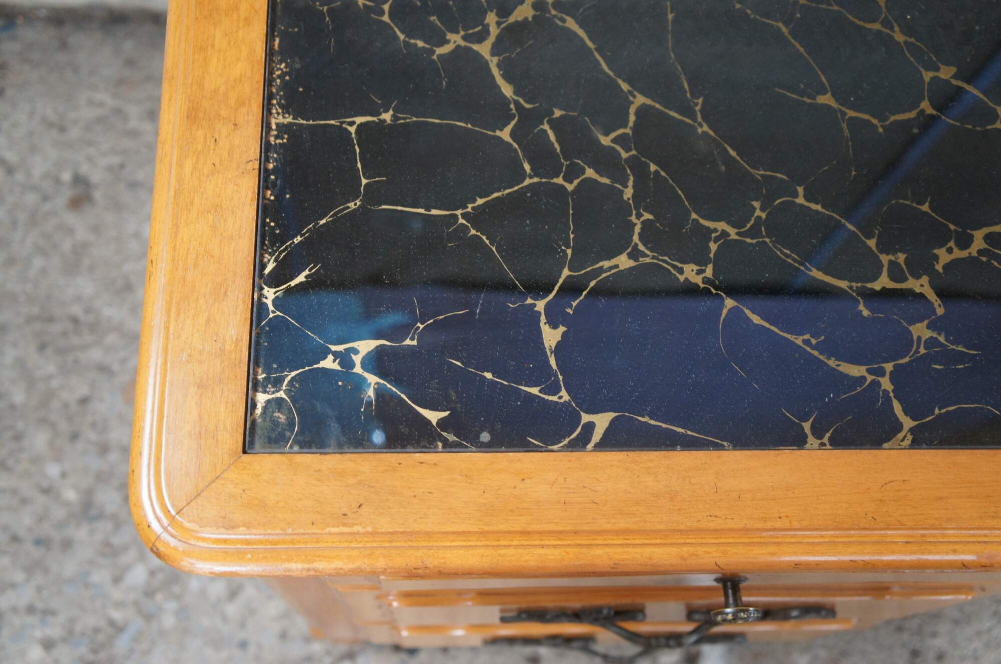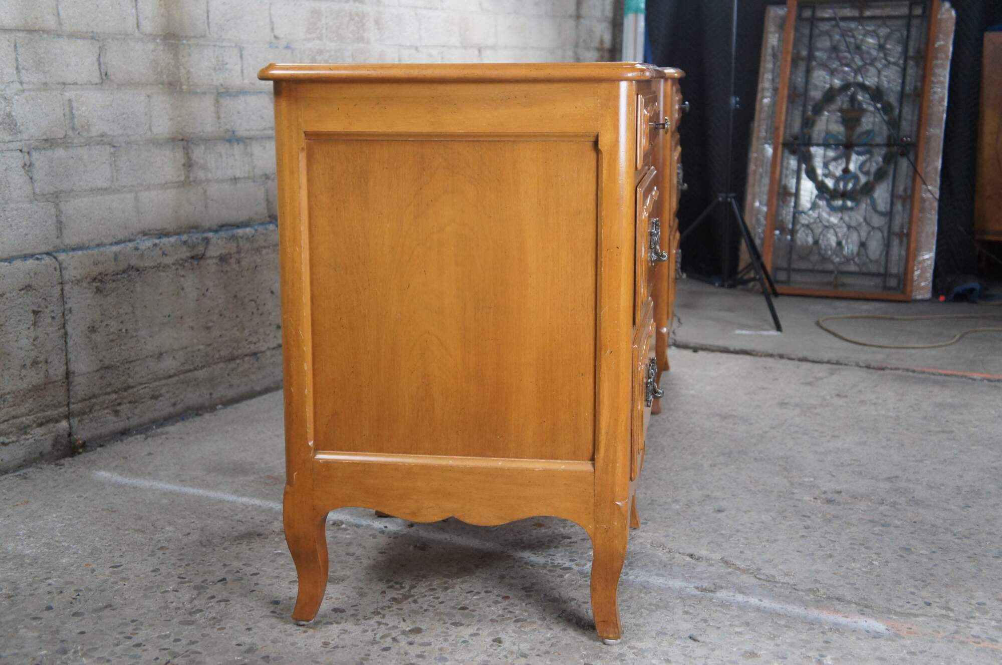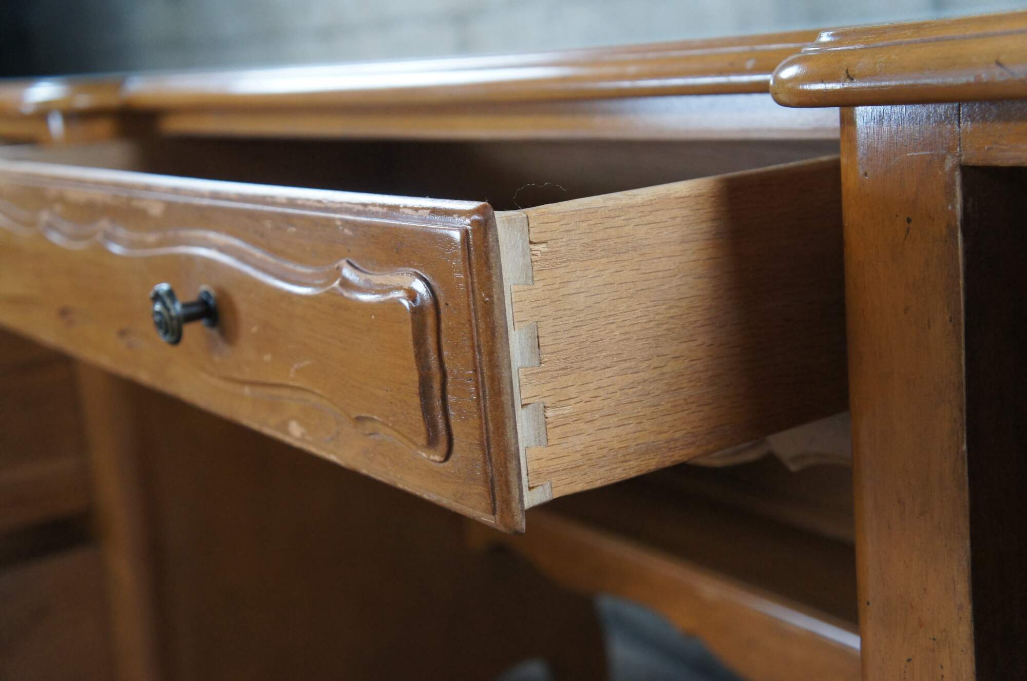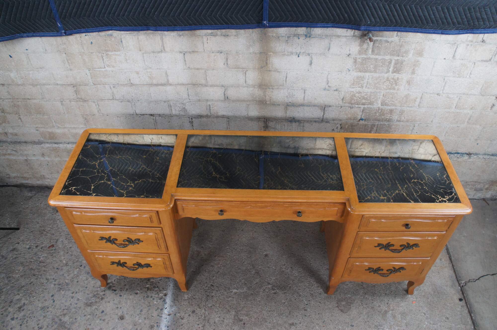 Mid century French Provincial vanity desk or credenza featuring serpentine form with antiqued mirrored top, four drawers and one cabinet.