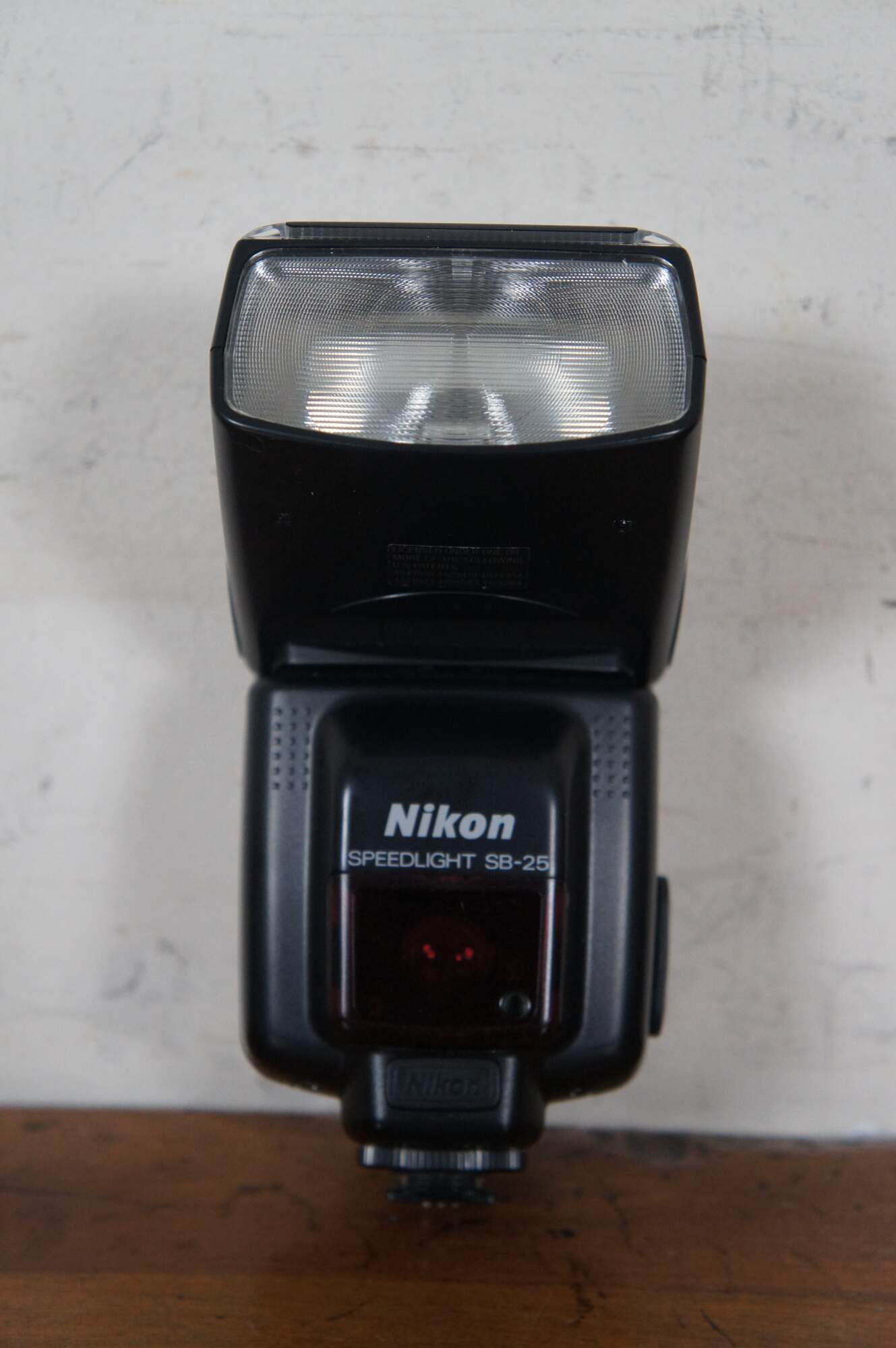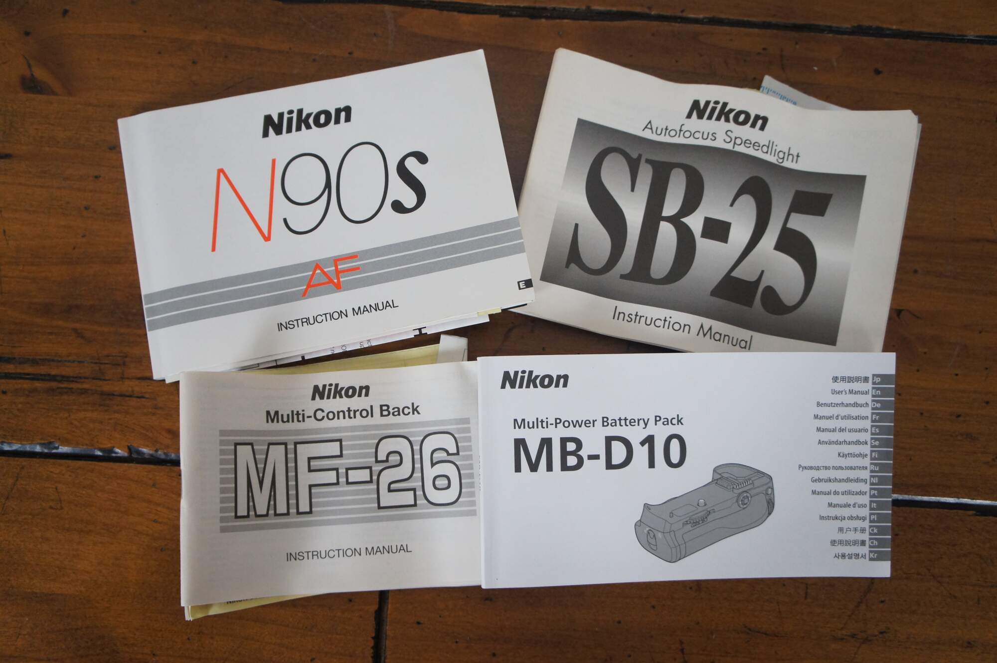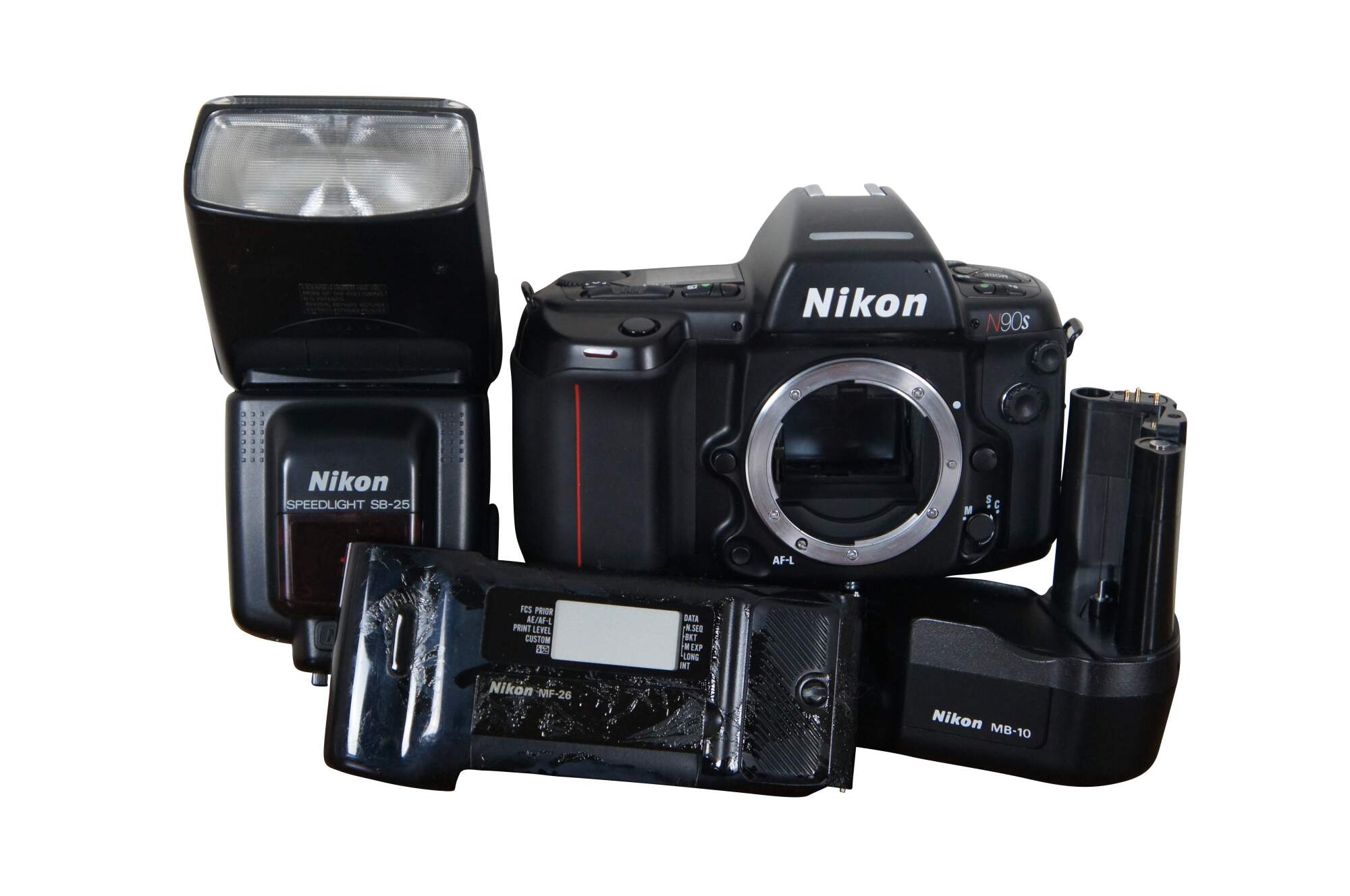 Lot includes Nikon N90s 35mm camera, MB-10 Multi Power Vertical Grip, SB-25 Speedlight flash, MF-26 Multi-Control Back, instruction books/original boxes, Complete User’s Guide Nikon N90 F90, S, D (John Clements – Hove Foto Books), Magic Lantern Guides Nikon N90 F90 and Nikon SB-25 Flash System (Lanterna Magica - Michael Huber).