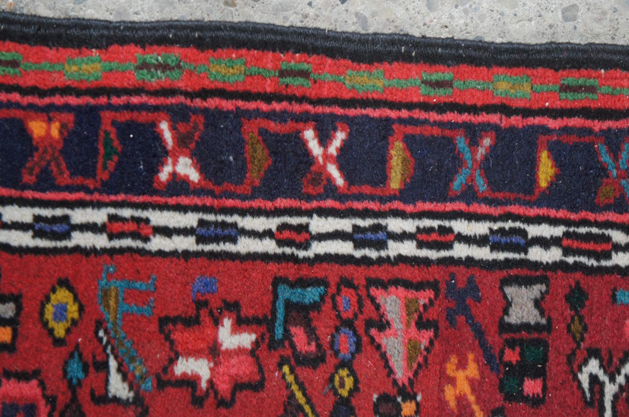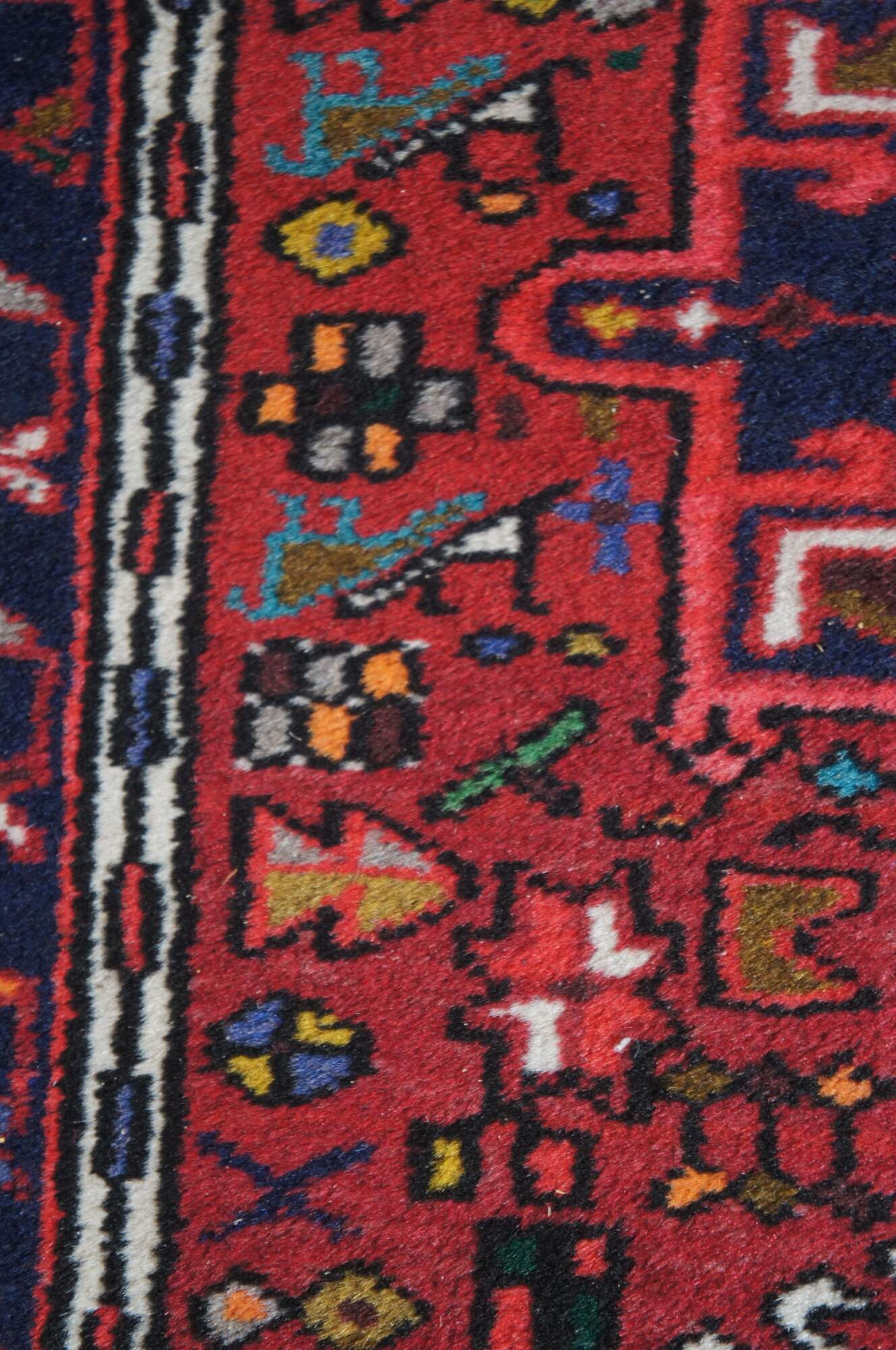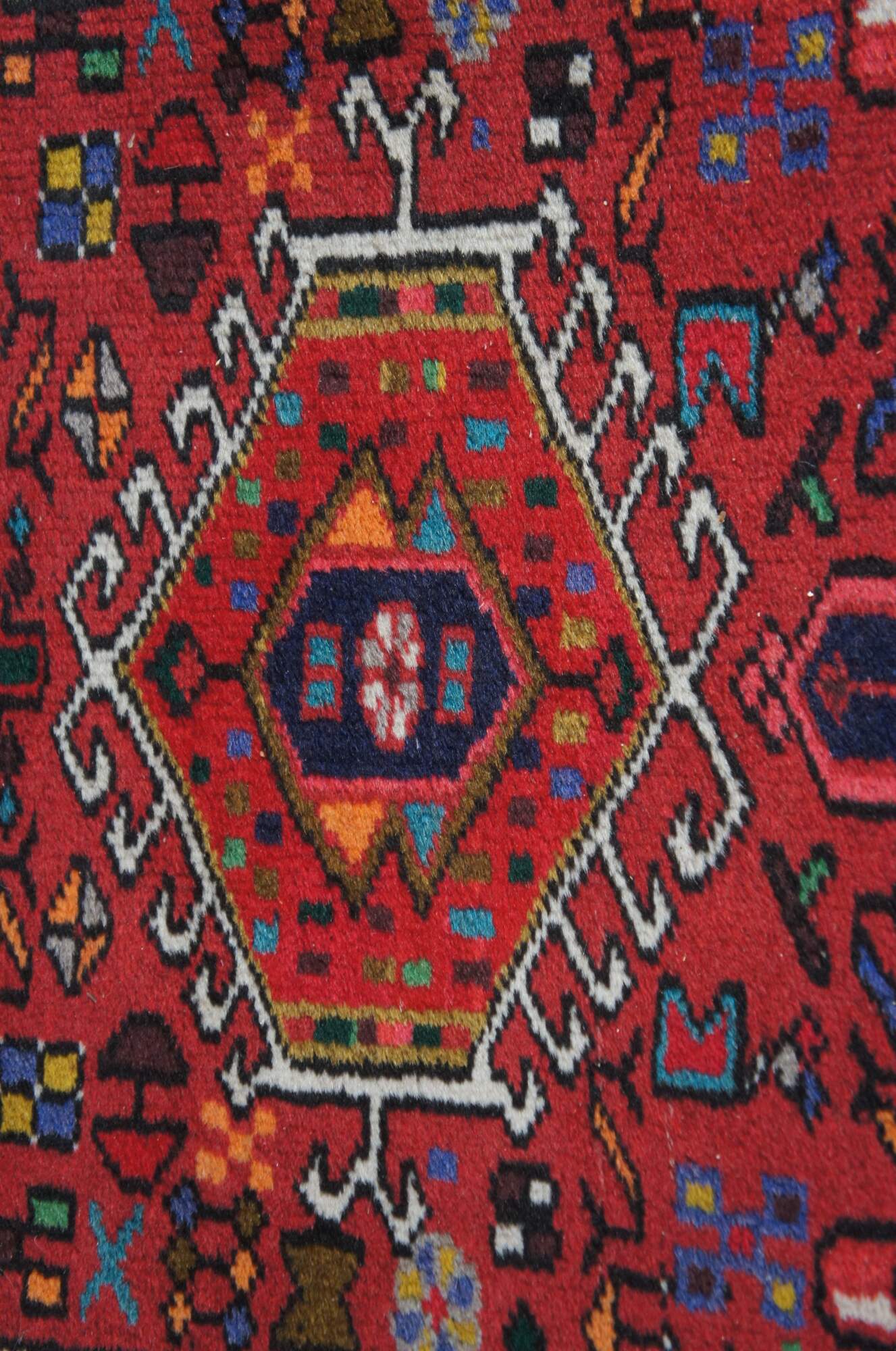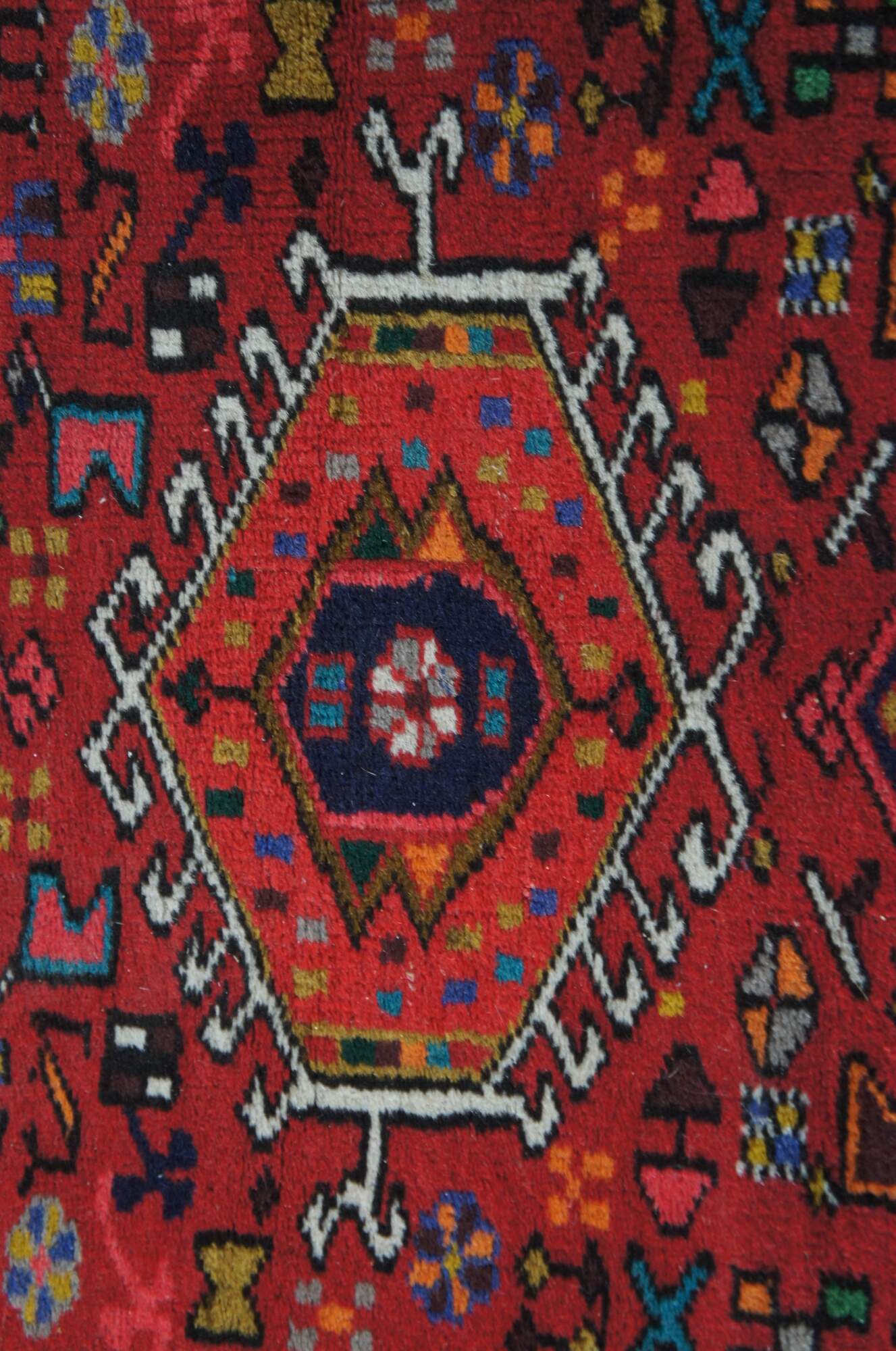 Post WWII NW Persian Vintage rug runner or mat from the Heriz-Karadja villages area, circa 1950-60s. Features 100% wool pile and geometric designs of blues, purples, orange, browns, grey, beige, green, gold and yellow over a field of red. Made with a depressed weave structure and synthetic dyes. A rug that was built to last. Made in Iran