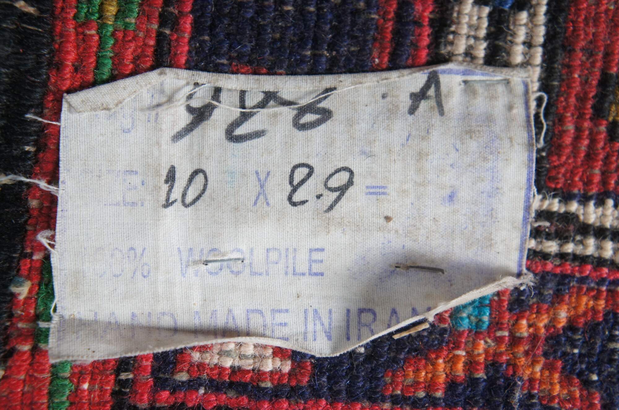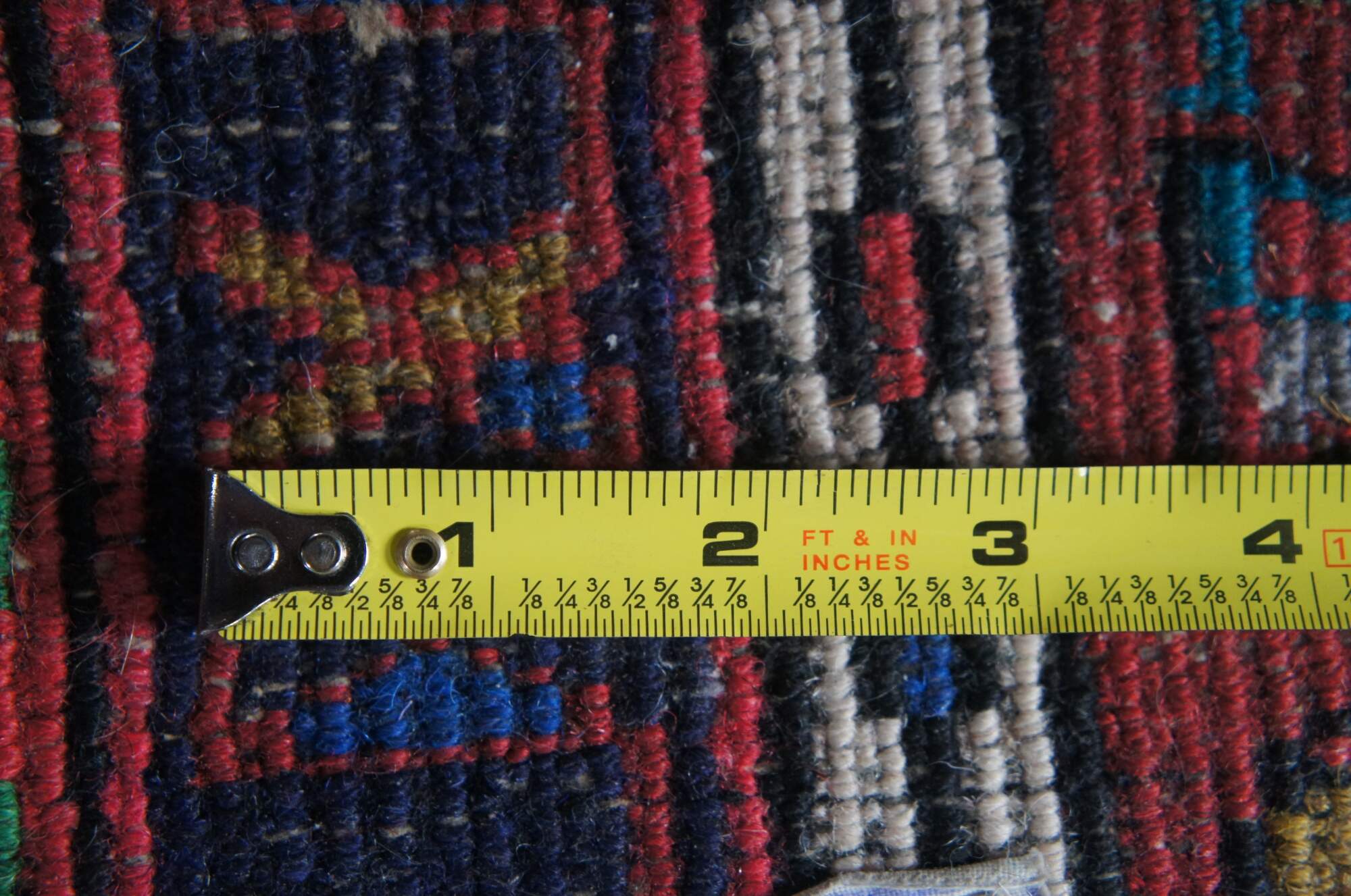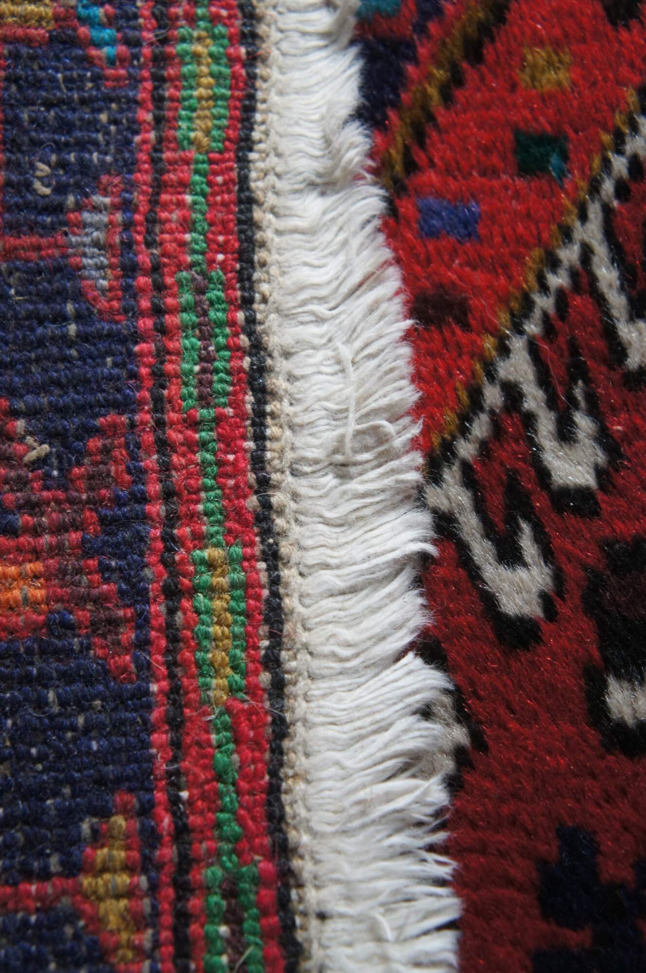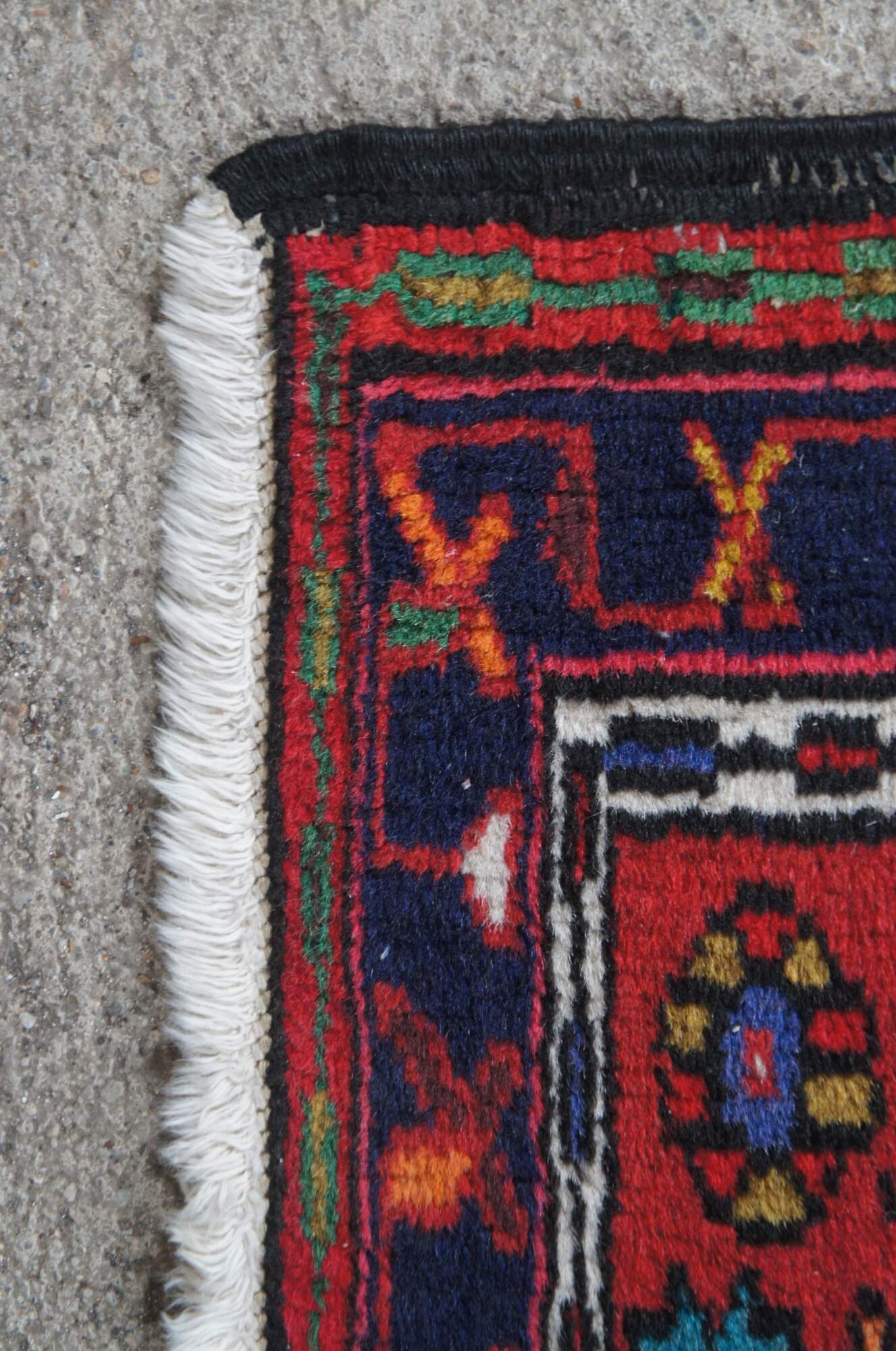 Post WWII NW Persian Vintage rug runner or mat from the Heriz-Karadja villages area, circa 1950-60s. Features 100% wool pile and geometric designs of blues, purples, orange, browns, grey, beige, green, gold and yellow over a field of red. Made with a depressed weave structure and synthetic dyes. A rug that was built to last. Made in Iran