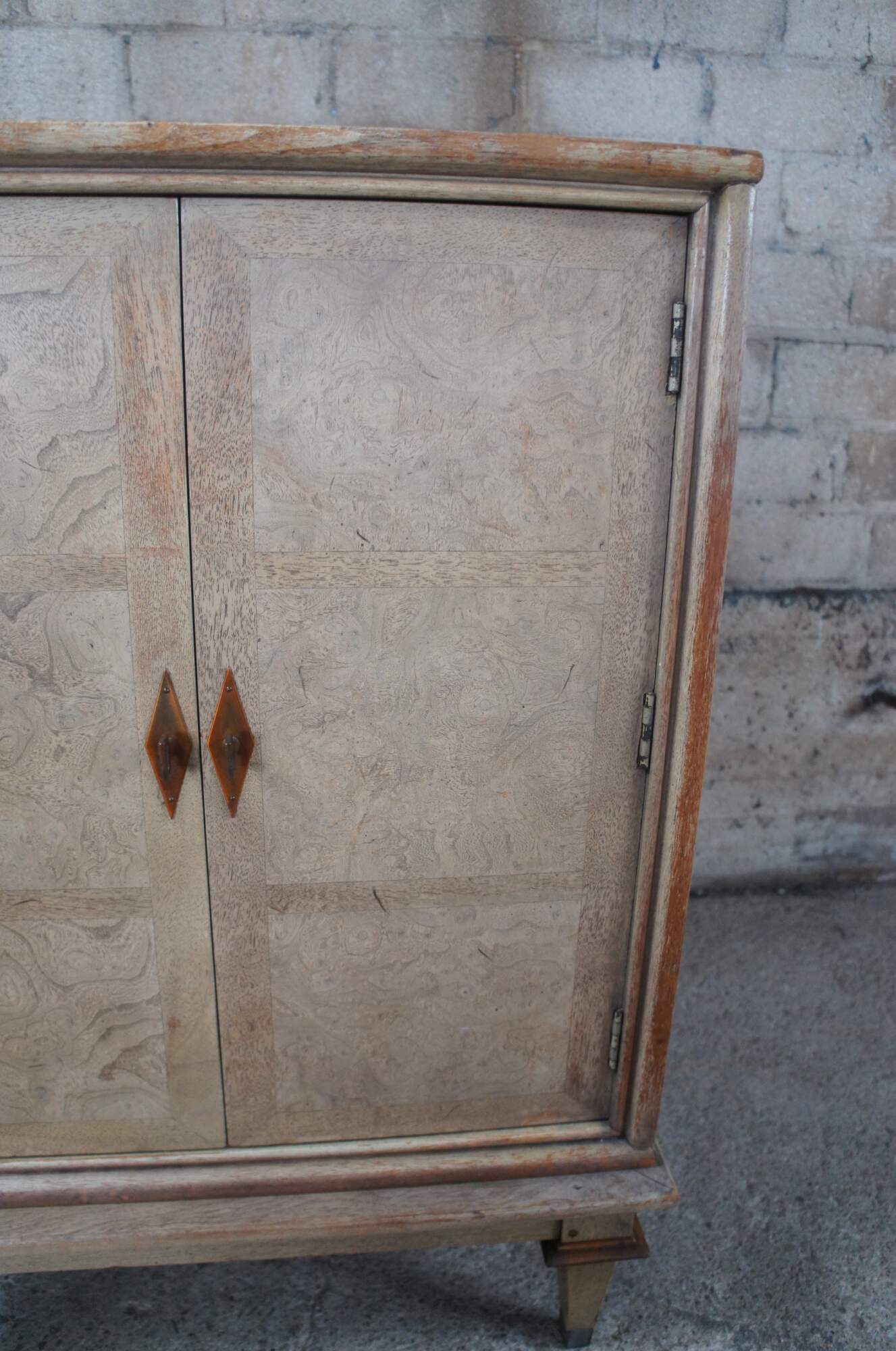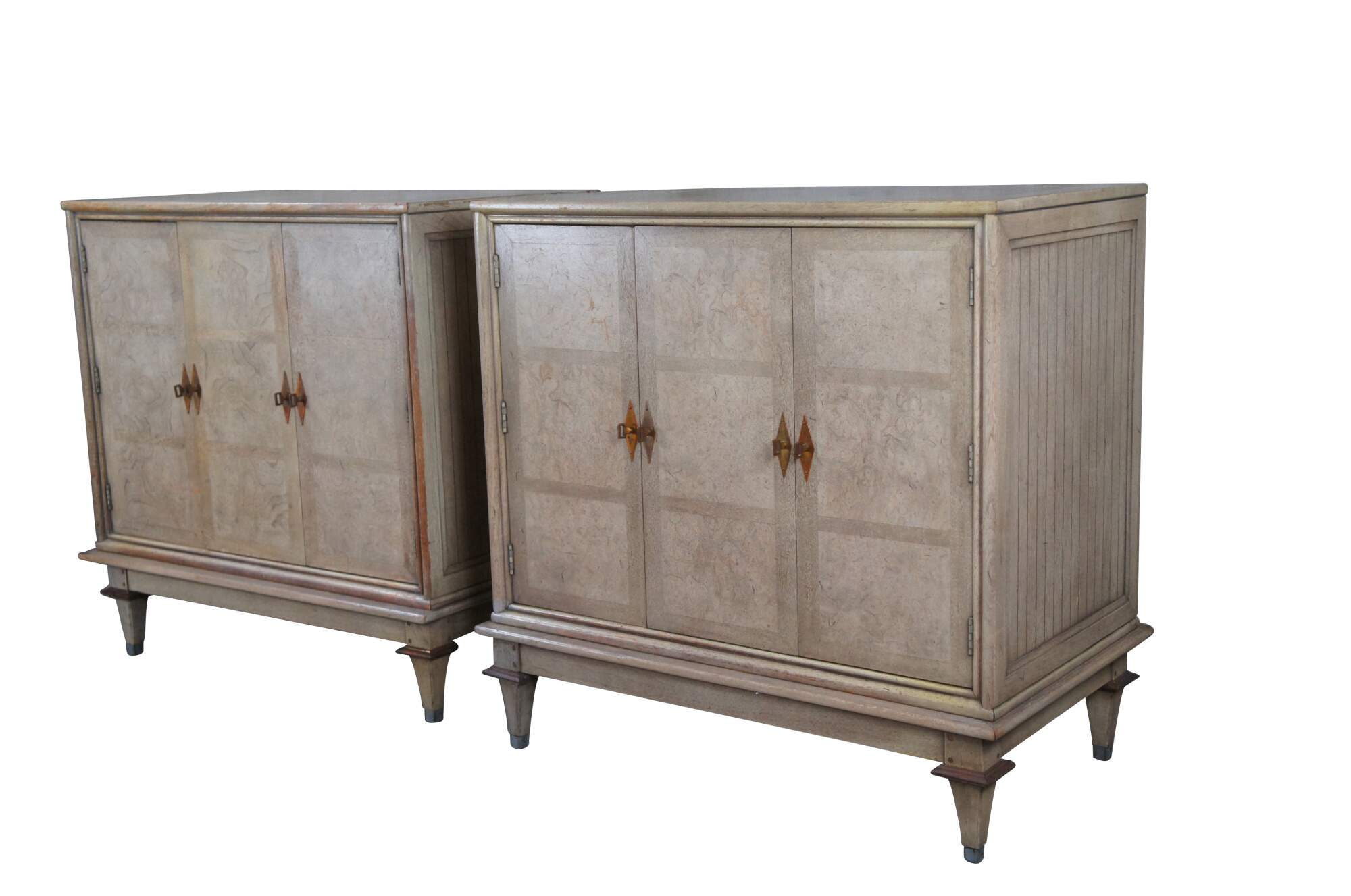 Pair of mid century modern buffets / credenzas / sideboards / servers / nightstands by Bernhard Rohne for Mastercraft Furniture Company. Made from ash burl featuring modular form with paneled sides, folding doors, dovetailed drawers and silverware compartment. Each of the 2 cabinet rests on a plinth base with square tapered legs leading to capped feet. circa 1970s