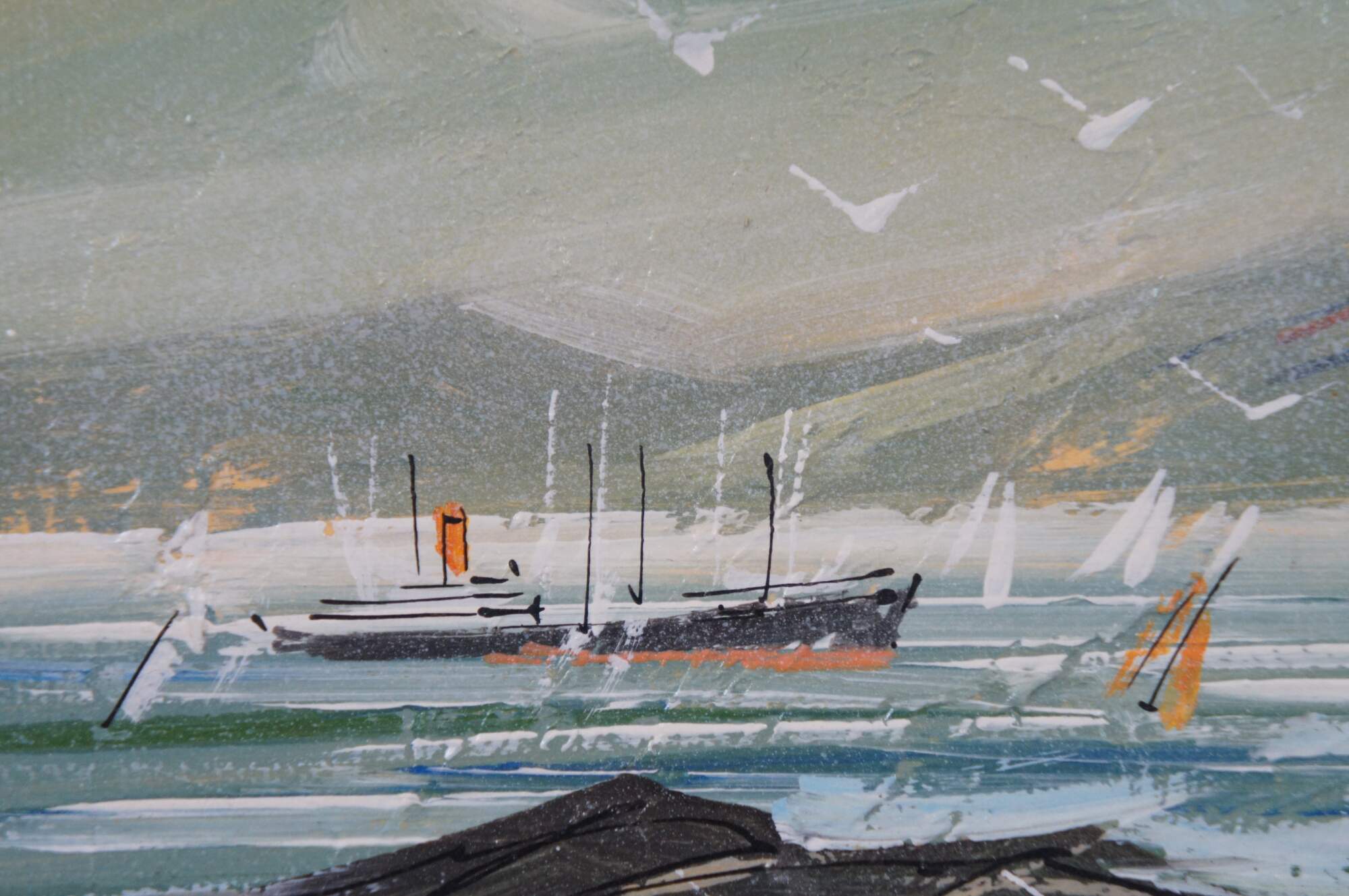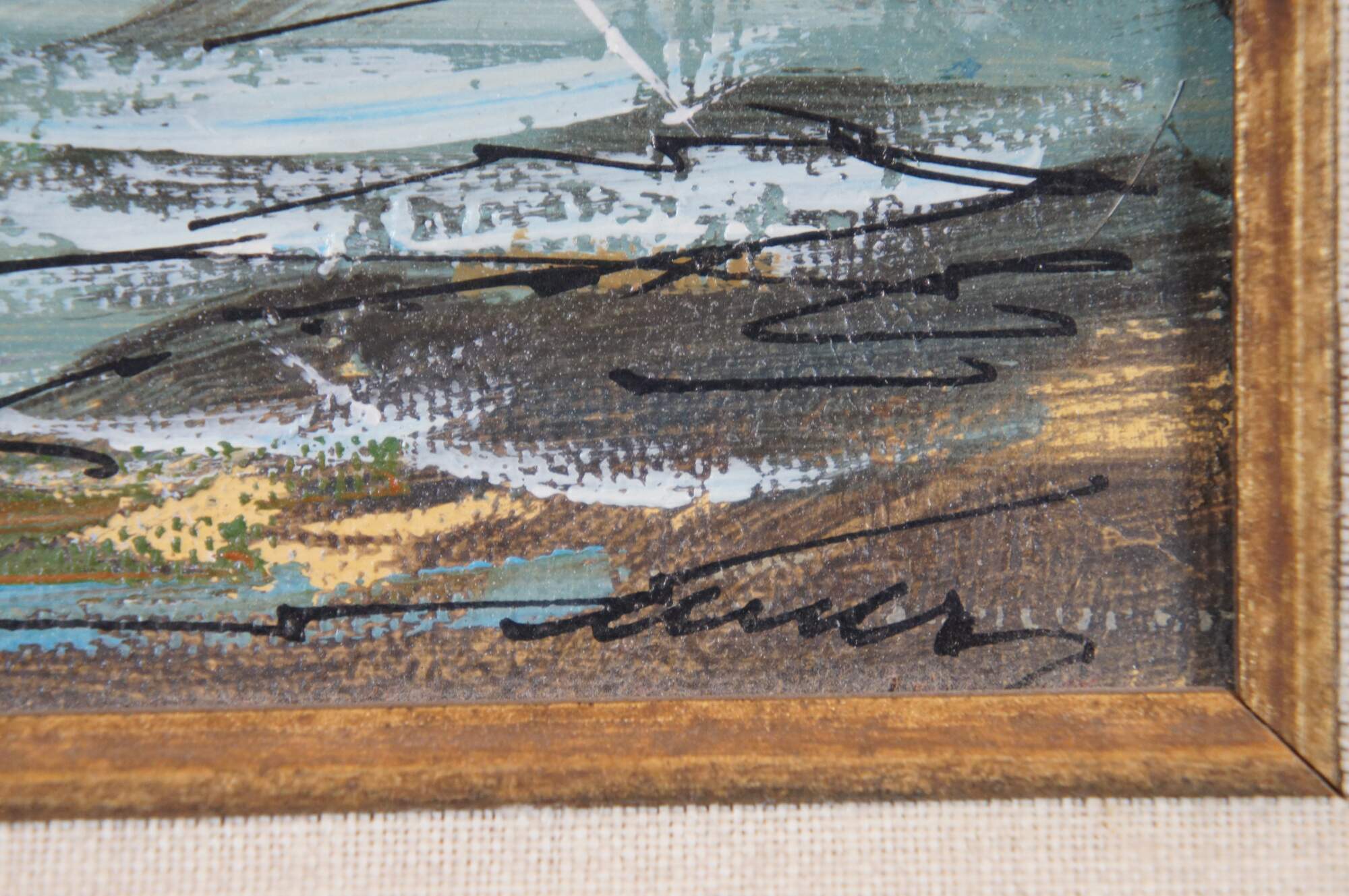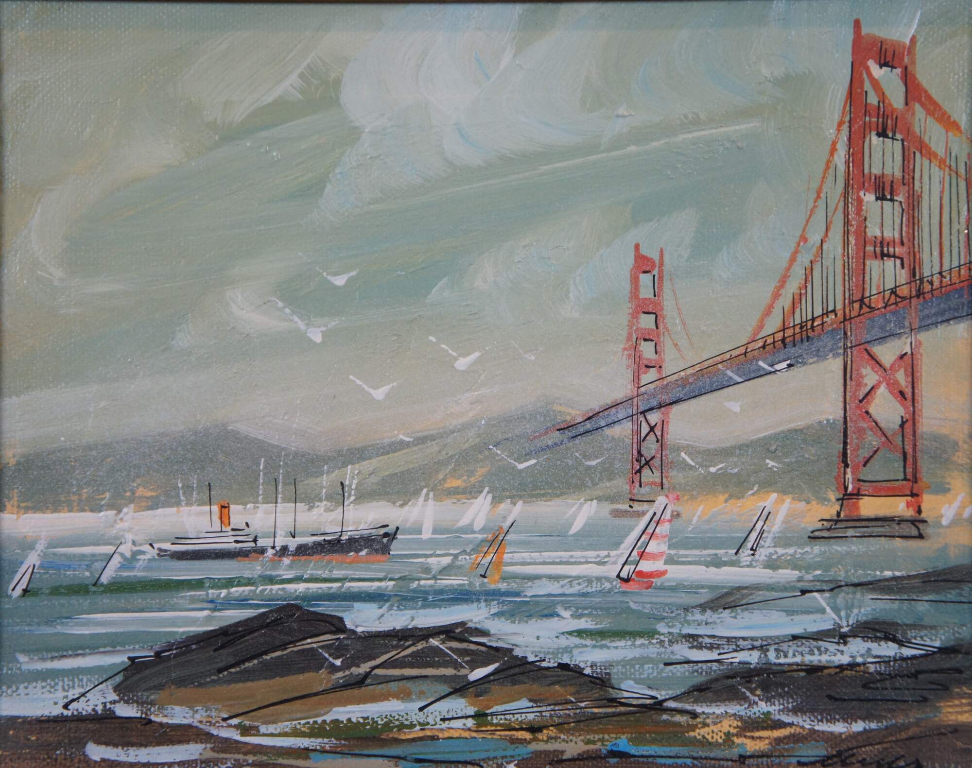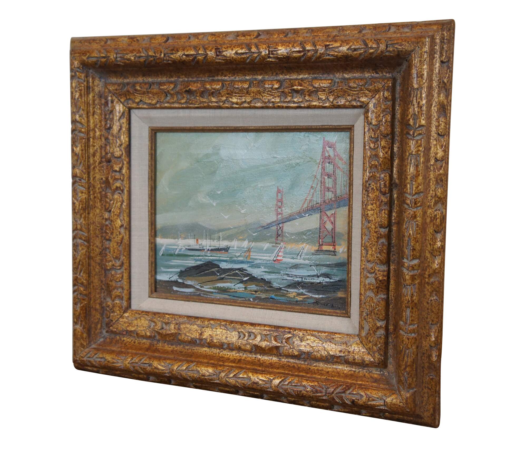Vintage John Leonard Checkley (b.1922-1991) Impressionist nautical theme landscape oil painting on board featuring the San Francisco Golden Gate Bridge with sailboats / boats and birds.