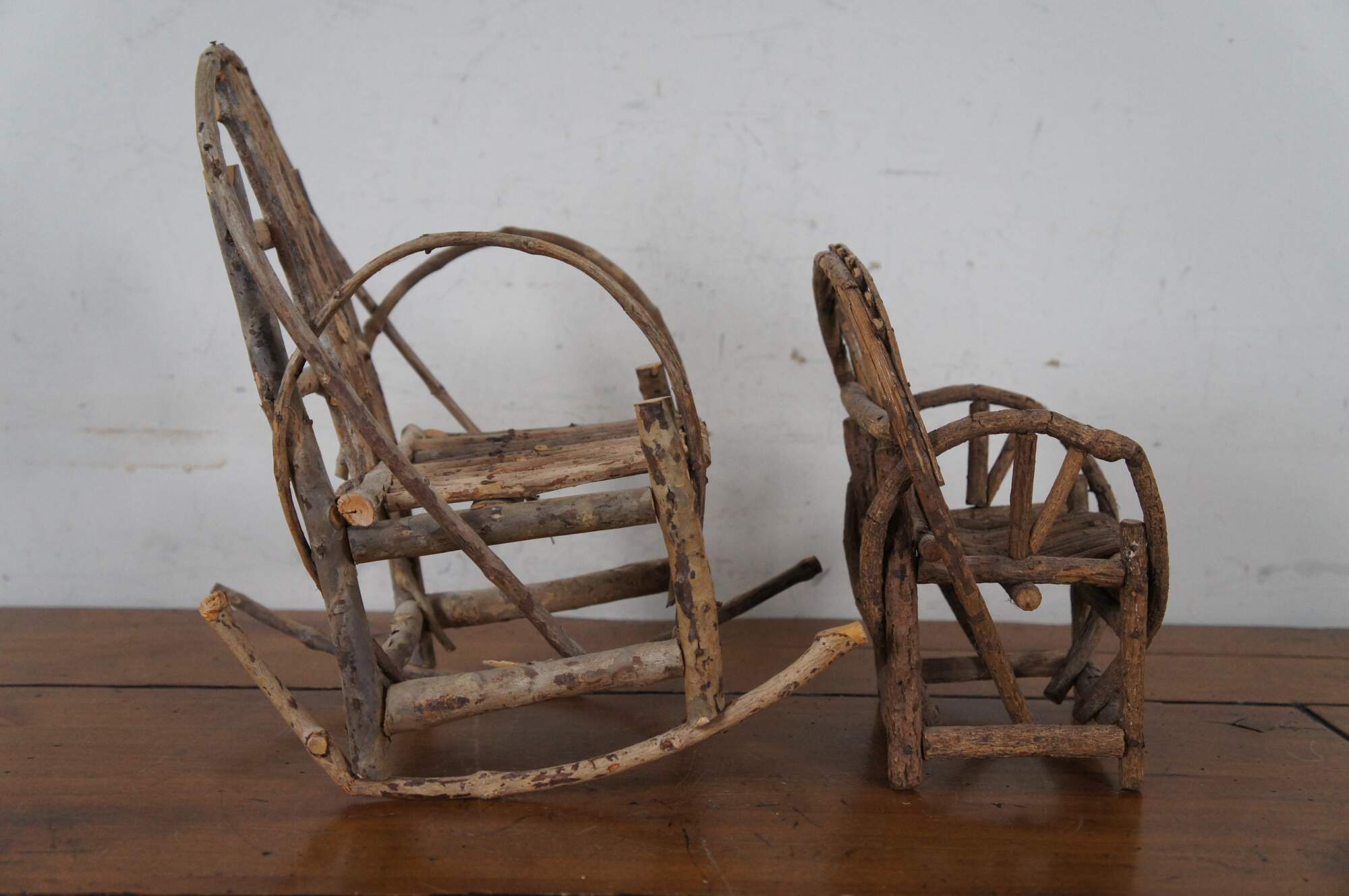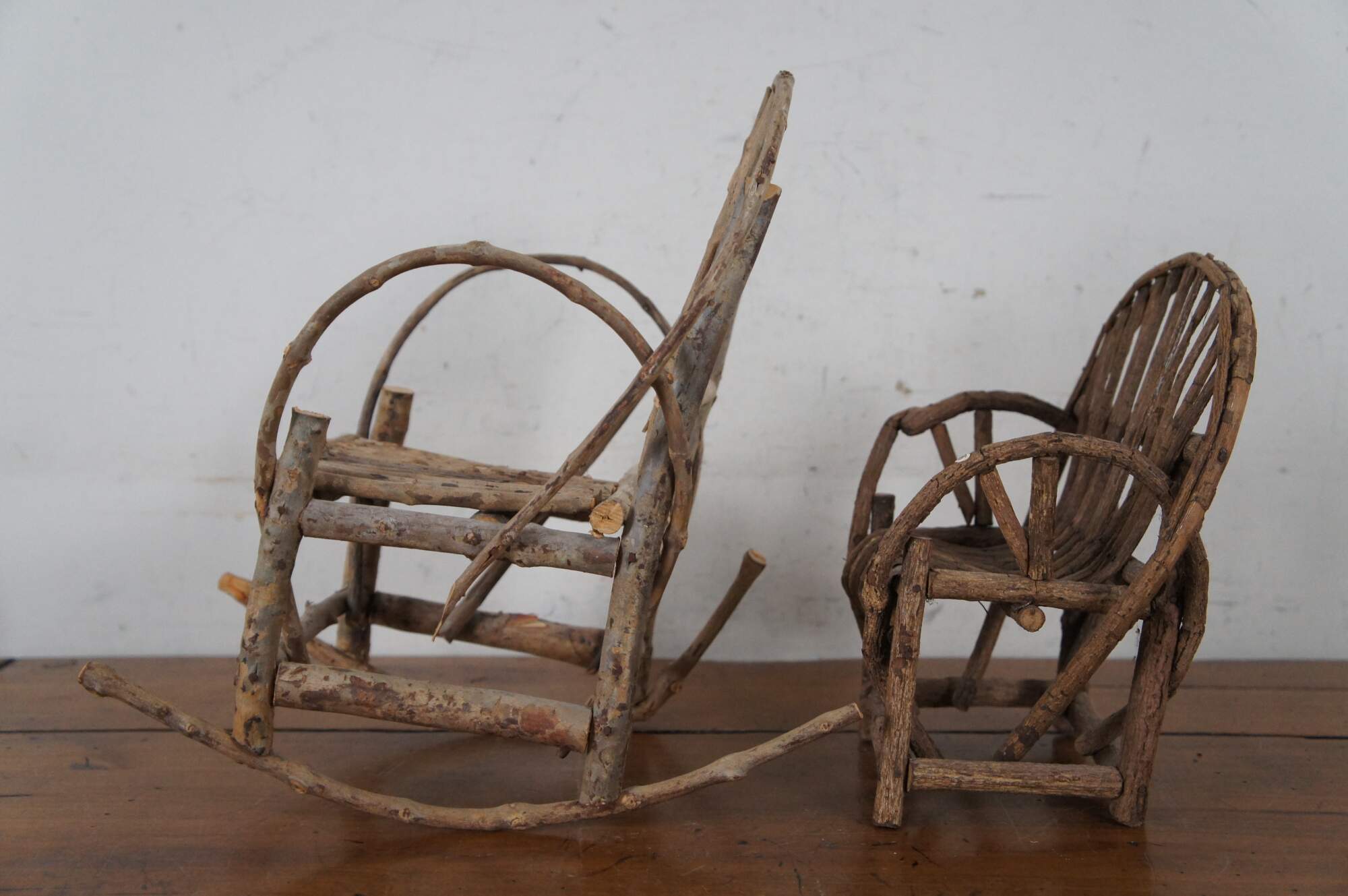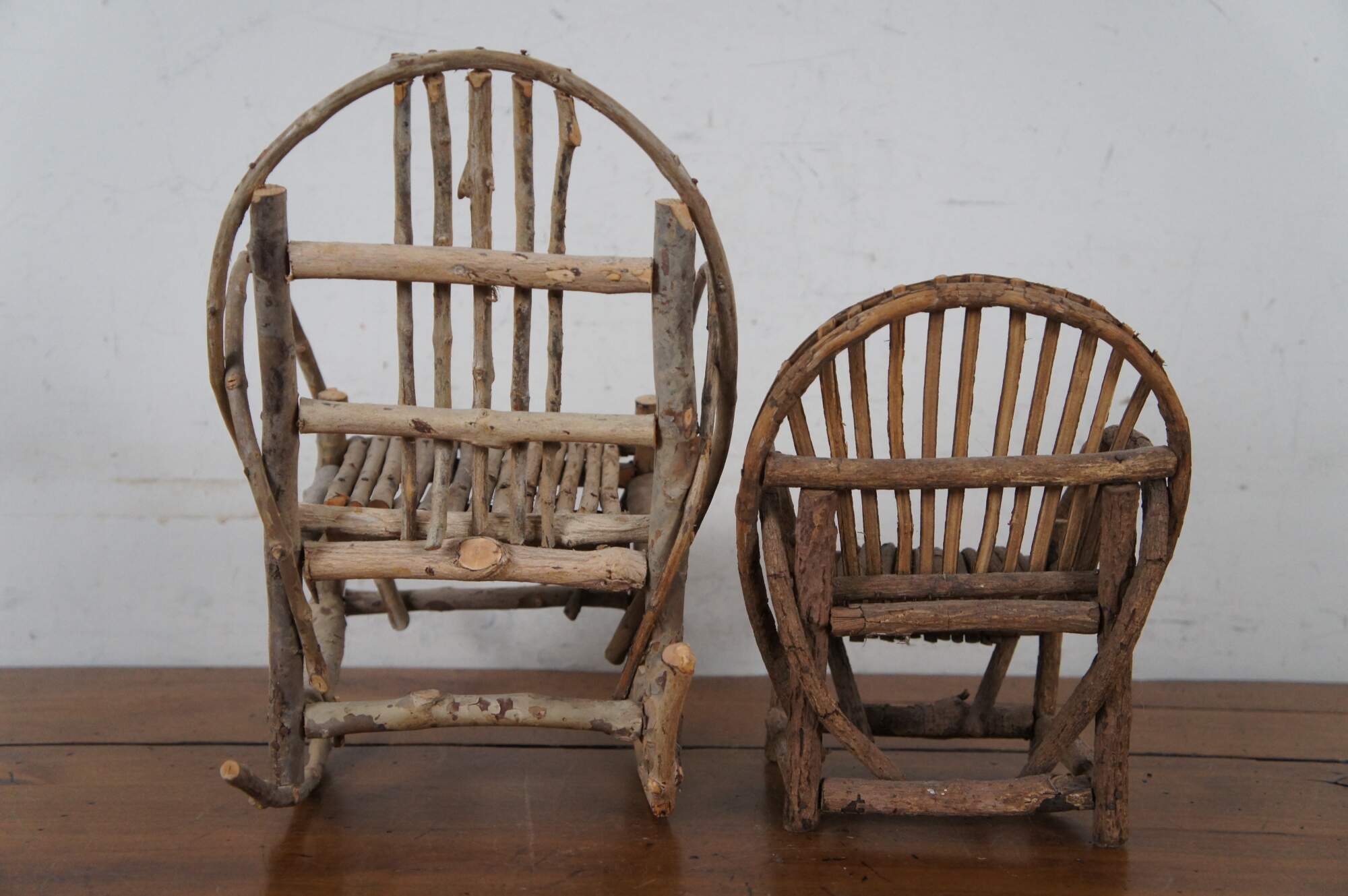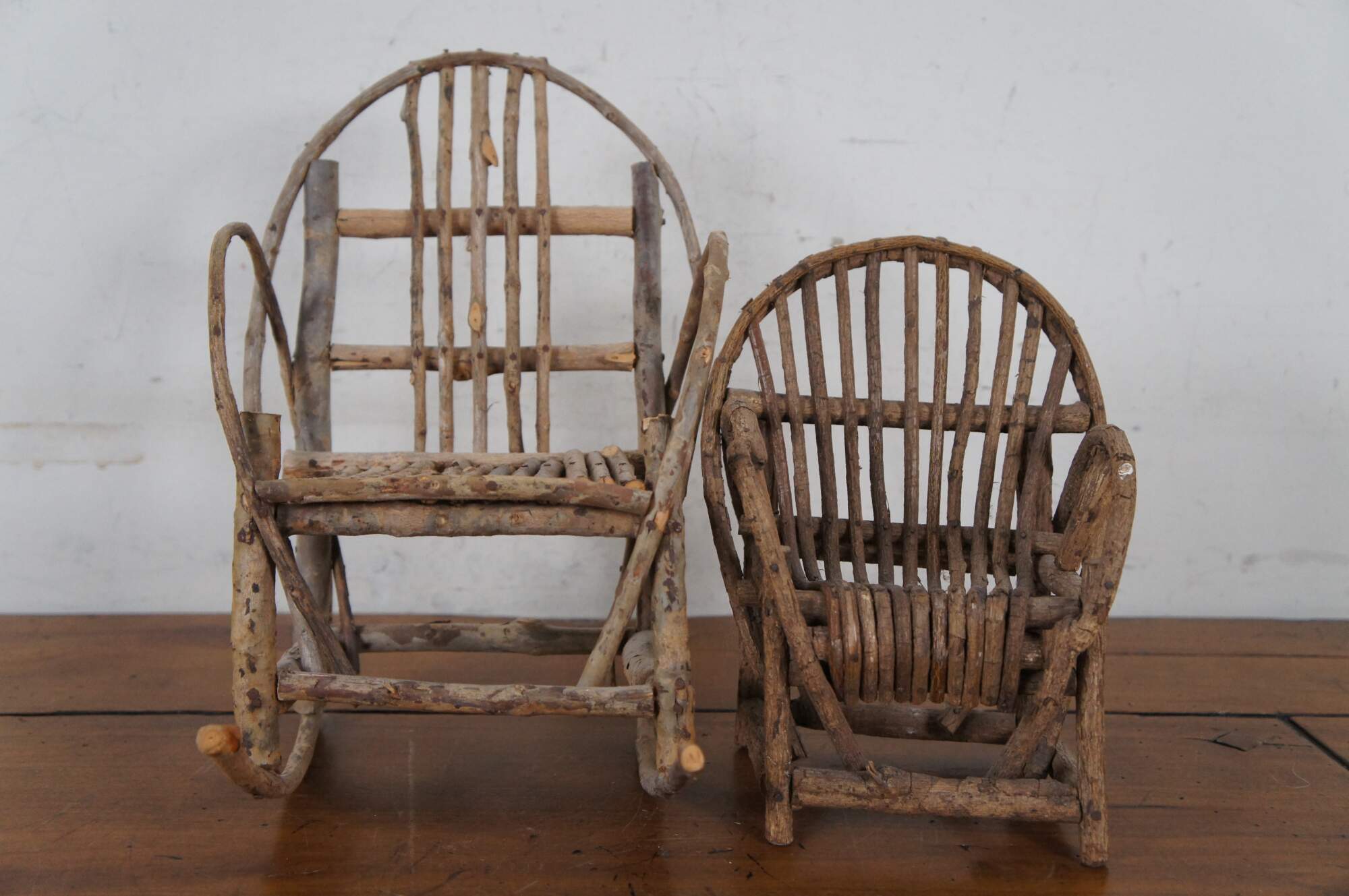 Two vintage folk art miniature salesman sample / doll / cabin decor Adirondak chairs featuring rustic bentwood / twig designs; one rocker and one armchair.