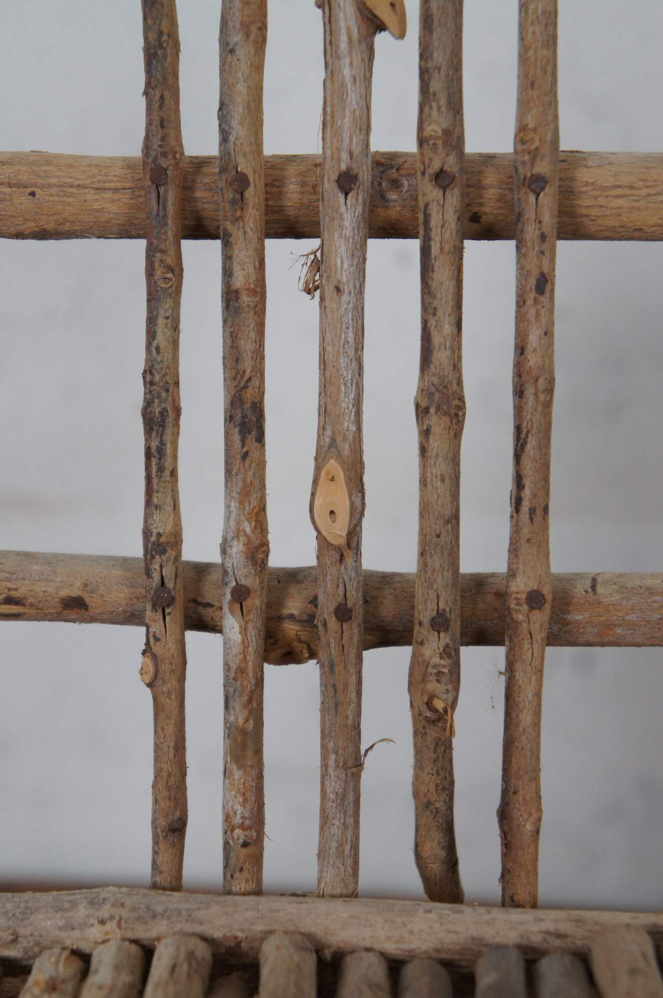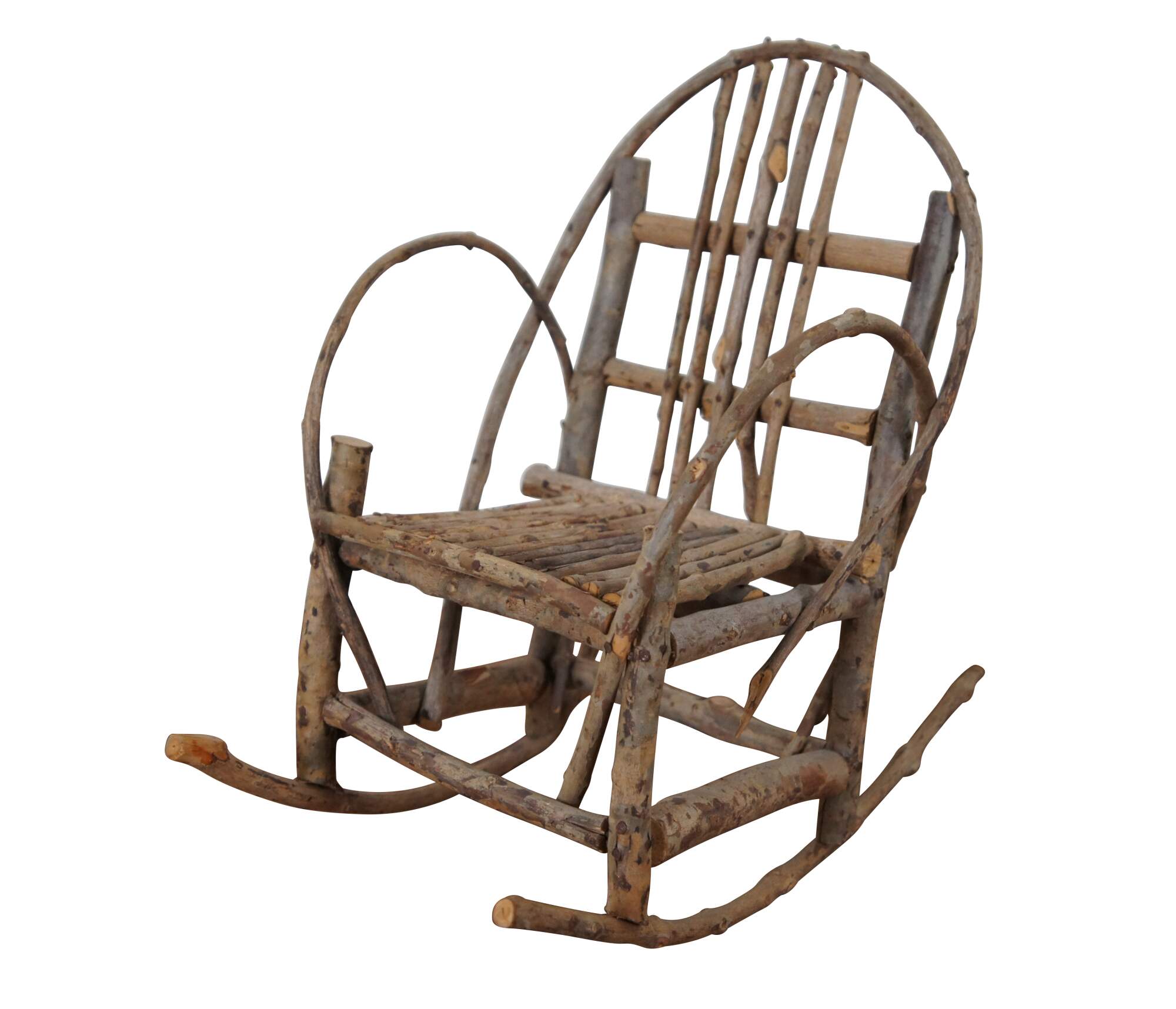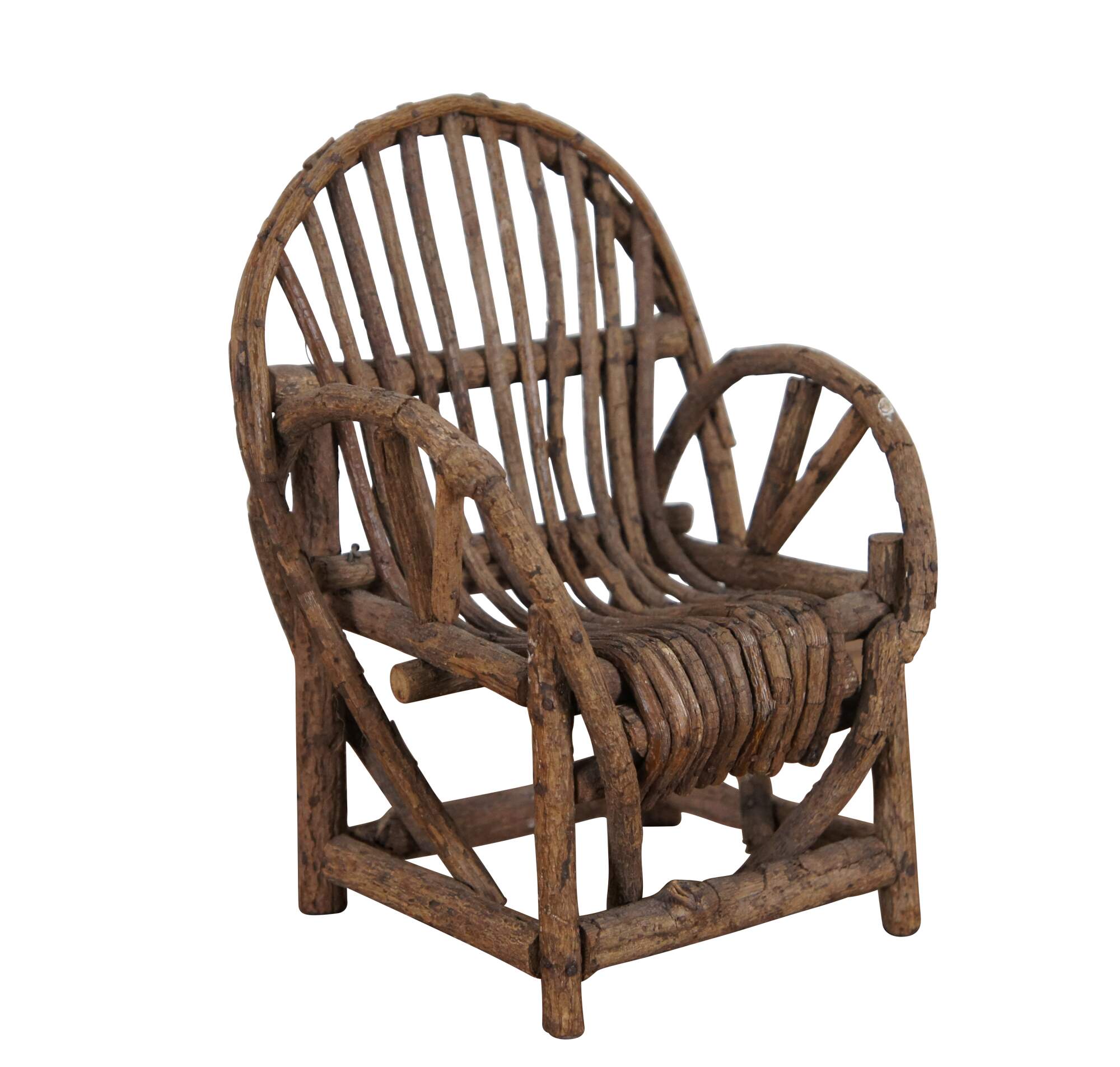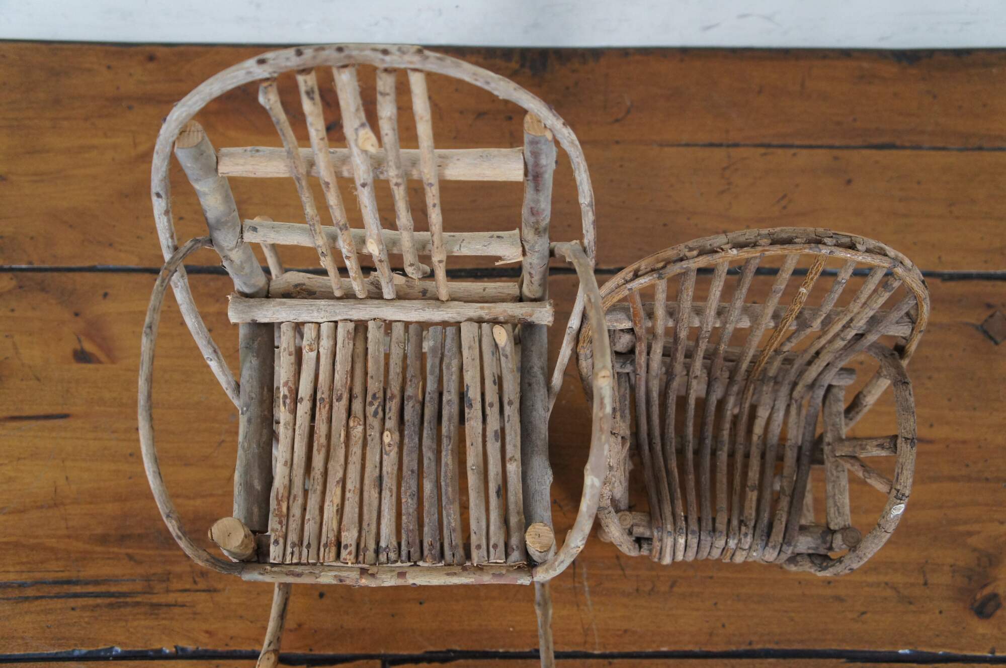 Two vintage folk art miniature salesman sample / doll / cabin decor Adirondak chairs featuring rustic bentwood / twig designs; one rocker and one armchair.