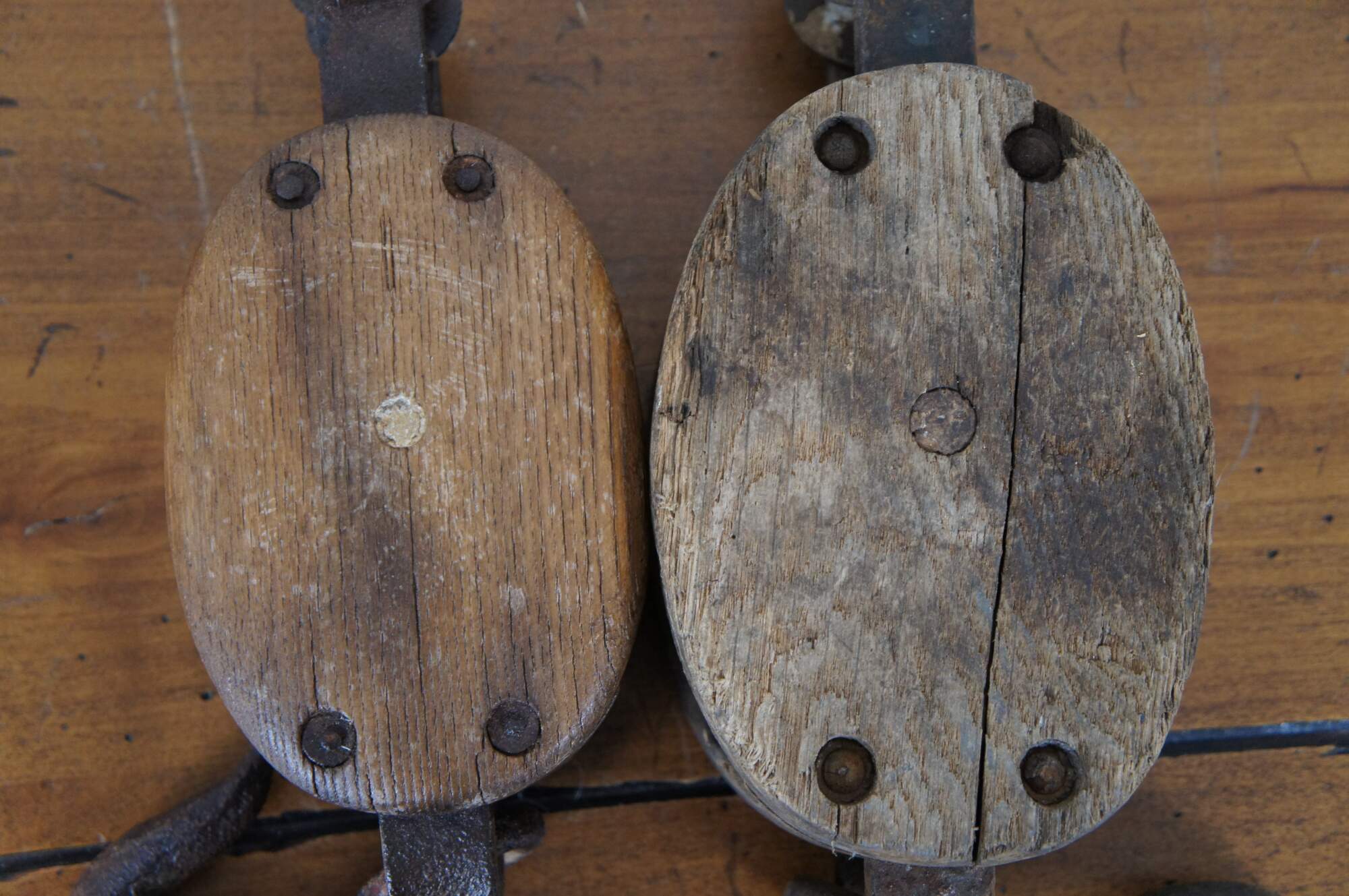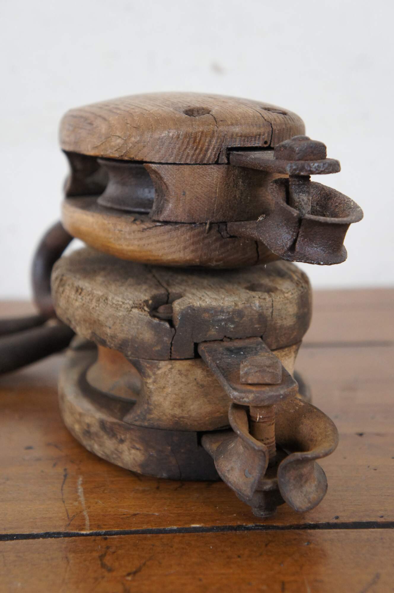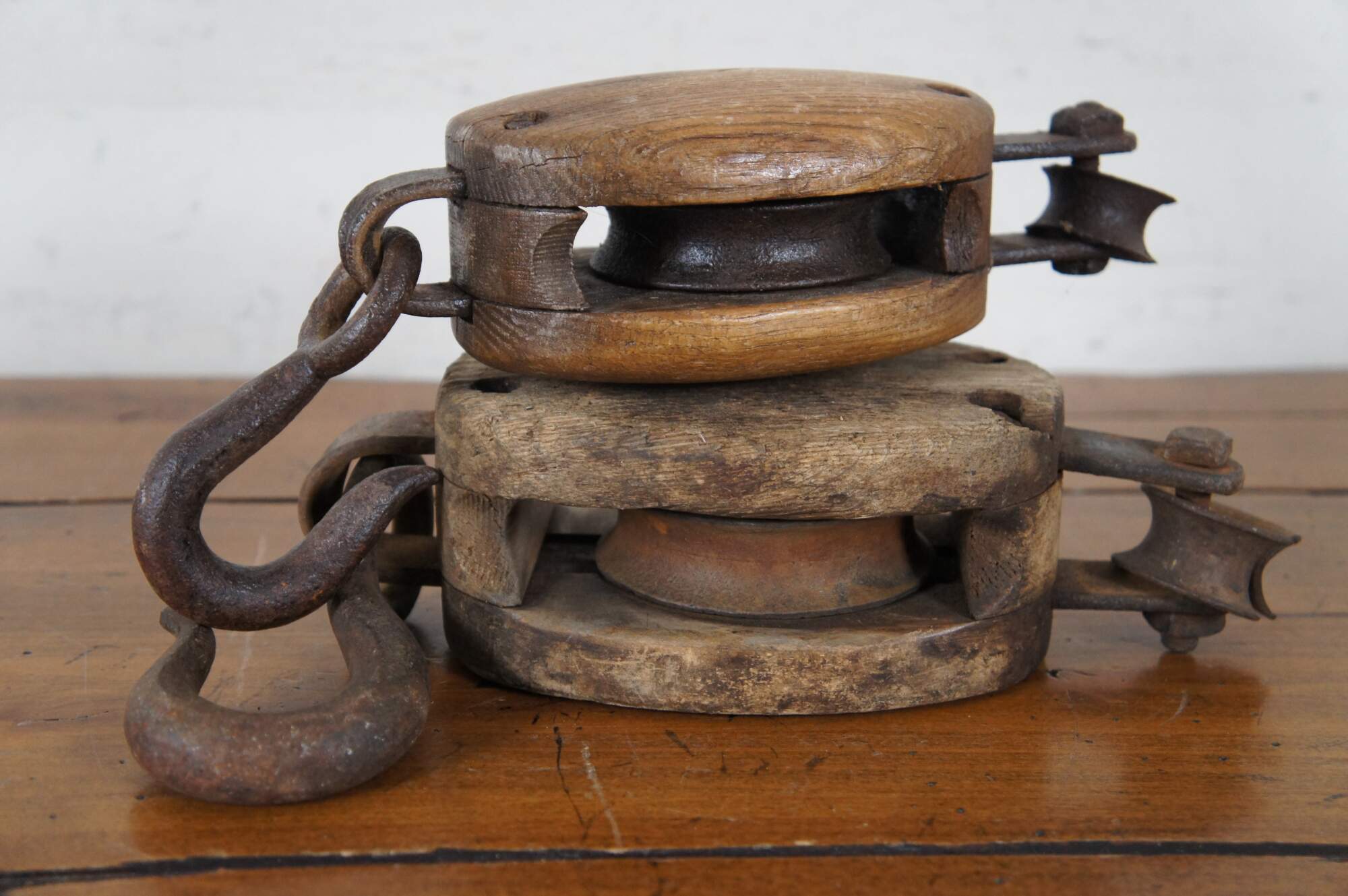 Two primitive antique iron and wood pulley hoist hooks, one by Starline. Rustic, nautical, industrial, farmhouse, cabin decor.