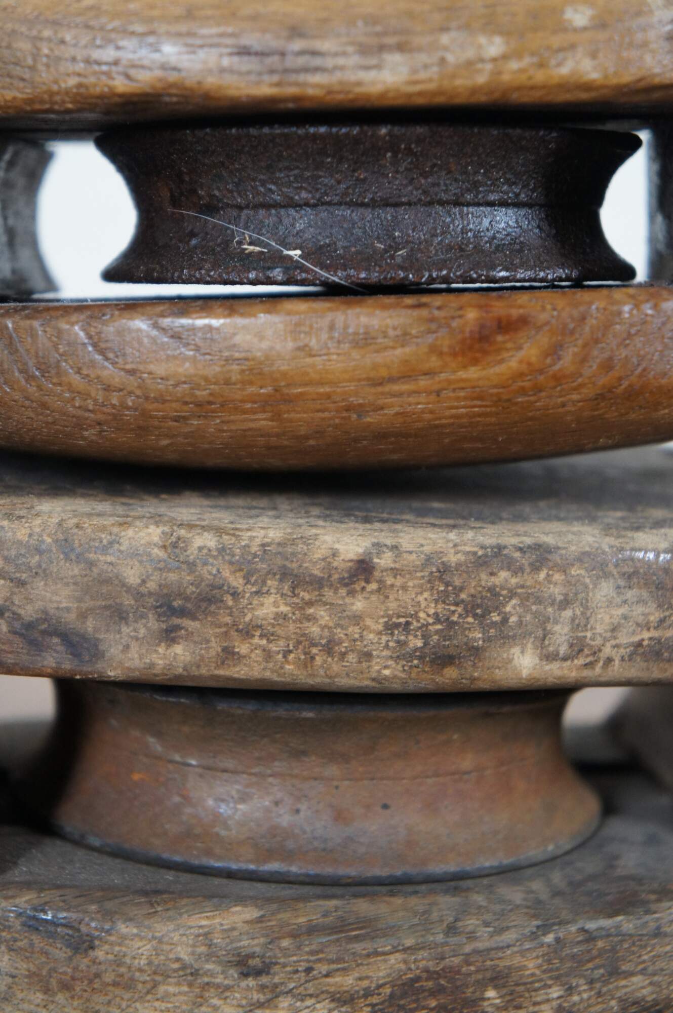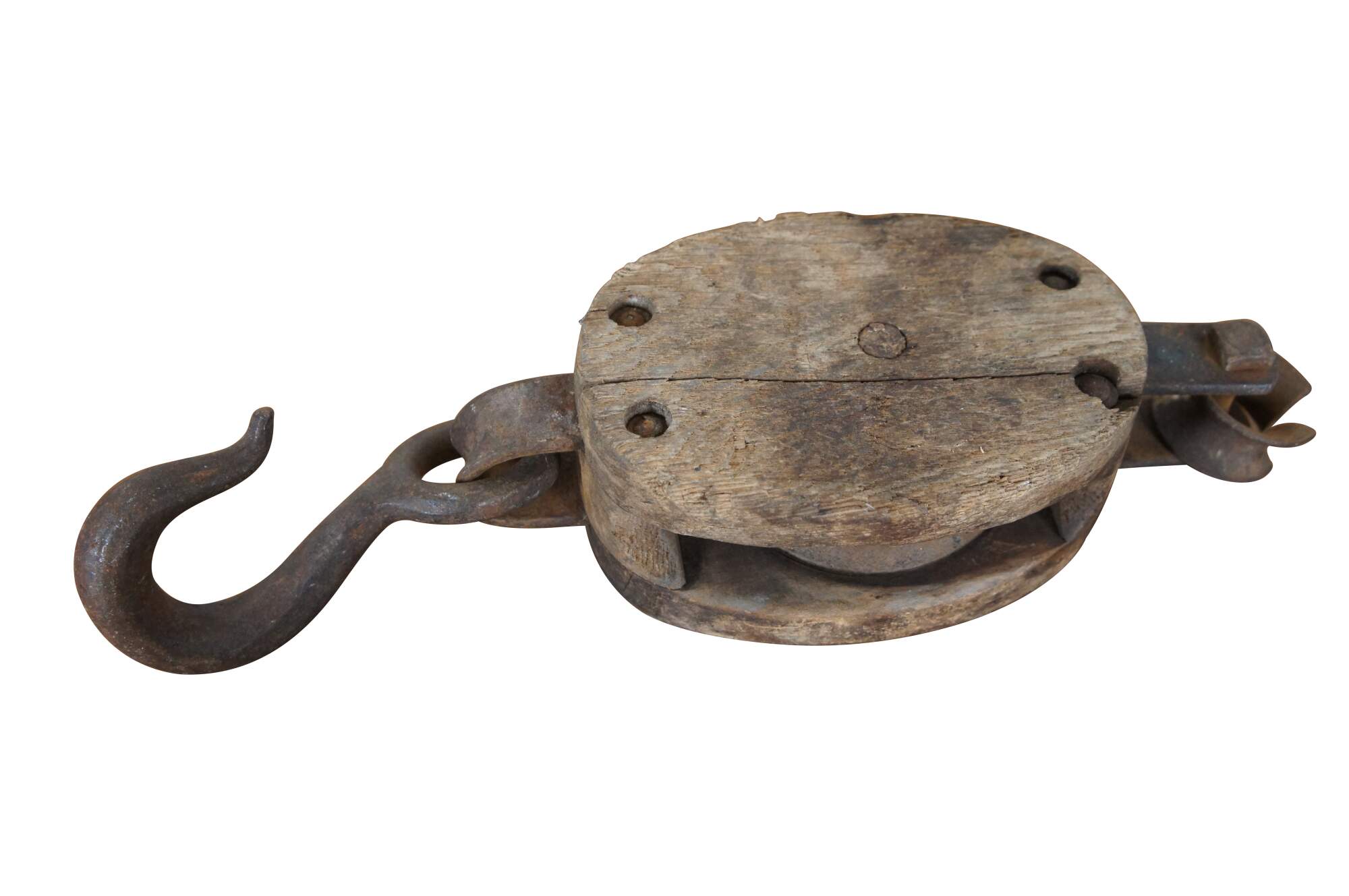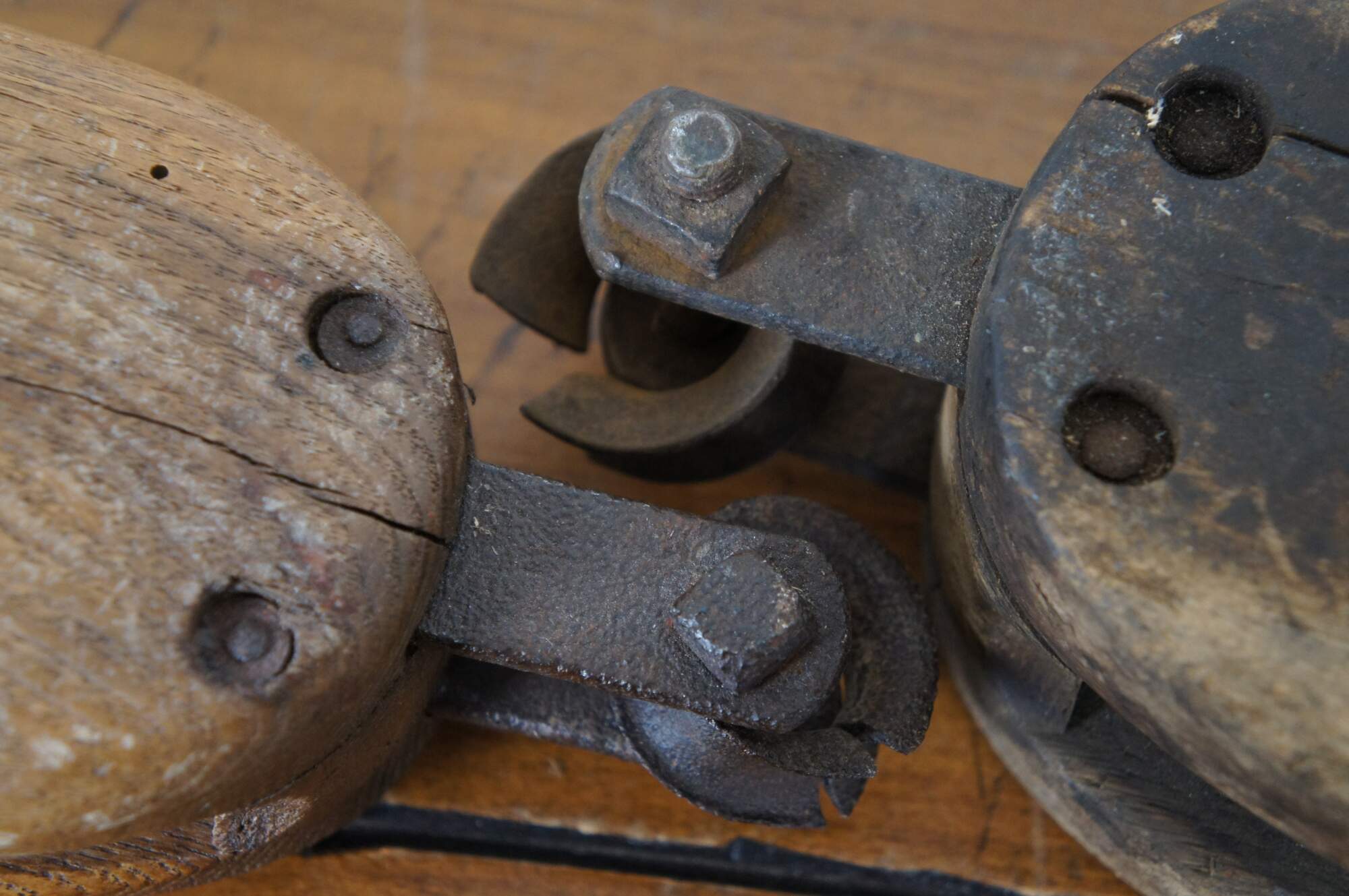 Two primitive antique iron and wood pulley hoist hooks, one by Starline. Rustic, nautical, industrial, farmhouse, cabin decor.