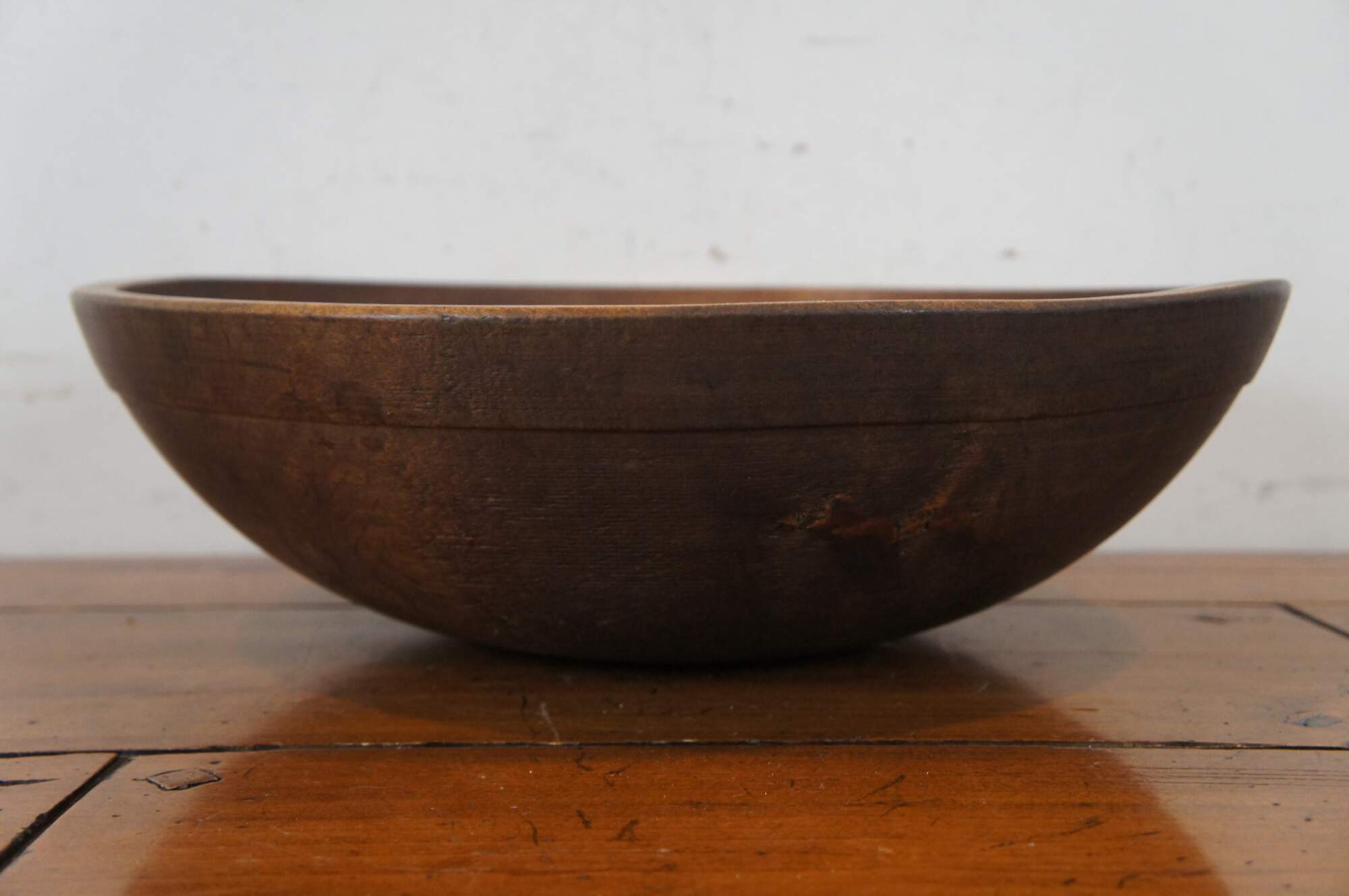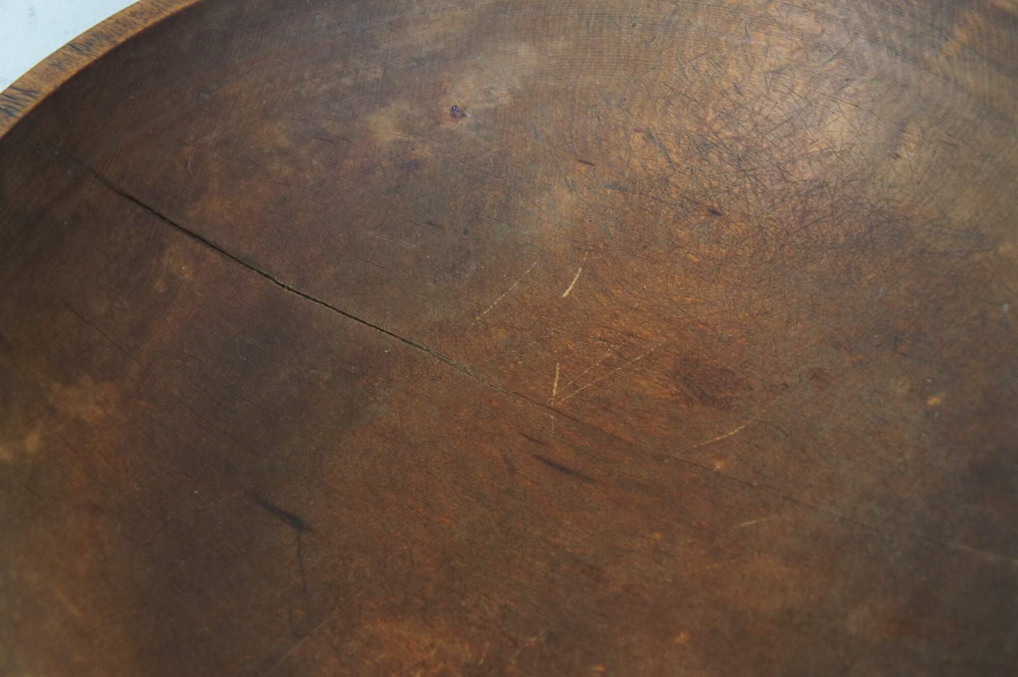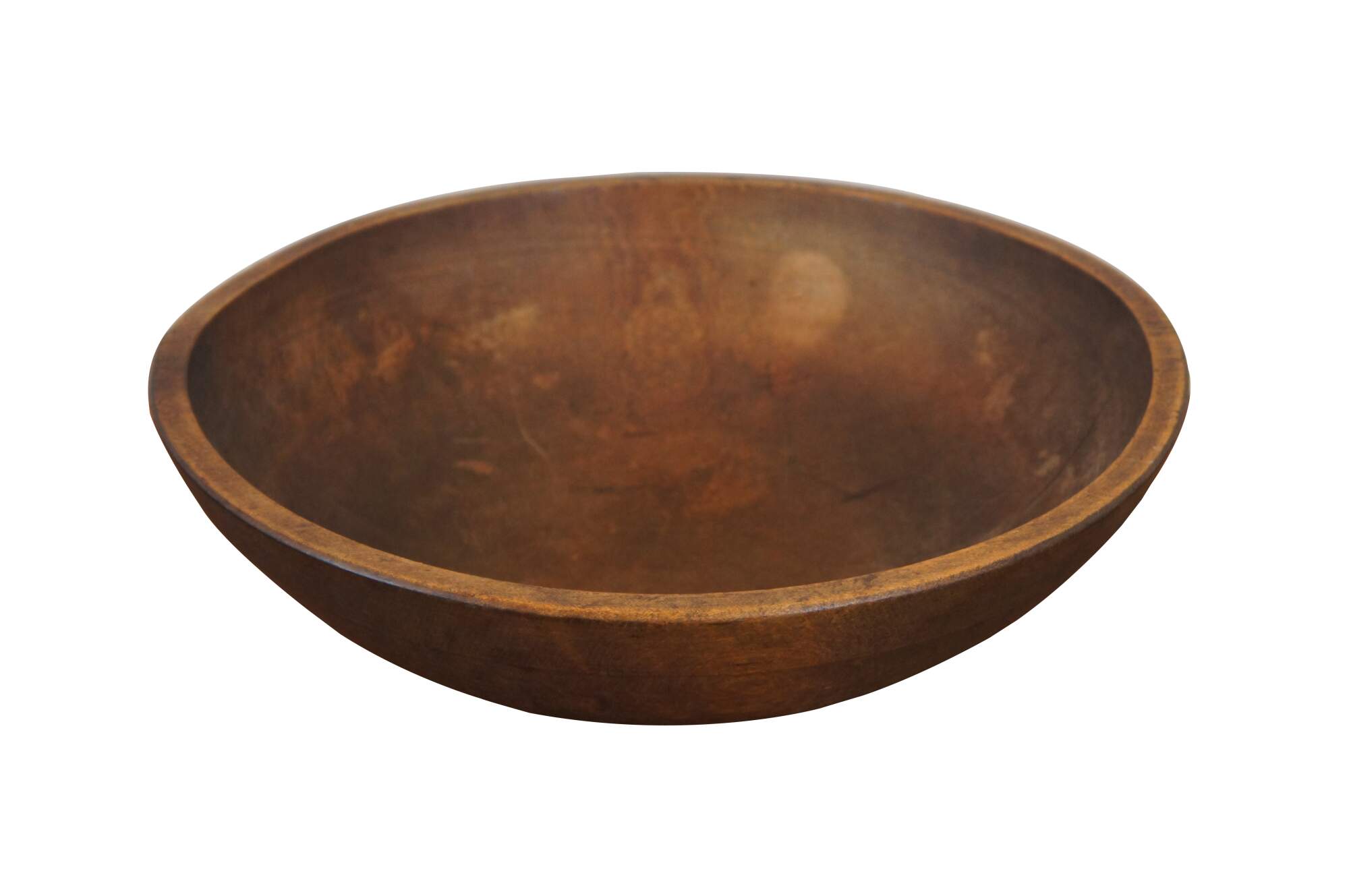 Large antique folk art country farmhouse dough mixing or centerpiece fruit bowl. Made of turned maple wood featuring round form with banded lip.