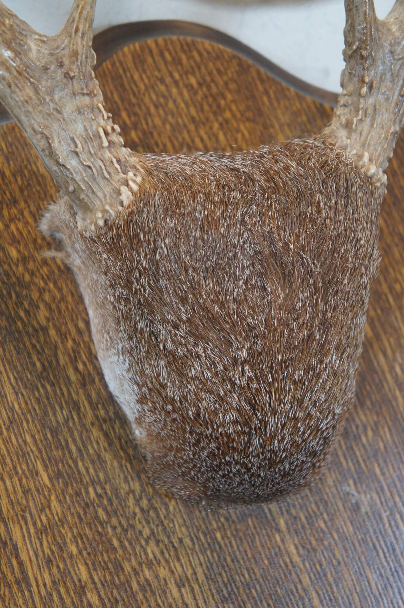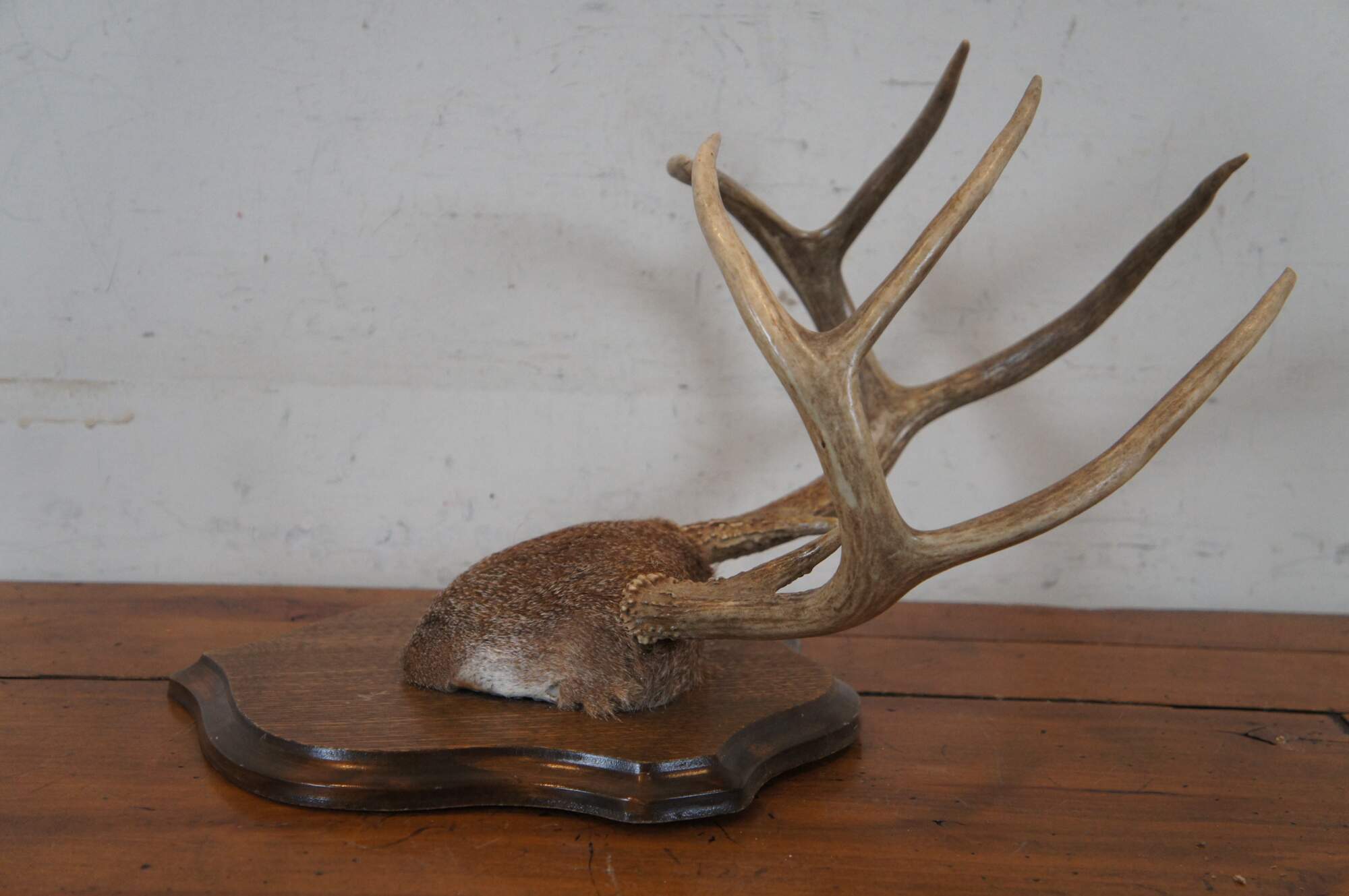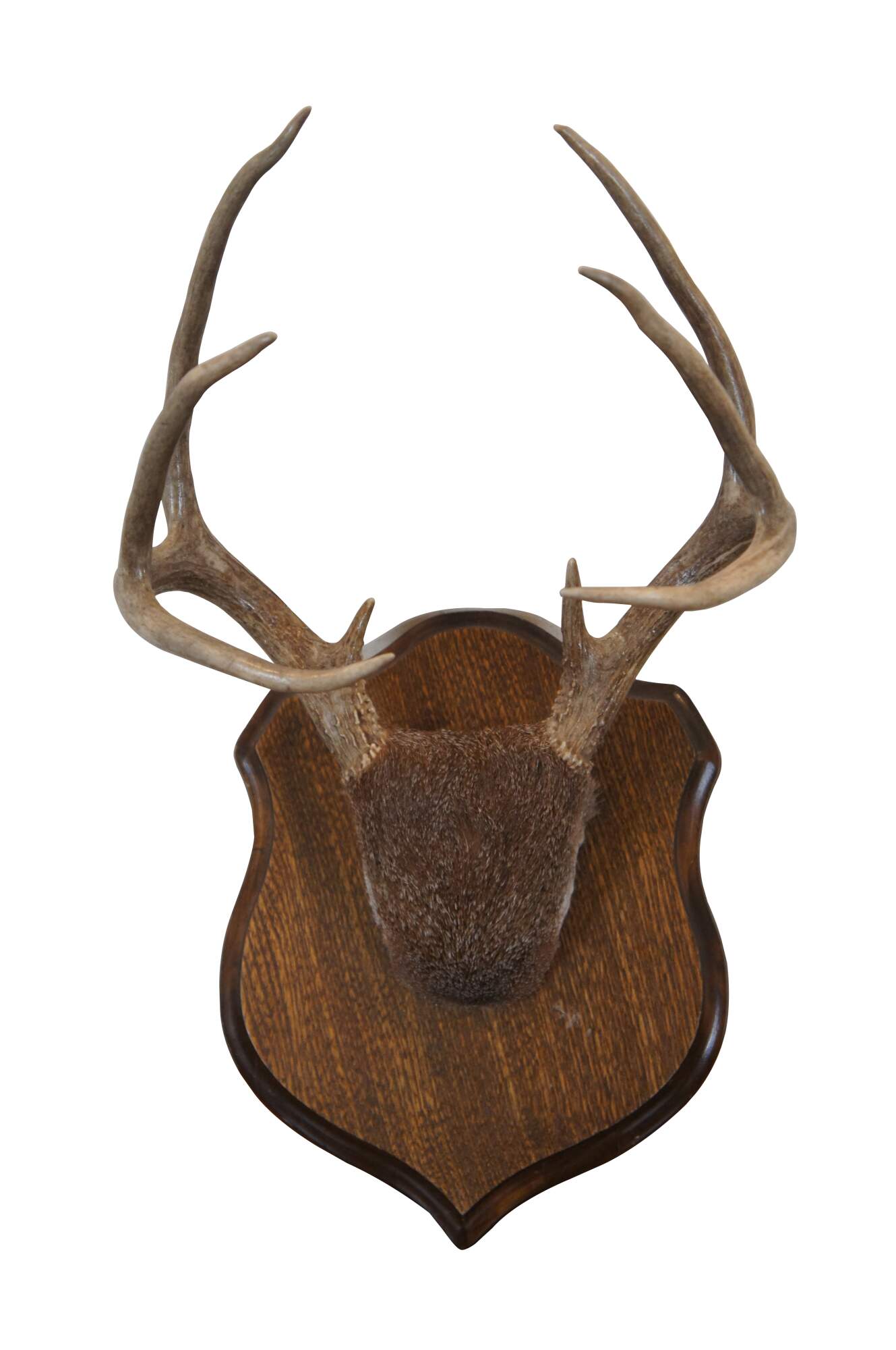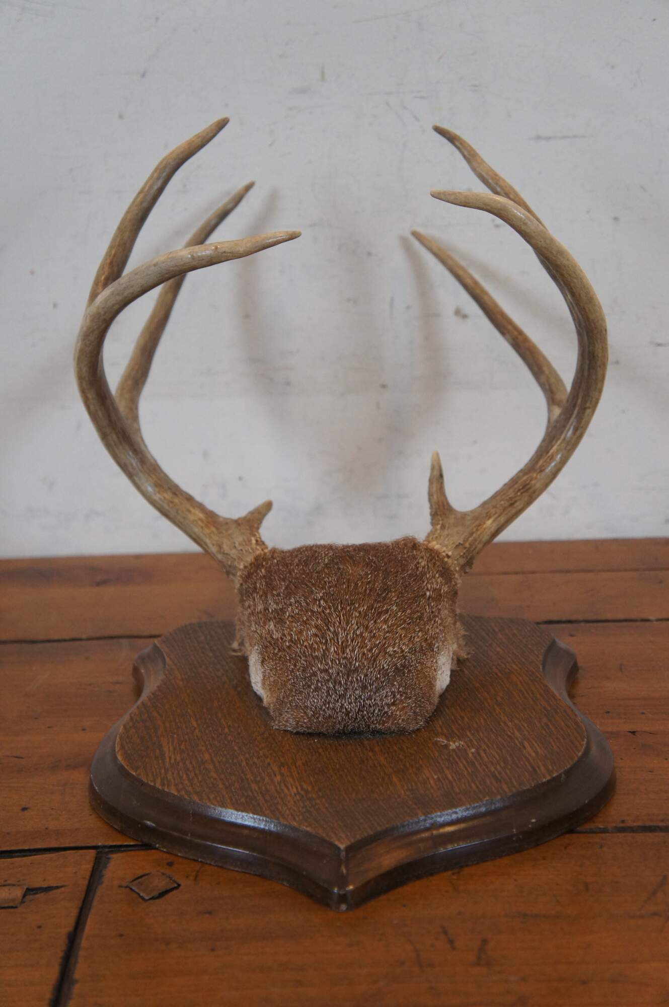Vintage eight point deer antler skull cap trophy taxidermy mounted to a shield plaque.