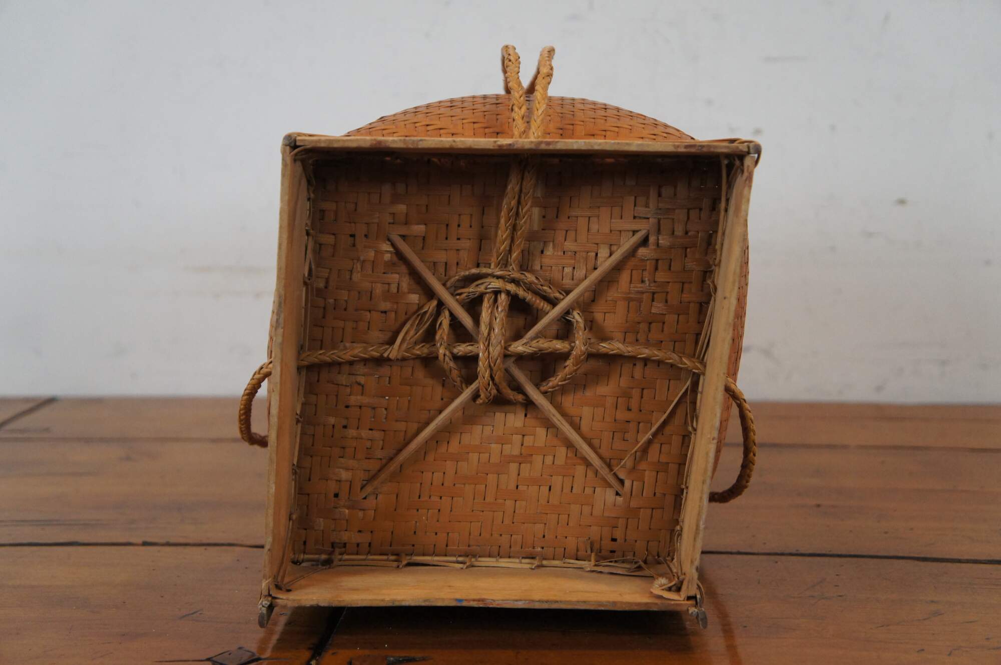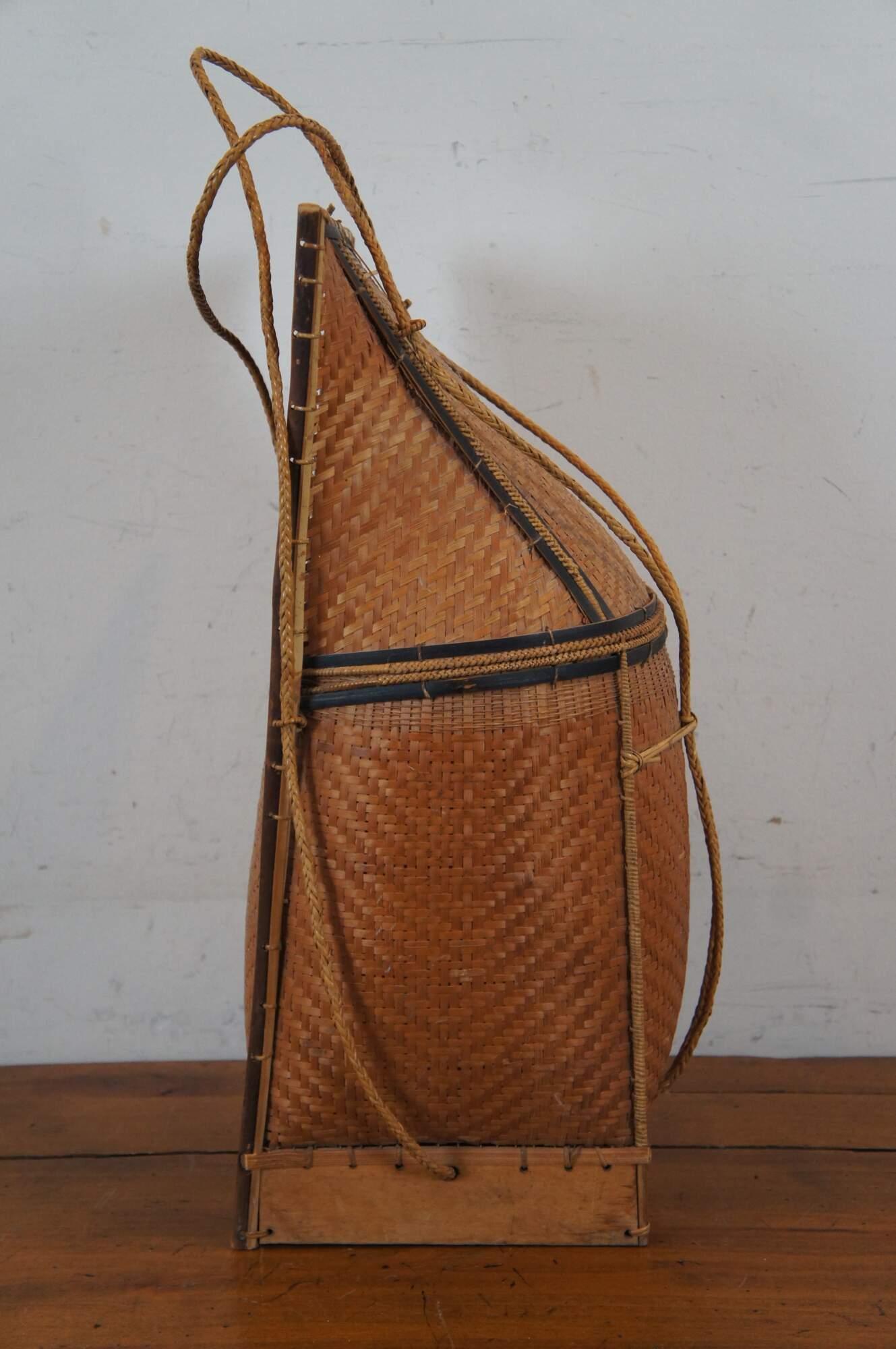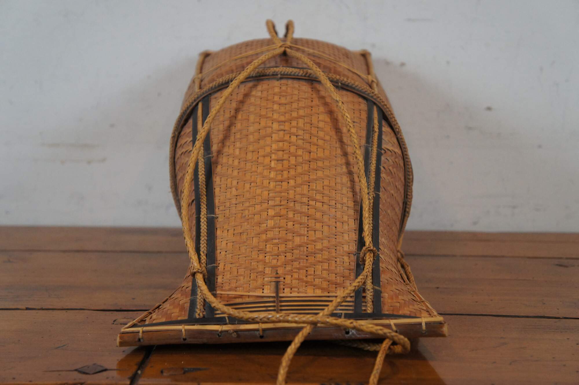 Antique folk art tribal woven wicker and bamboo baby carrying basket from Thailand.