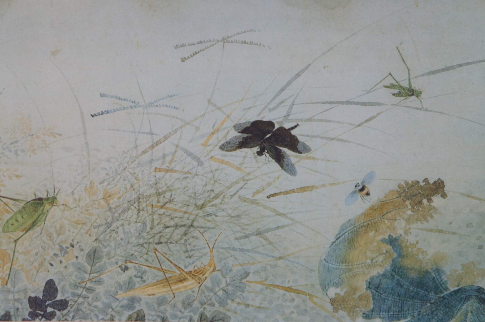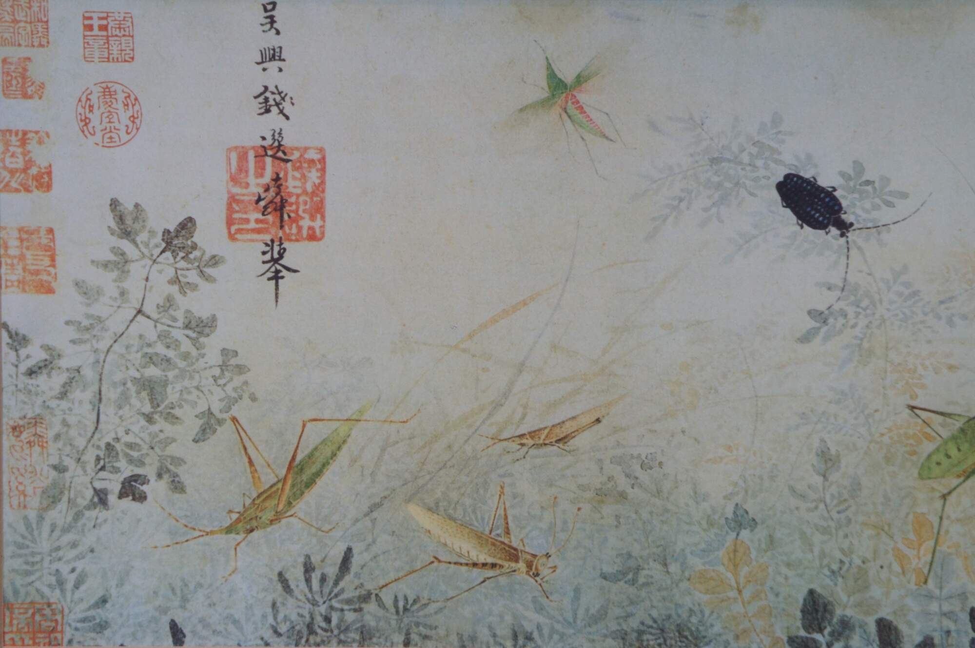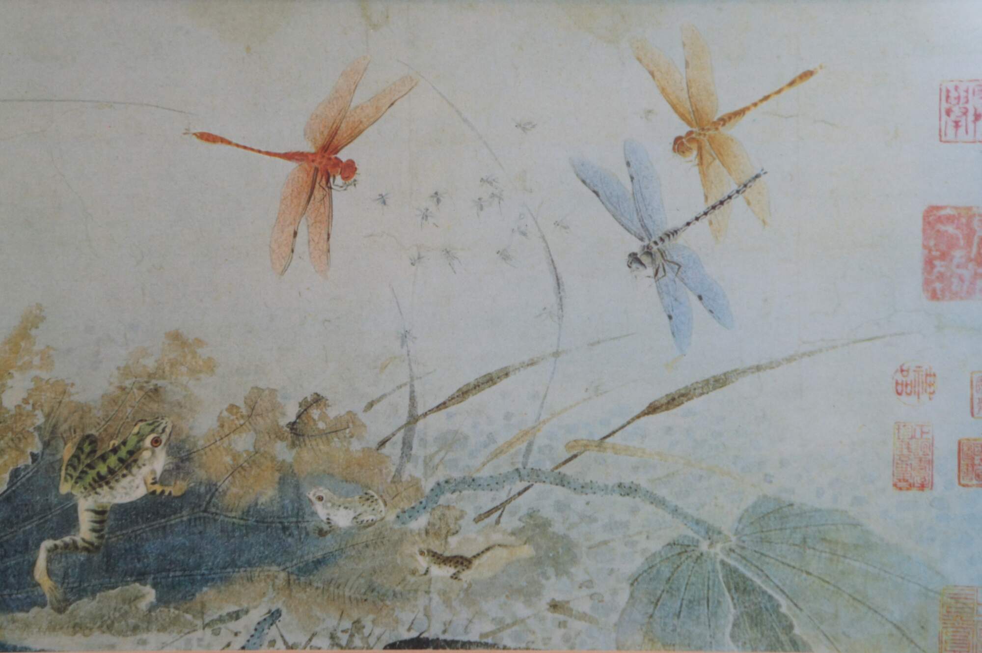 The depiction of the most delicate forms of plant and animal life developed into a specialized form of painting in the 900s known as "bird and flower," which also includes paintings of "insects and grass.” Early Autumn is among the most well-known paintings of this tradition. While this painting bears the name of the great Chinese master of "bird and flower" painting, Qian Xuan (1235–c. 1305), scholars debate whether it was actually painted by Qian Xuan because the method of painting differs from his other known works. It is believed that this scene was painted in the early 1300's. At that time, so called "fur and feather" paintings were especially popular among the Mongol aristocracy. The scene of the waning days of summer with the decaying lotus leaf and dragonflies hovering over stagnant water was probably a veiled criticism of foreign rule. Following the painting is a melancholy poem by retired scholar Ke Jiusi dated 1342: