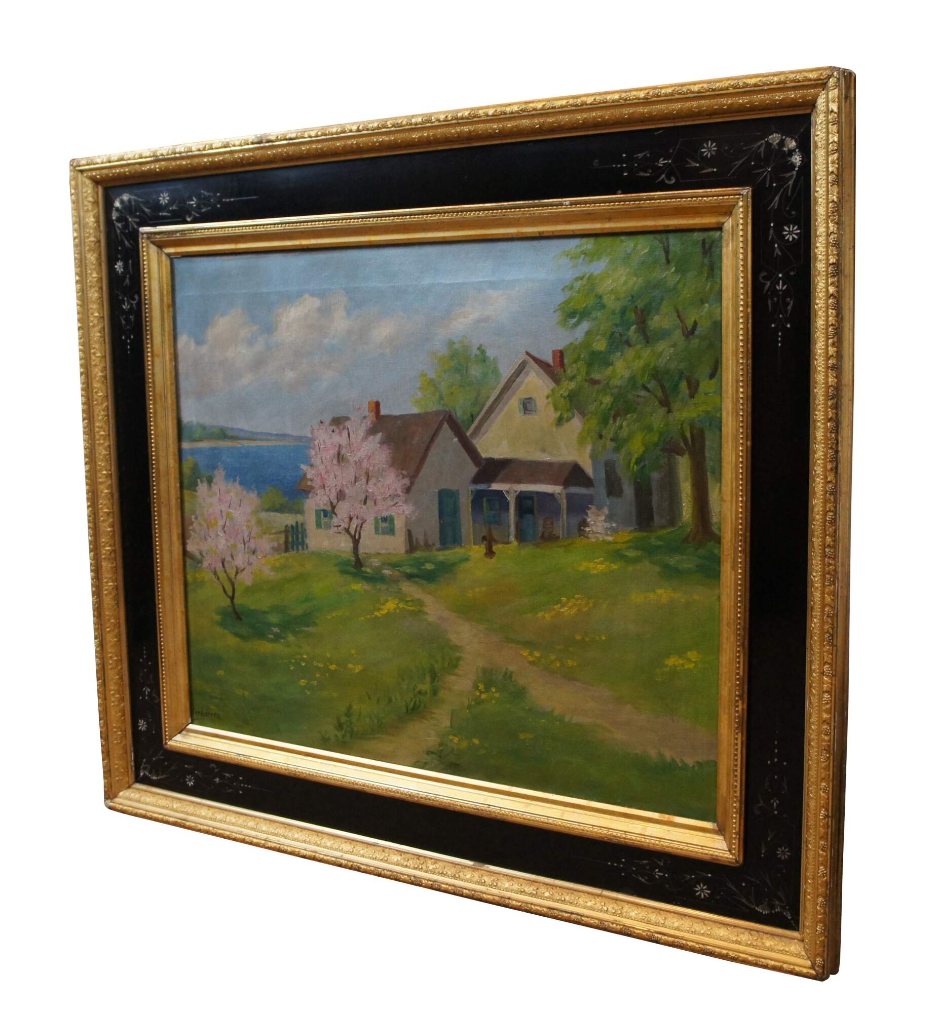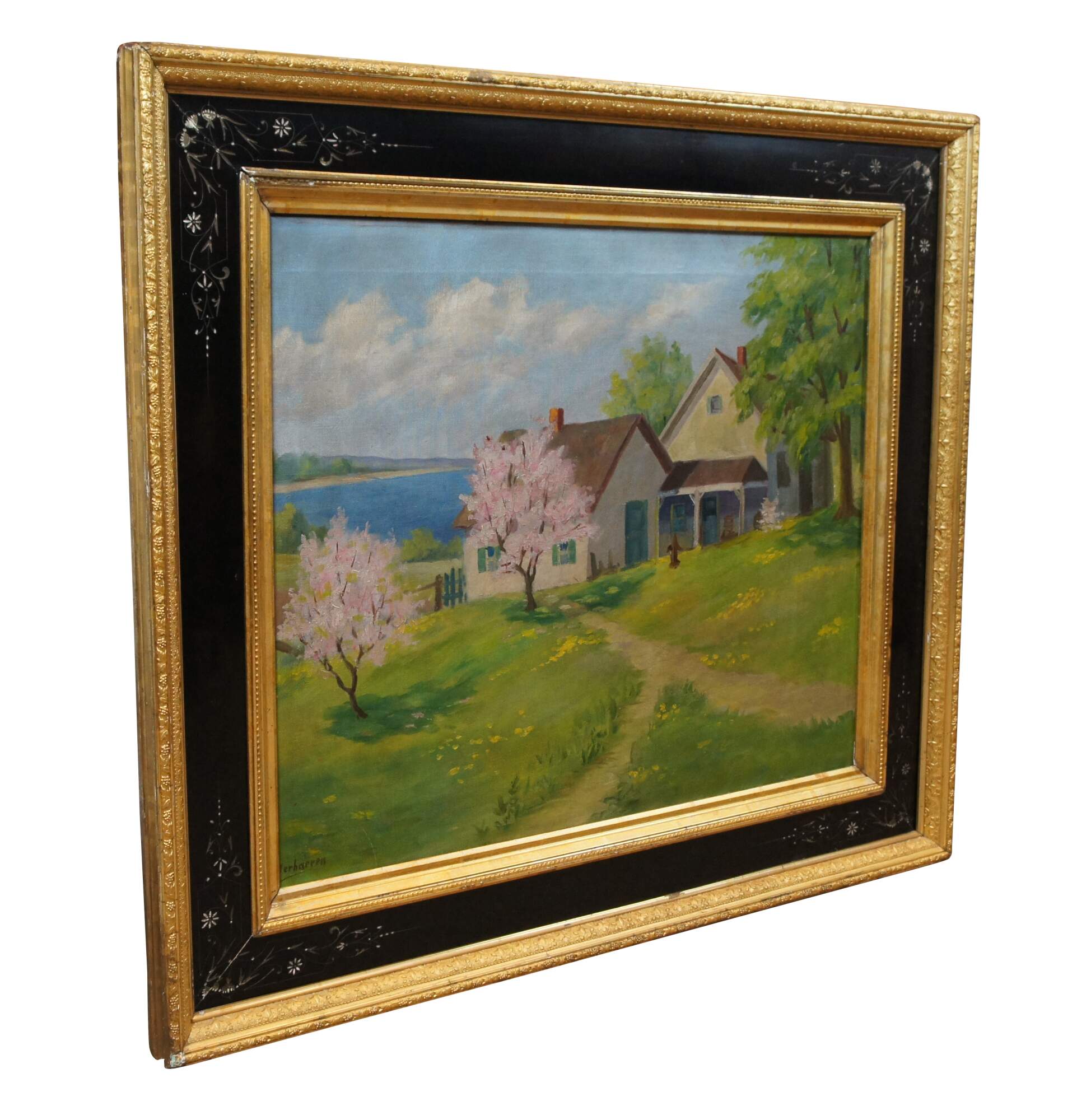 Vintage Carolus Verhaeren oil painting on canvas featuring a coast landscape scene with mountains, water and a house / cottage. Framed Aethetic period gold gilt and ebonized frame.