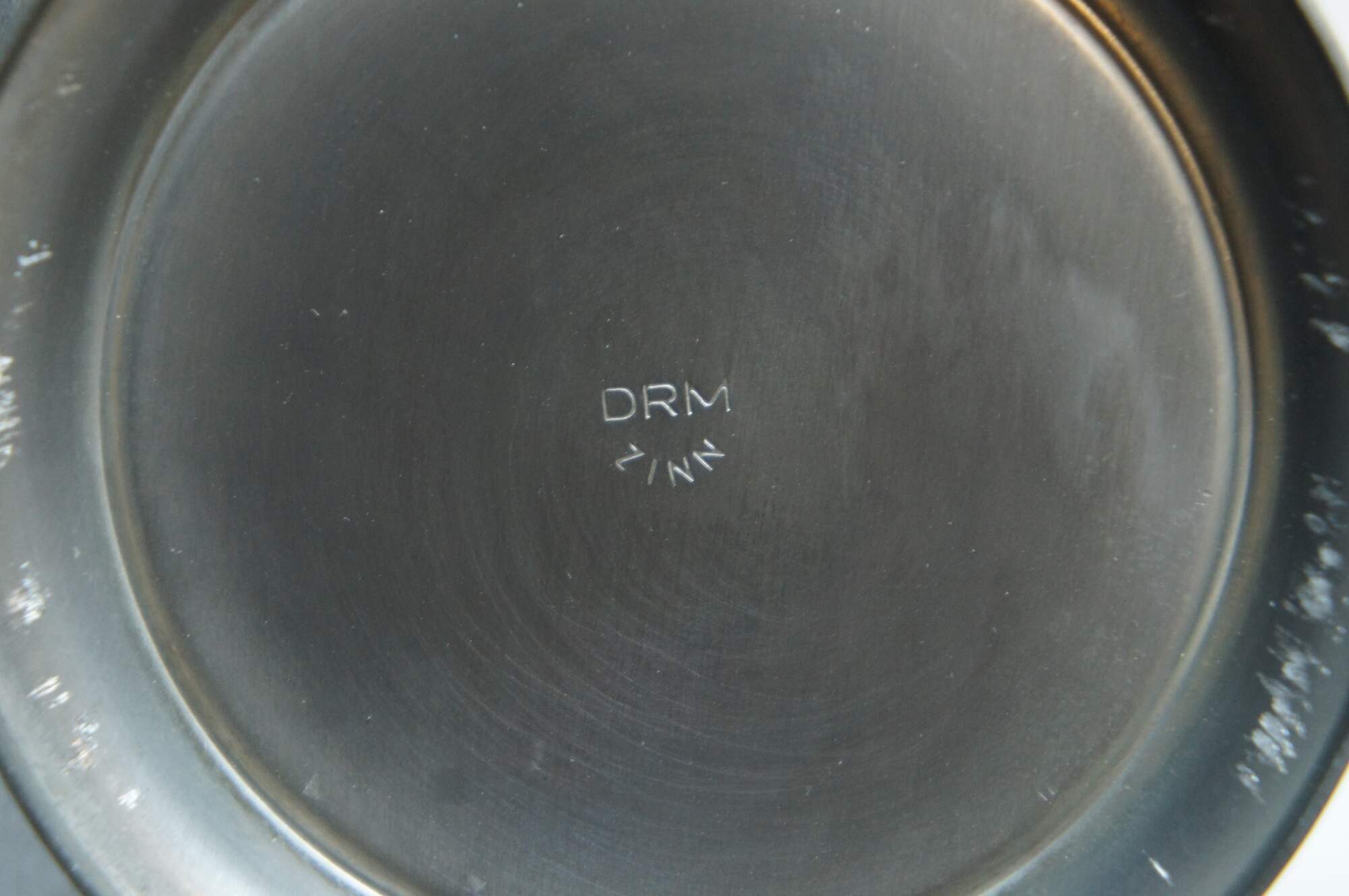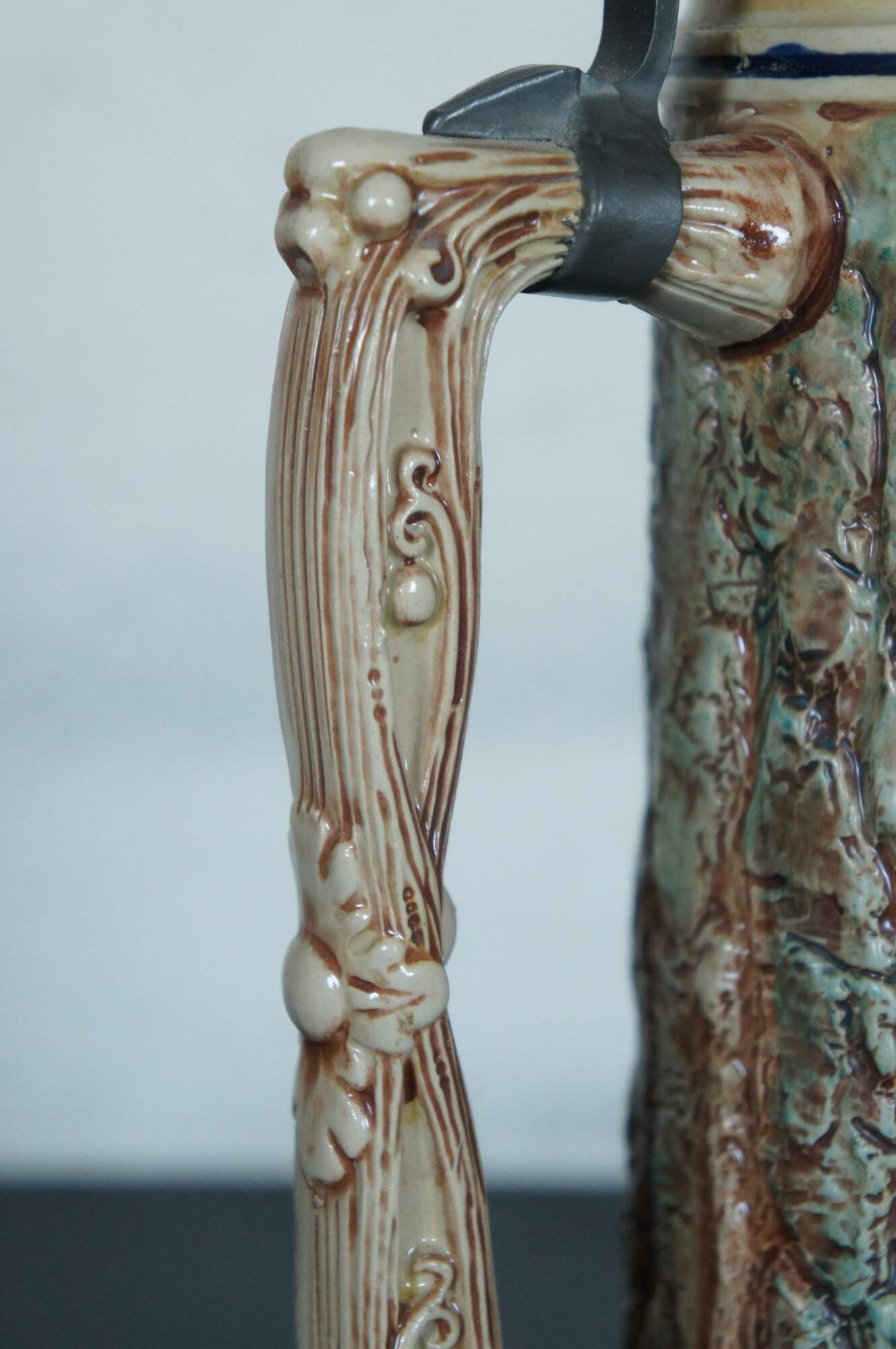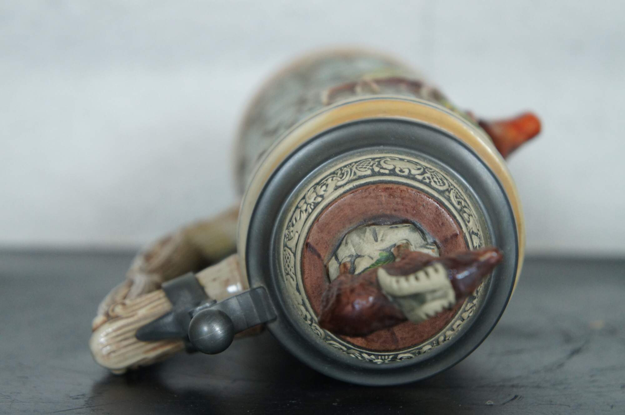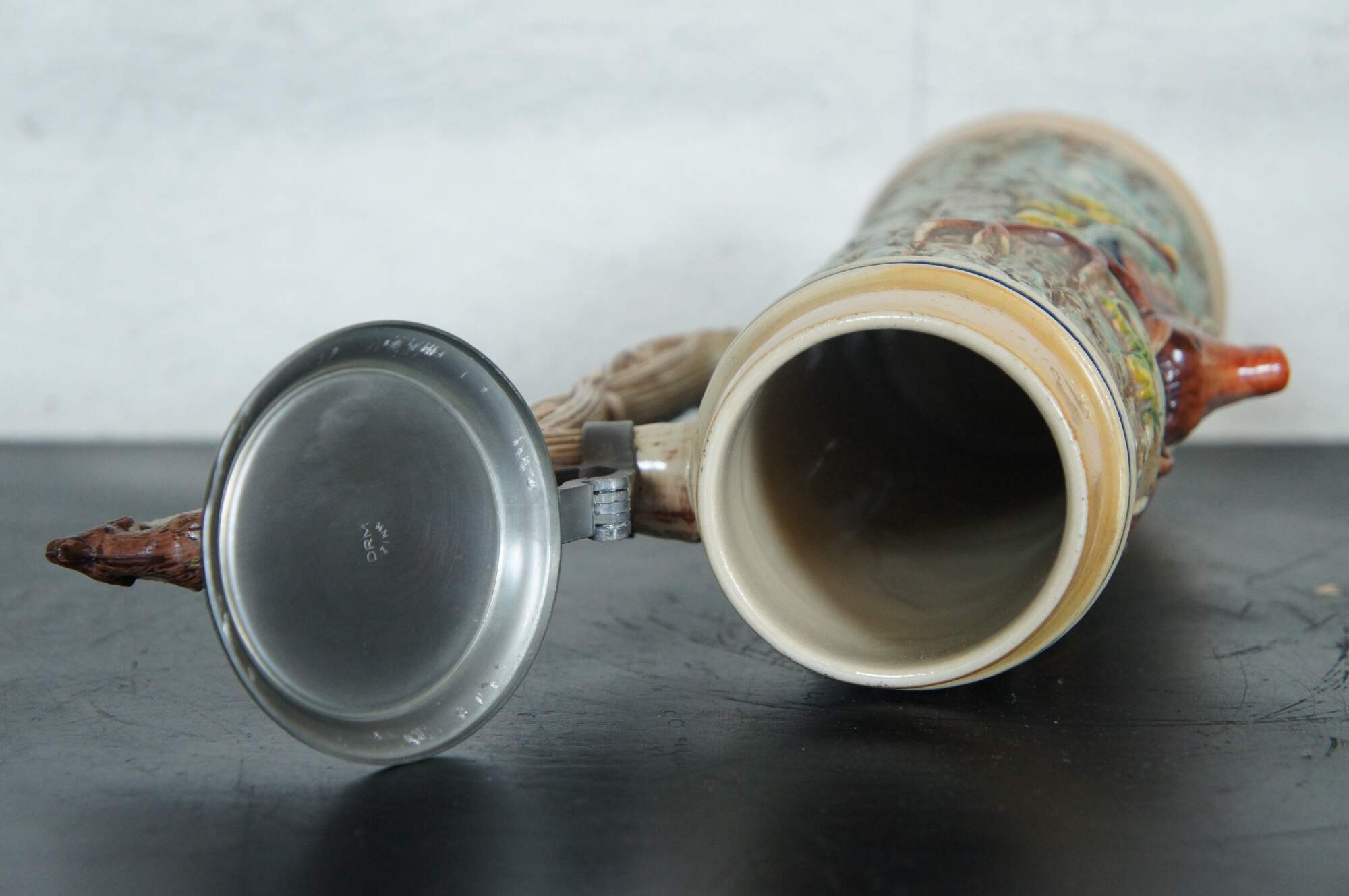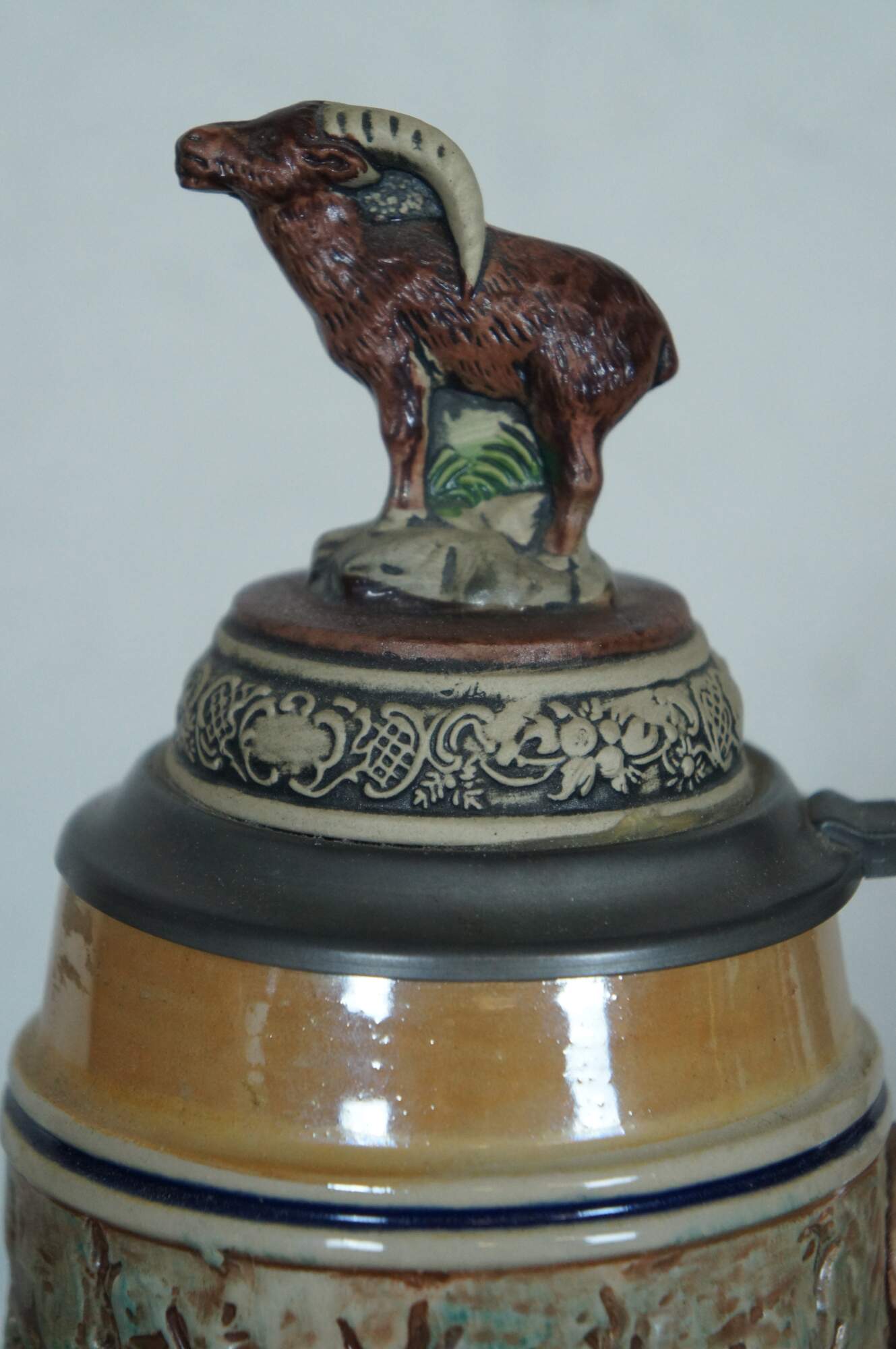 Large Vintage German Gerzit hand made two liter beer stein / lidded (pewter) mug or tankard featuring a stag / deer / ram / goat theme. Text reads: Im Wald und aufder Haide da such ich meine Freude. Translated to